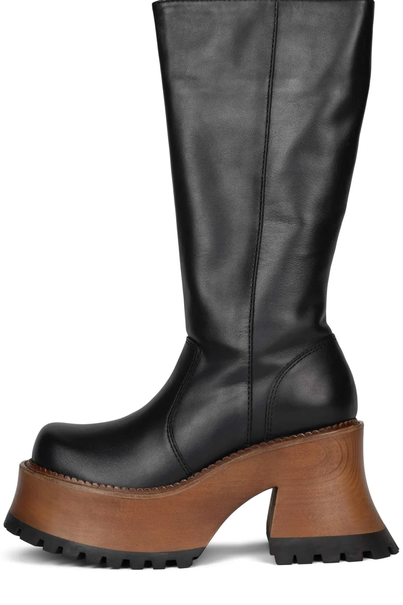 Knee-high platform boot with exaggerated flare weltFits true to sizeMeasurements taken from a size 73.75″ Heel, 2″ Platf…