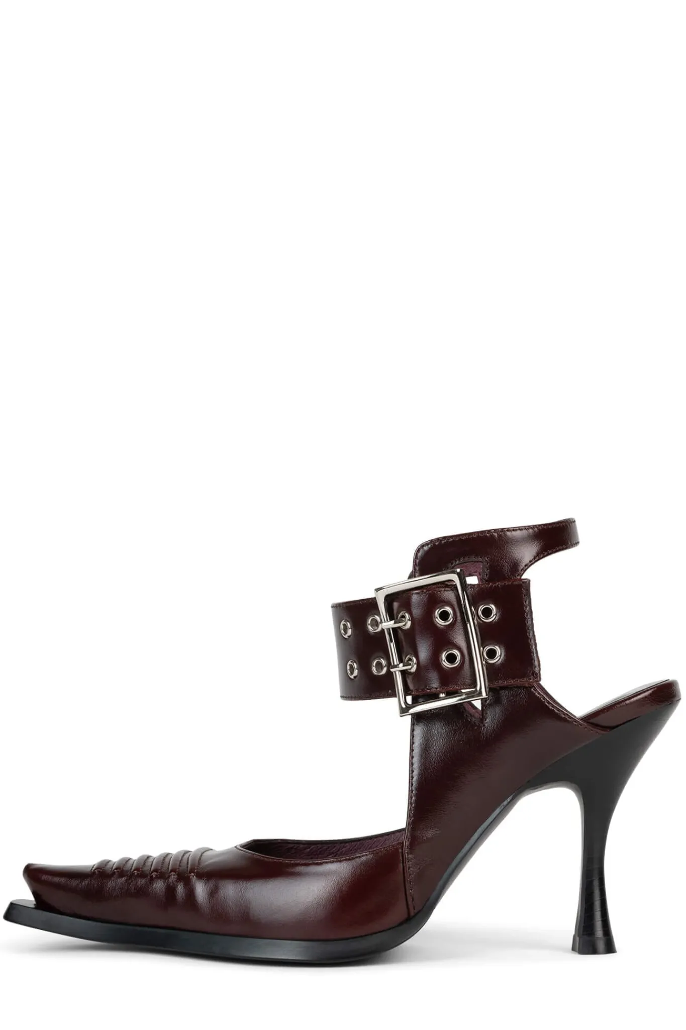 Moto-inspired pump with ankle strapFits true to sizeMeasurements taken from a size 74″ Heel, 0.25″ PlatformLeather Upper…