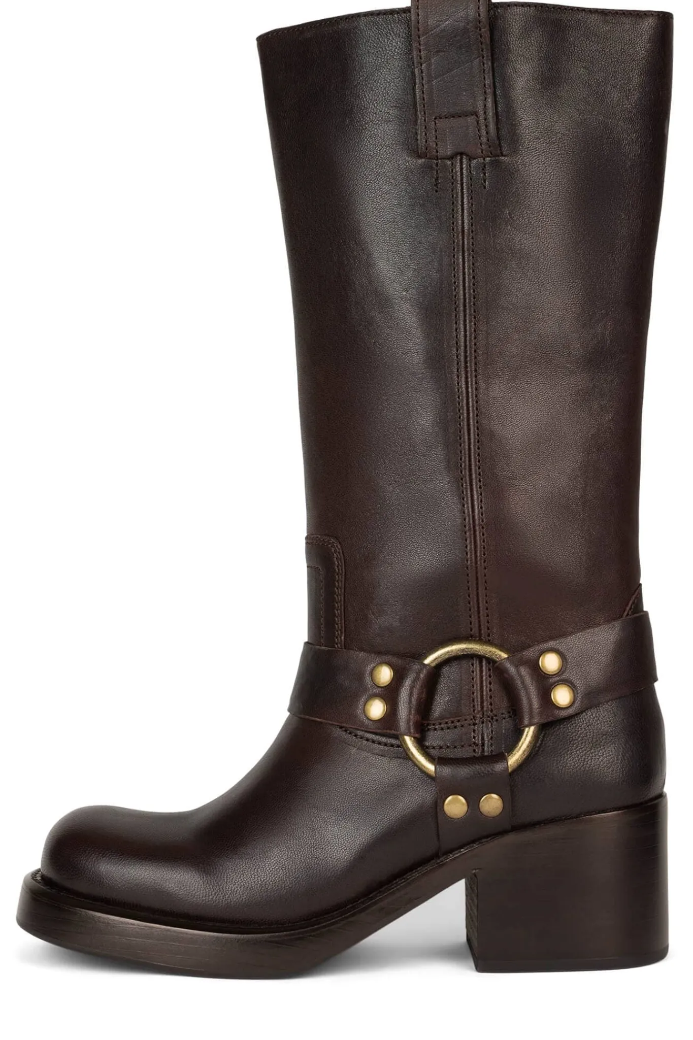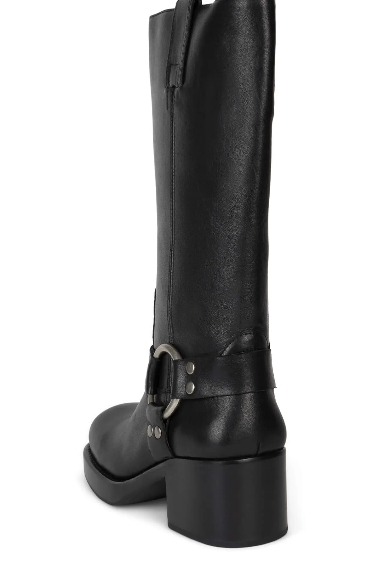 Mid-calf moto boot with western-inspired shaftFits true to sizeMeasurements taken from a size 7 2.5″ Heel, 0.75″Platfor…