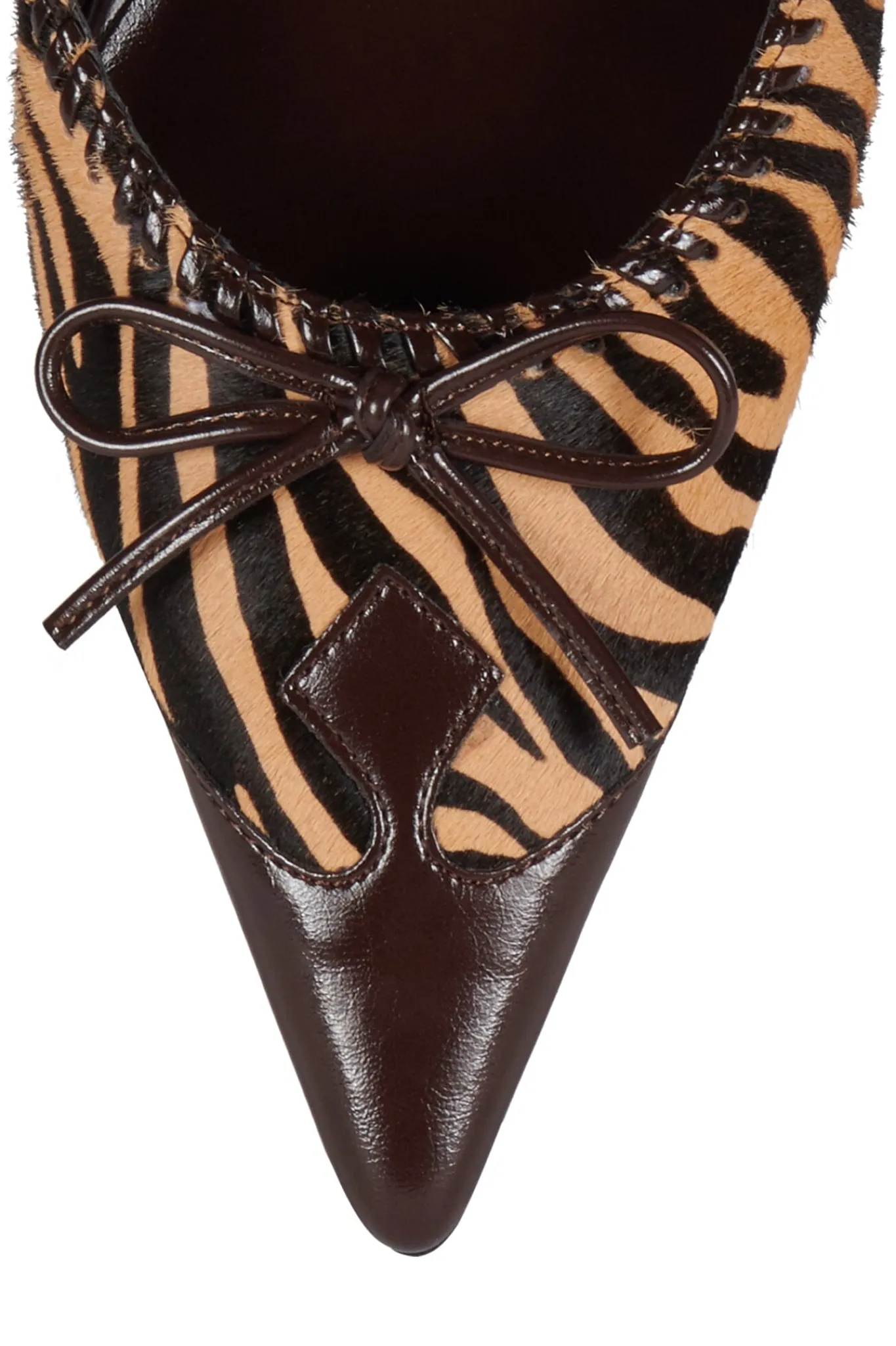 Pointed-toe heeled mule with western motif and calf-hair detail