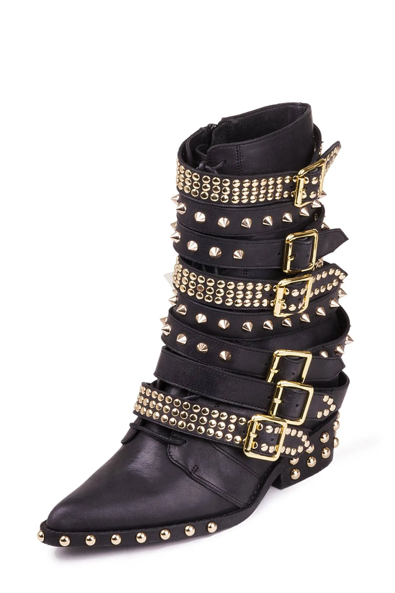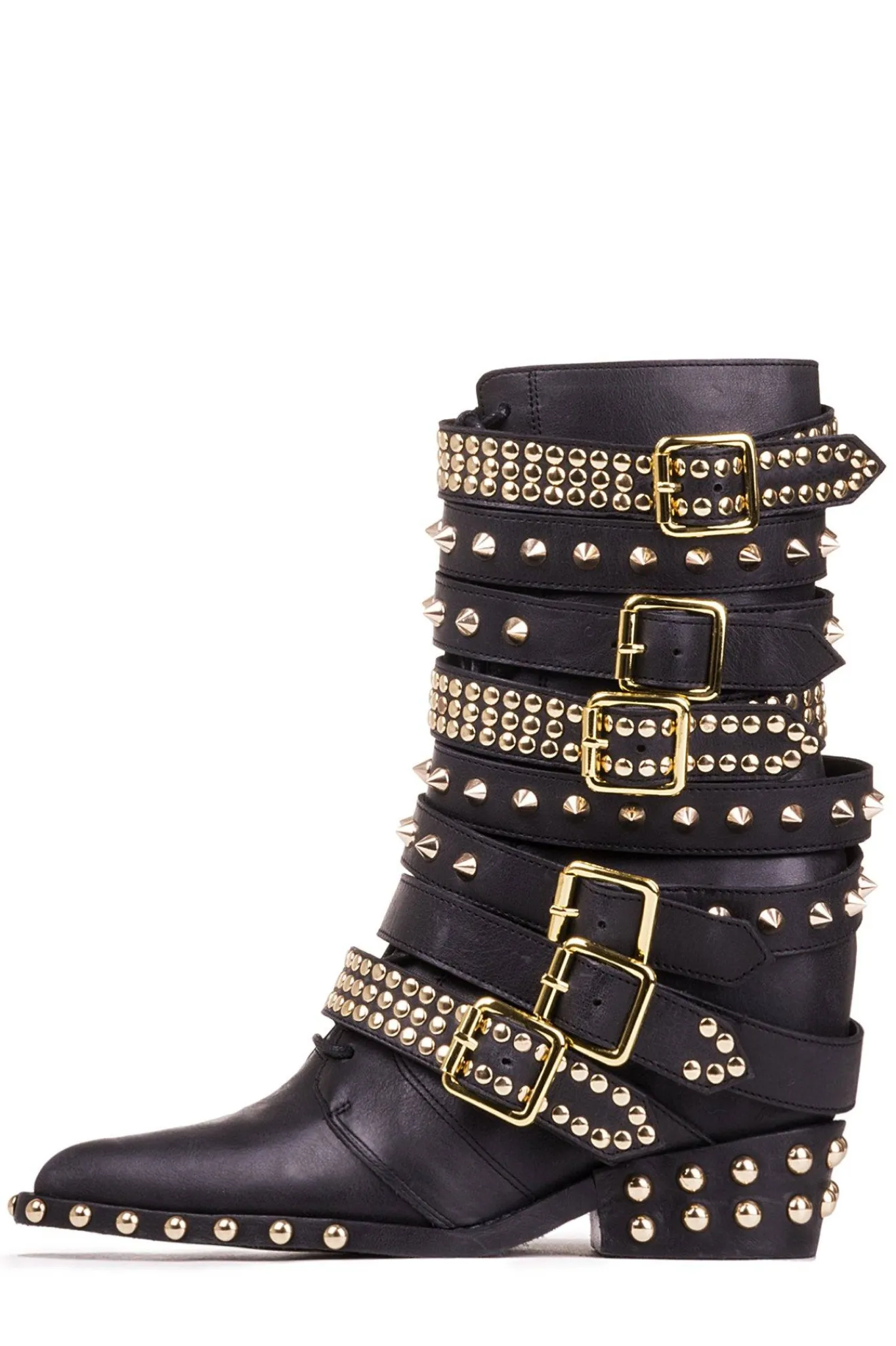 Mid-calf moto boot with studs.