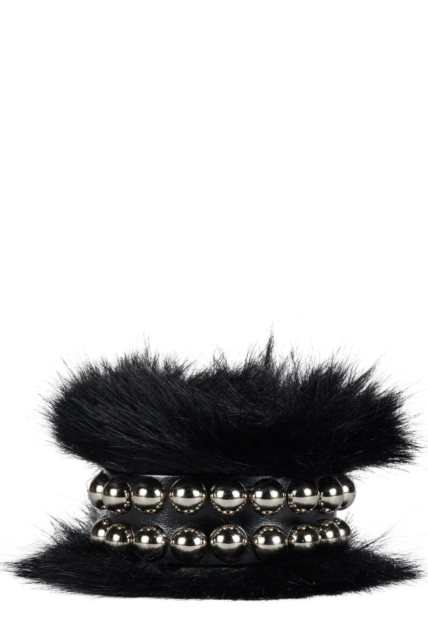 Faux-fur cuff bracelet with studs Fits 8″ circumferenceMade of Faux-fur, Leather & Synthetic materialSnap closure