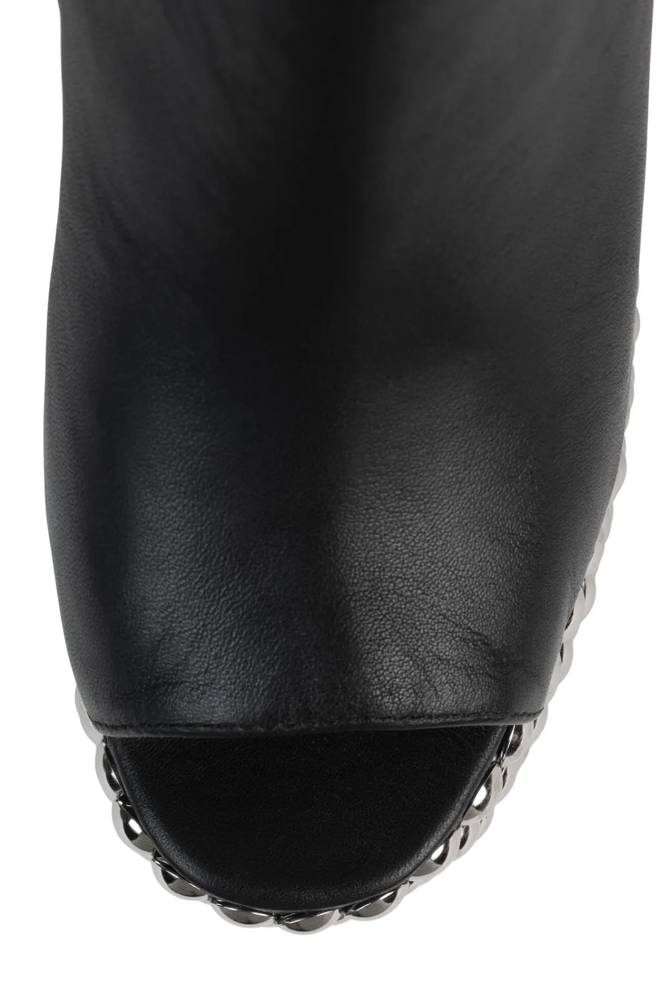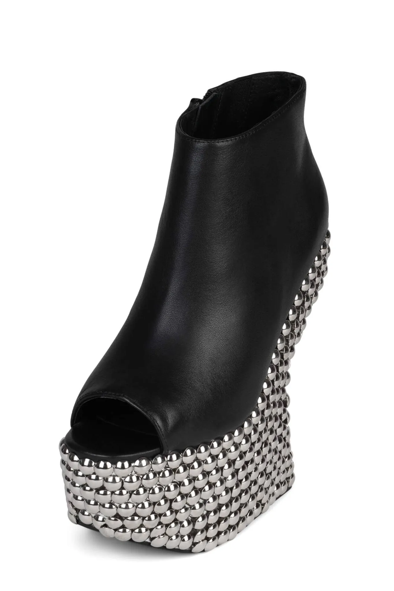 Peep-toe boot with studded sculpted wedge platform Fits true to sizeMeasurements taken from size 7 5.5″ Heel, 2.75″ Pl…