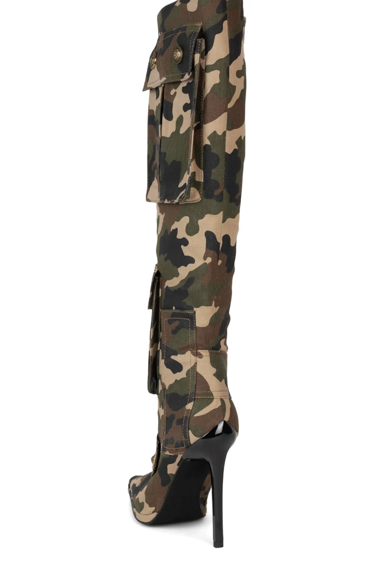 Cargo stiletto knee-high boots with pocketsFits true to sizeMeasurements taken from a size 7 4.25″ Heel, .25″ Platform1…