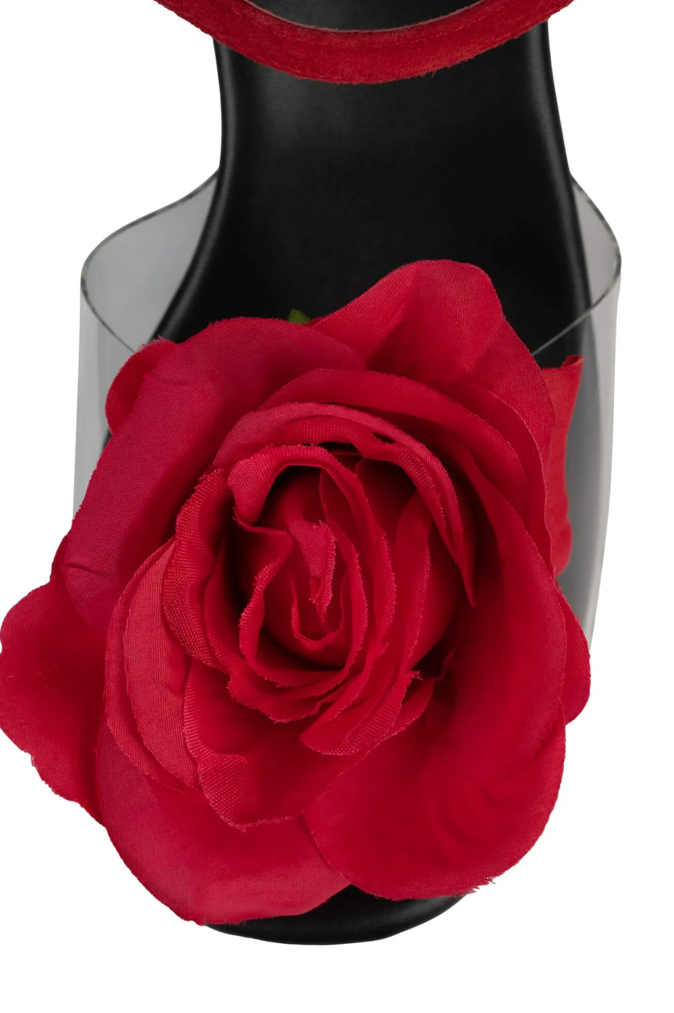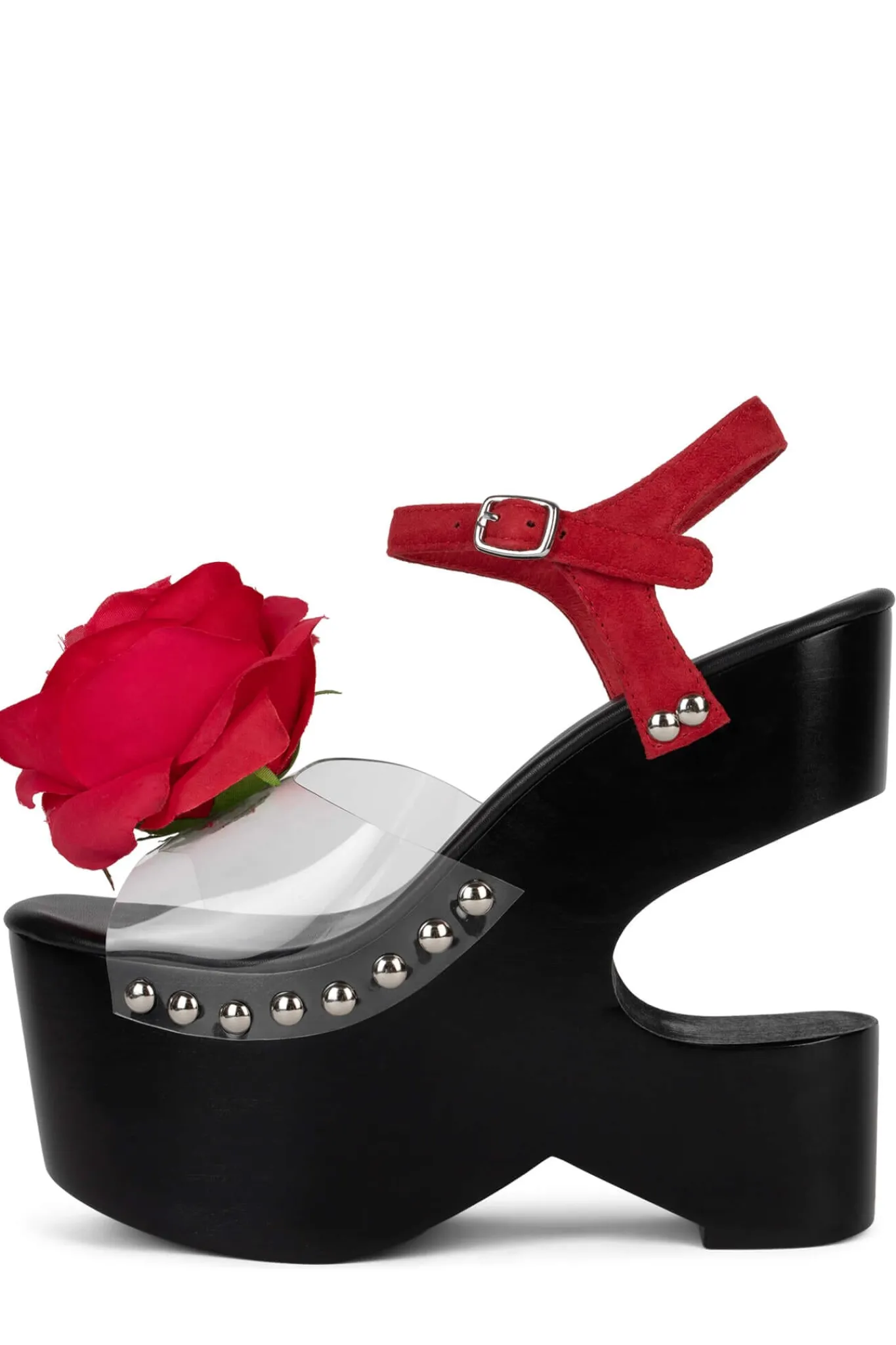Sculpted wedge platform sandal with clear vinyl strap and rose detail