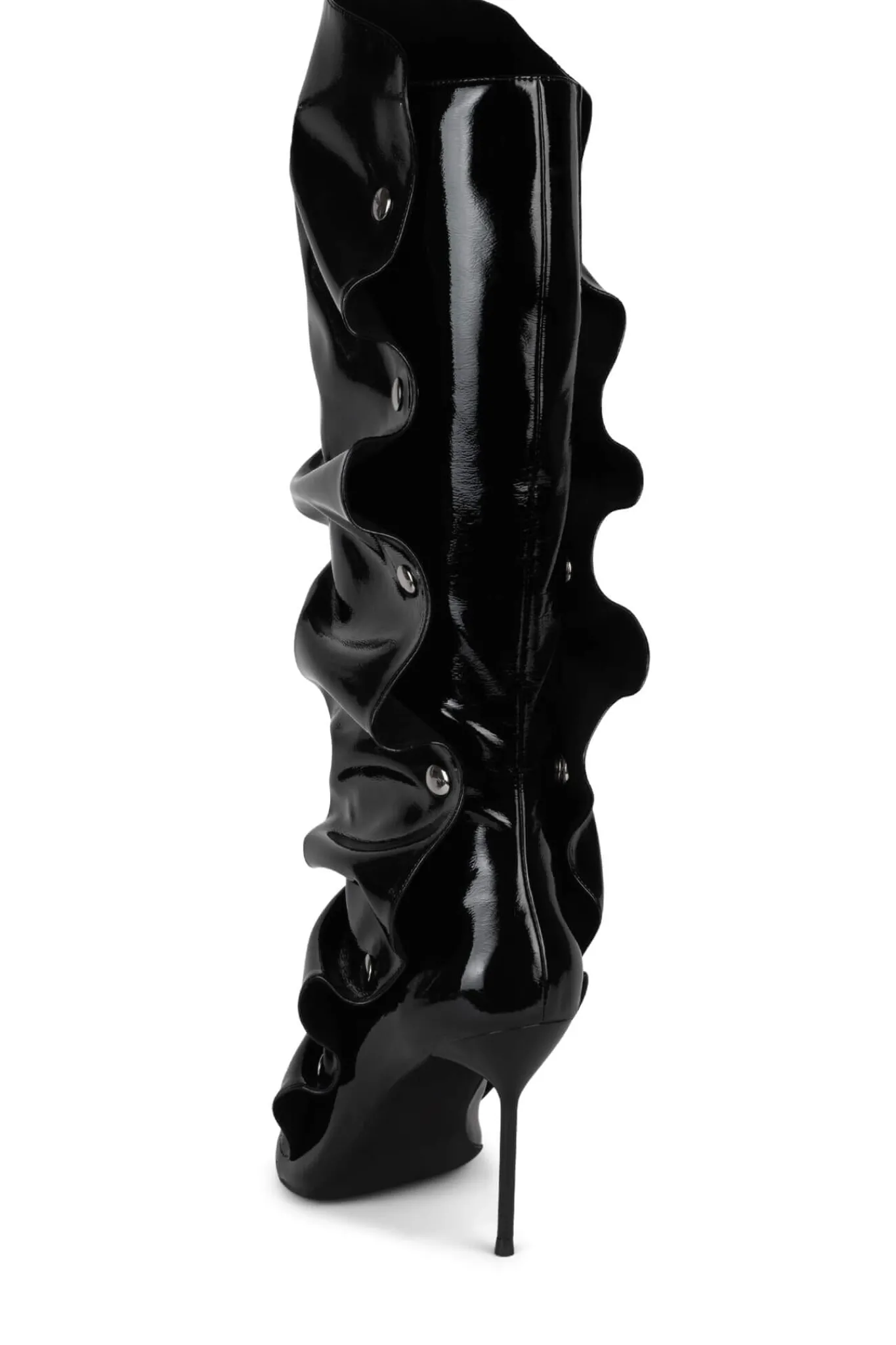 Slouched knee-high open-toe stiletto boot Fits true to sizeMeasurements taken from size 7 3.5″ Heel, 0.25″ Platform13″…