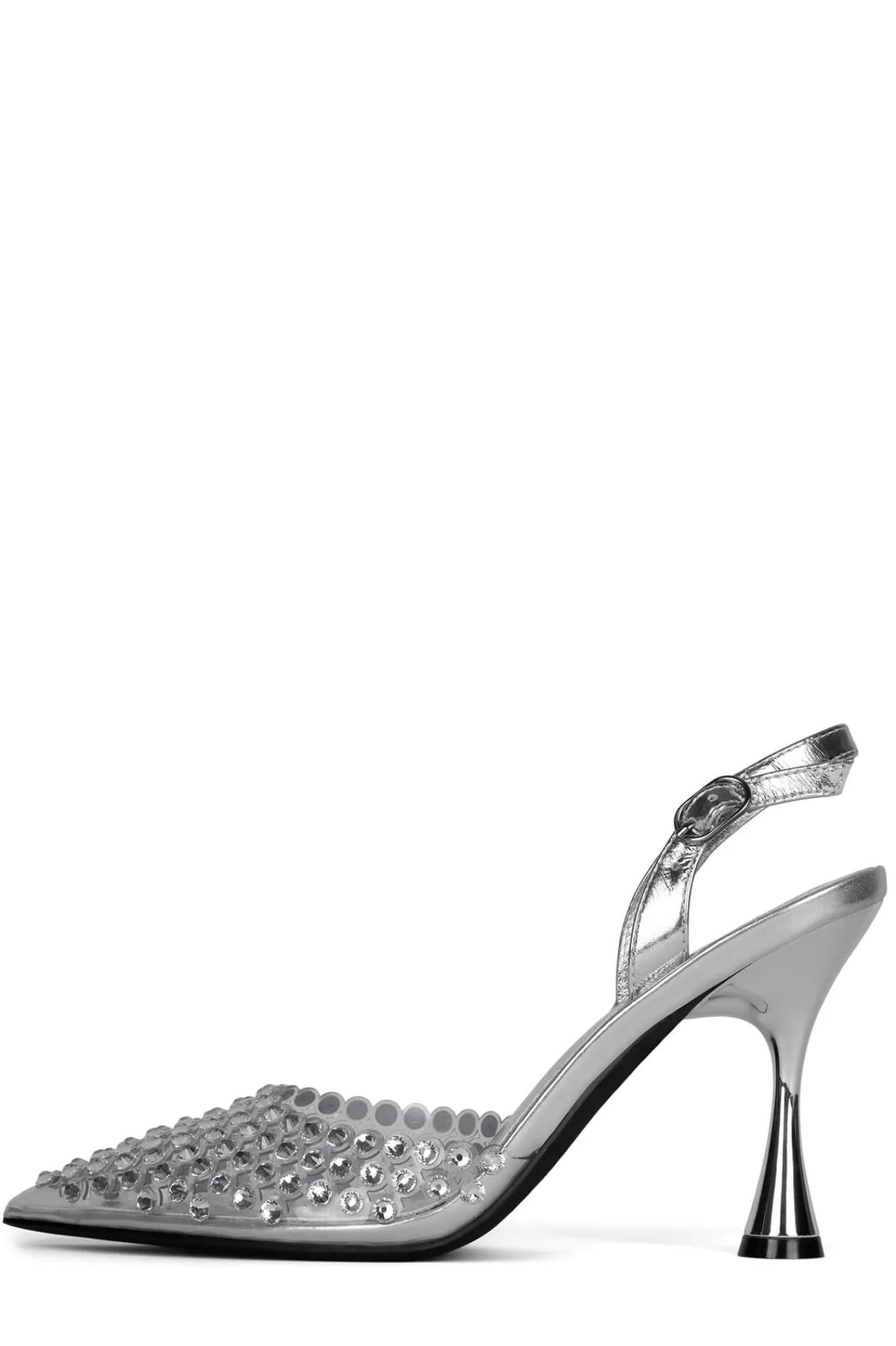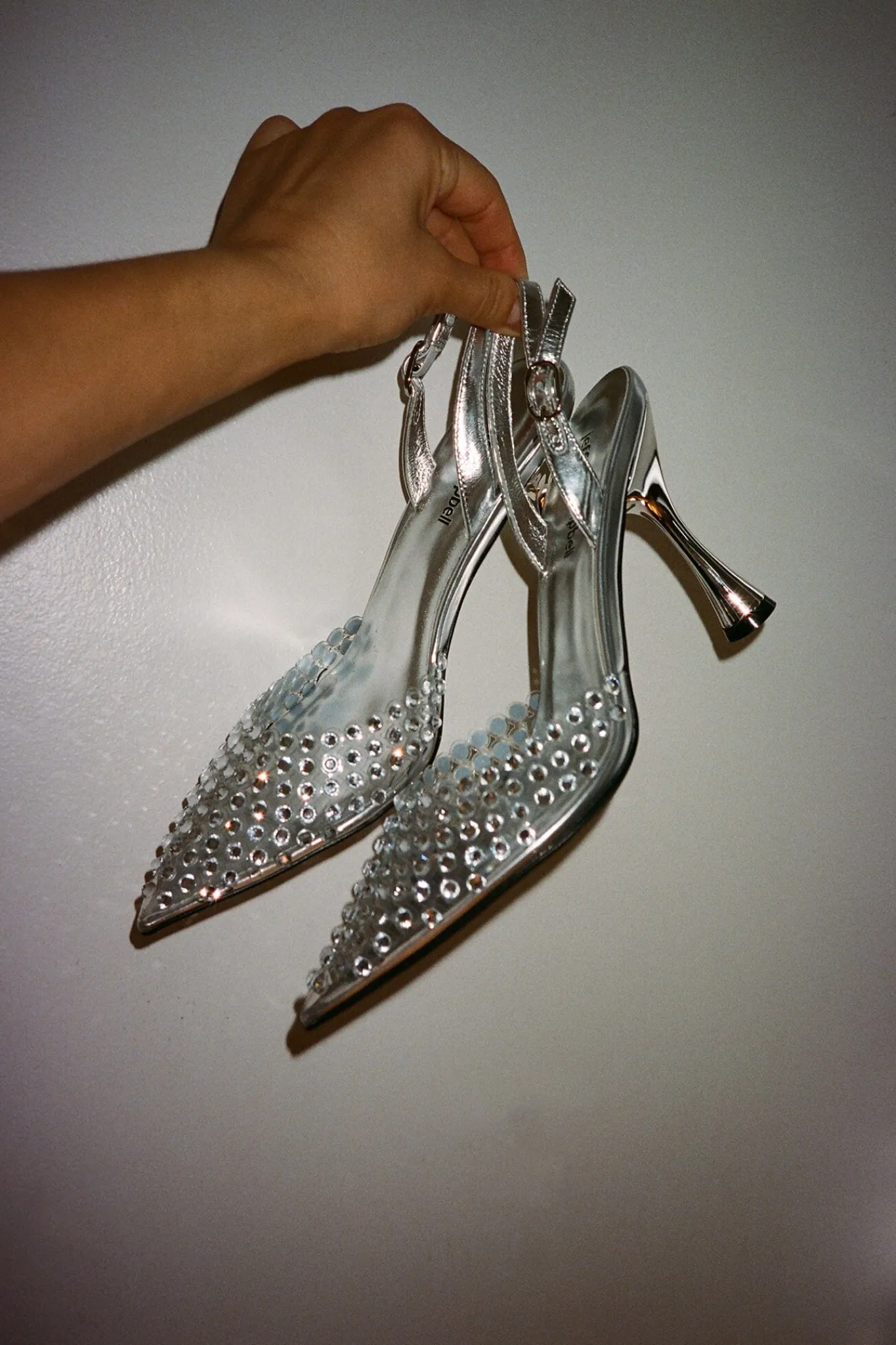 Embellished pointed-toe slingback mule with trumpet heelFits half a size small. Order next half size up. Measurements t…