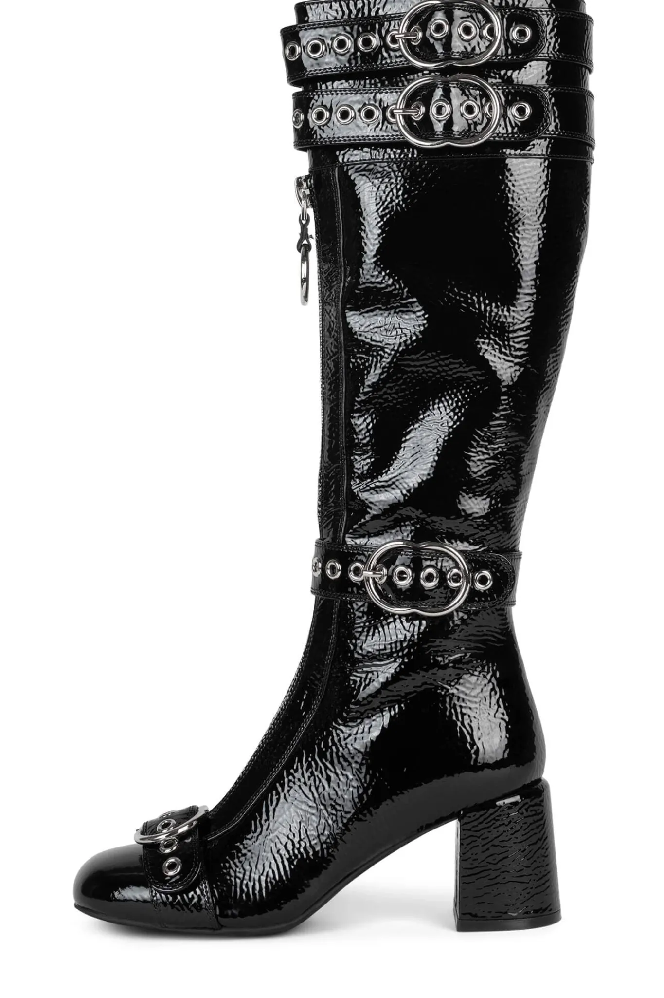 Block heel knee-high boot mod boot with buckle and zipper detail