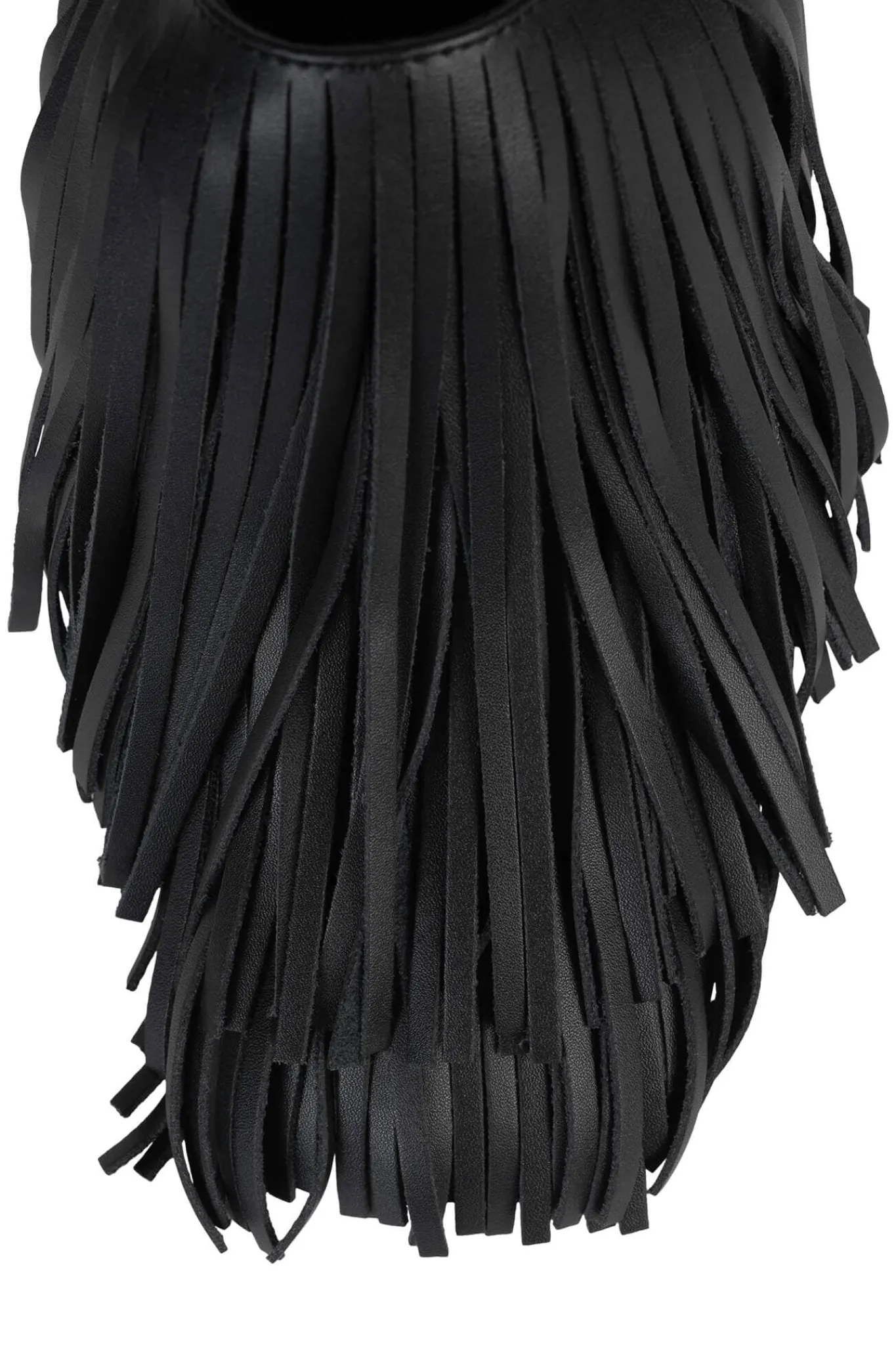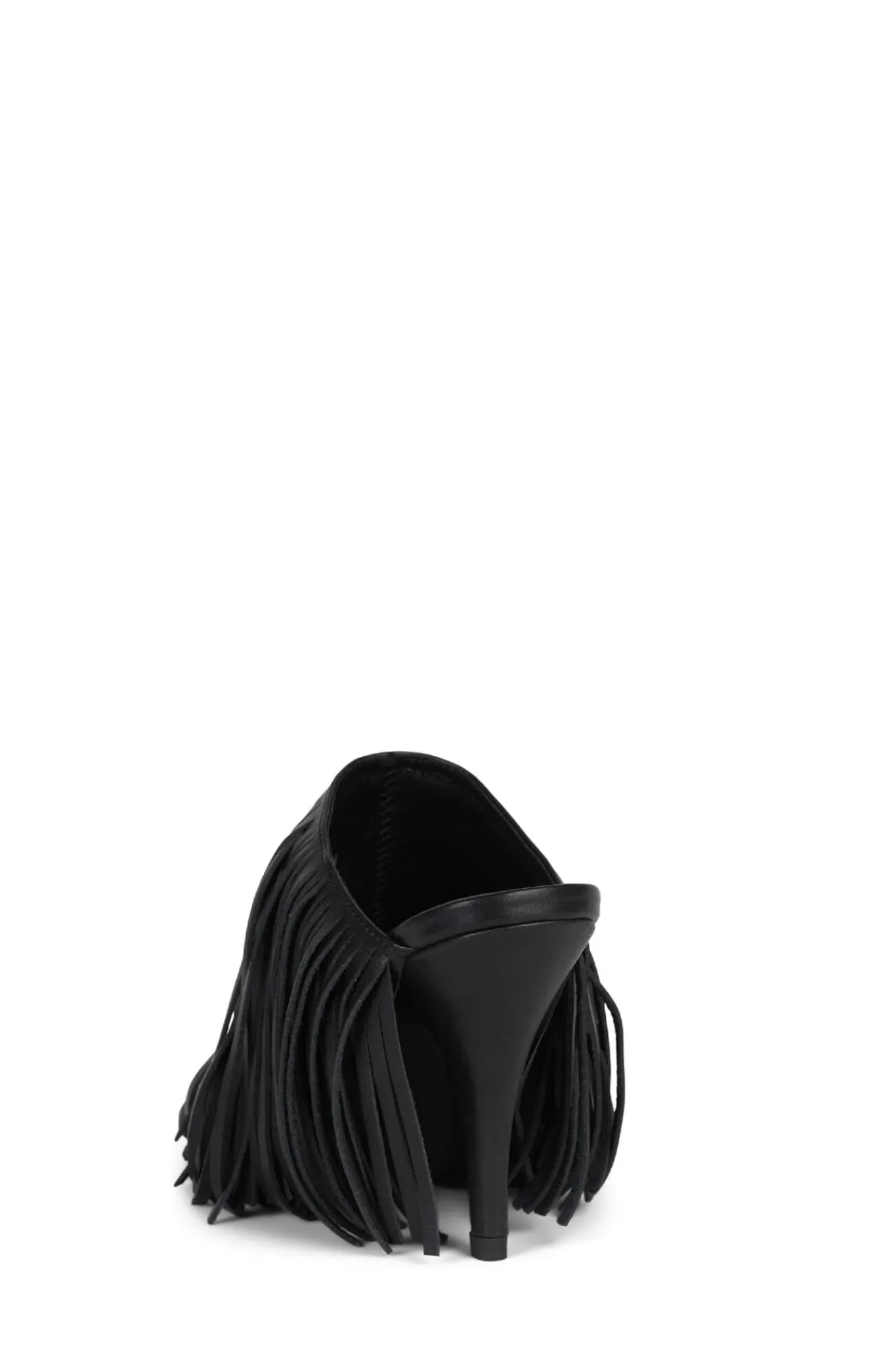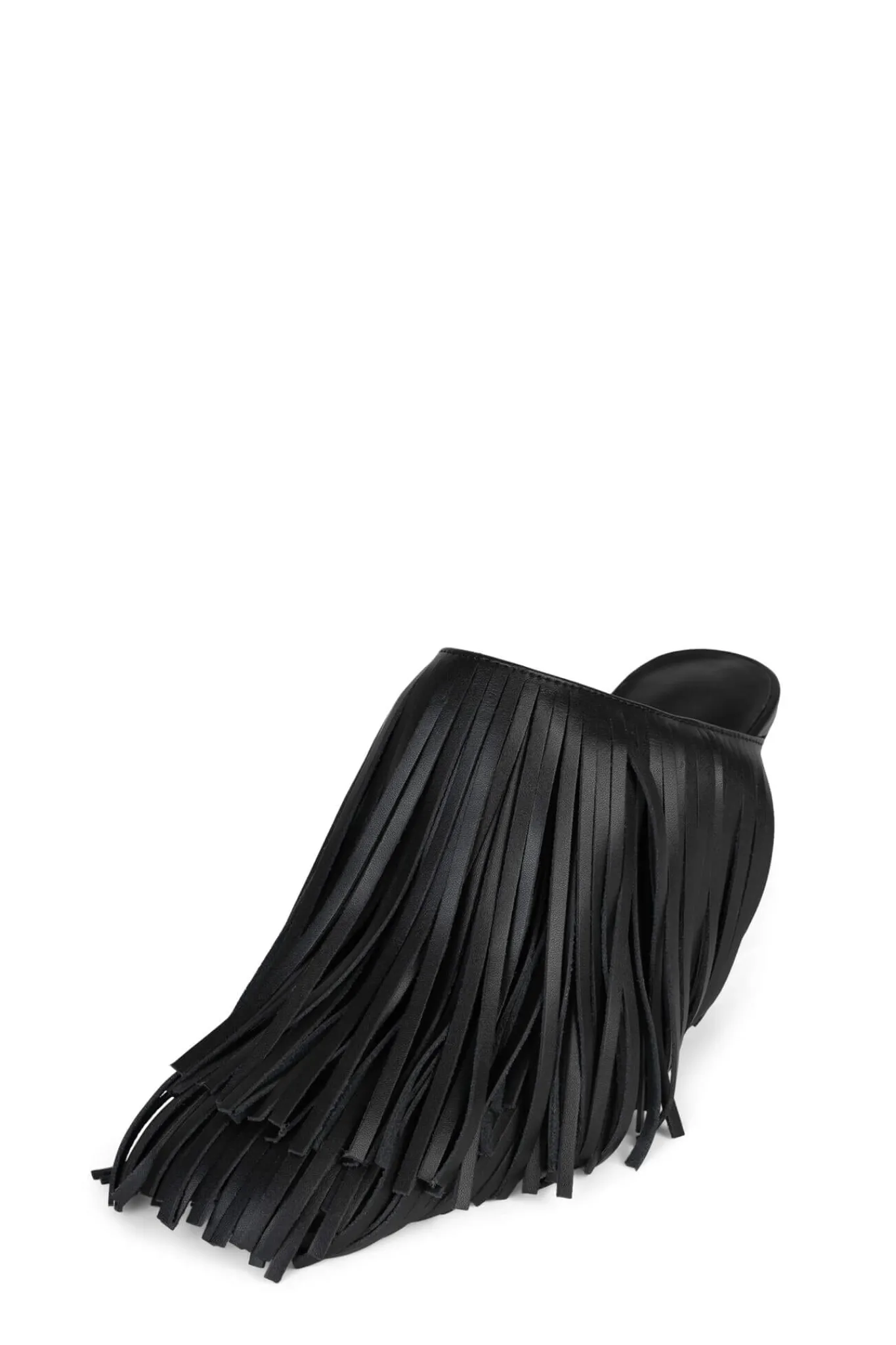 Square-toe heeled mule with fringe Fits true to sizeMeasurements taken from size 73.5″ Heel, 0.25″ PlatformLeather/ Syn…