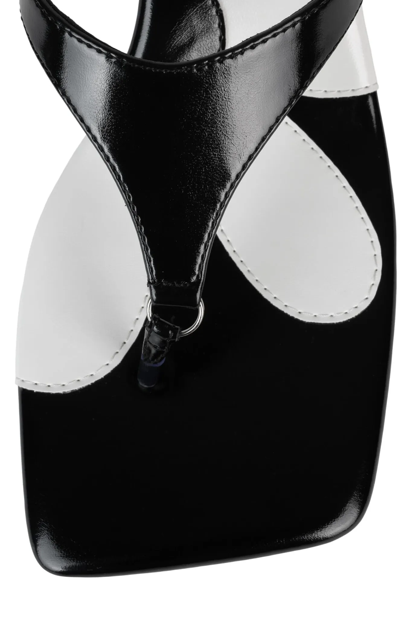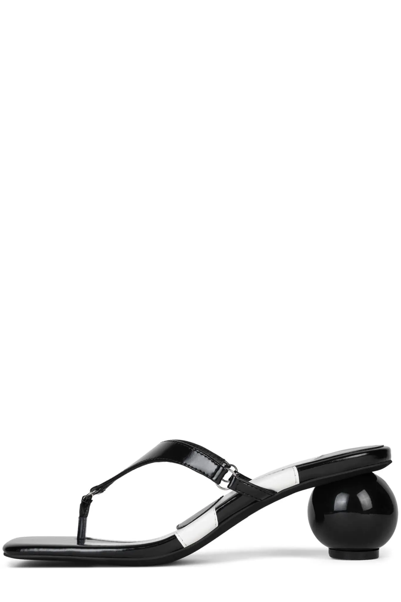 Architectural ball heel square-toe thong sandal with multi-colored flower sock detailing.