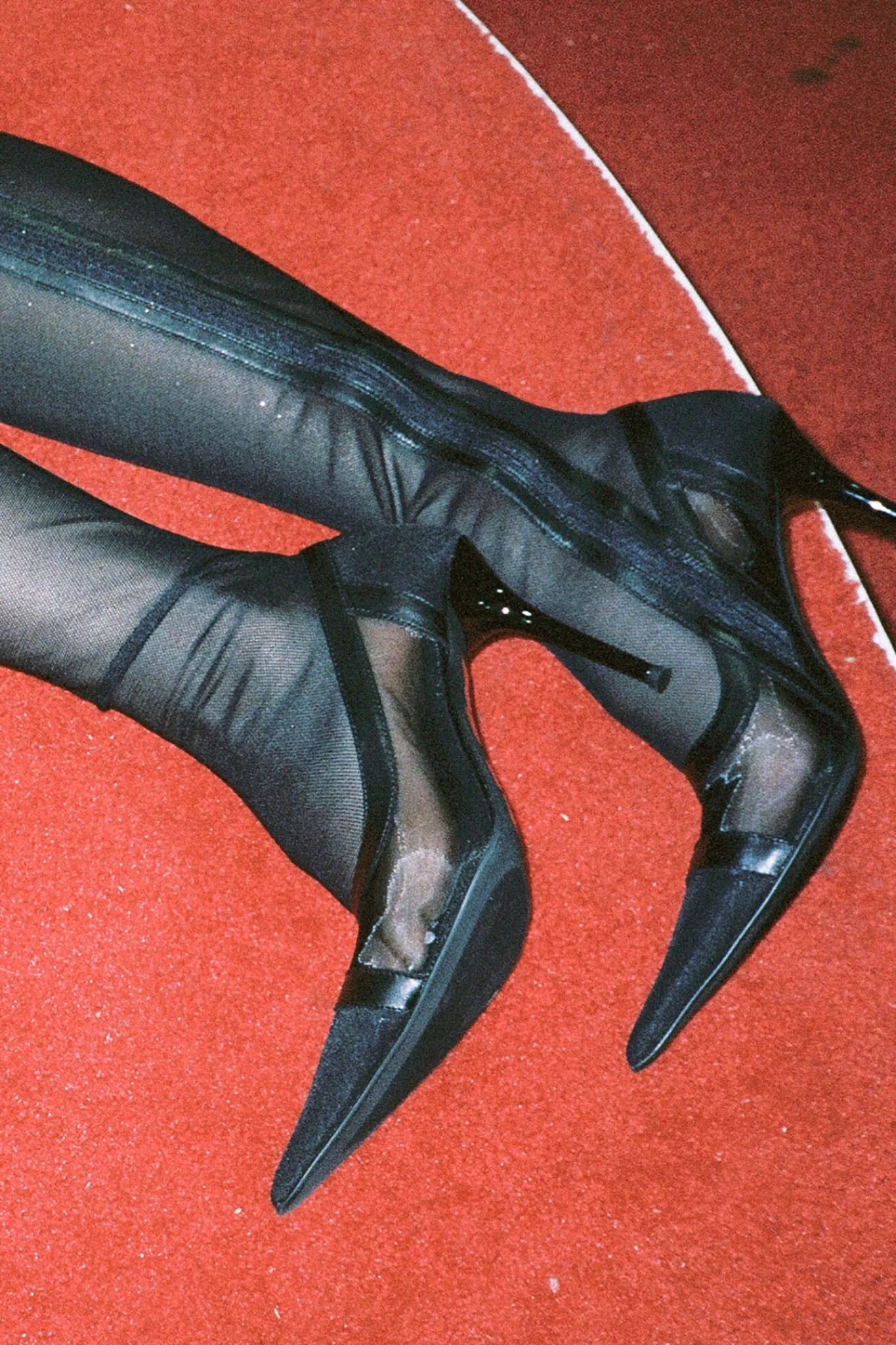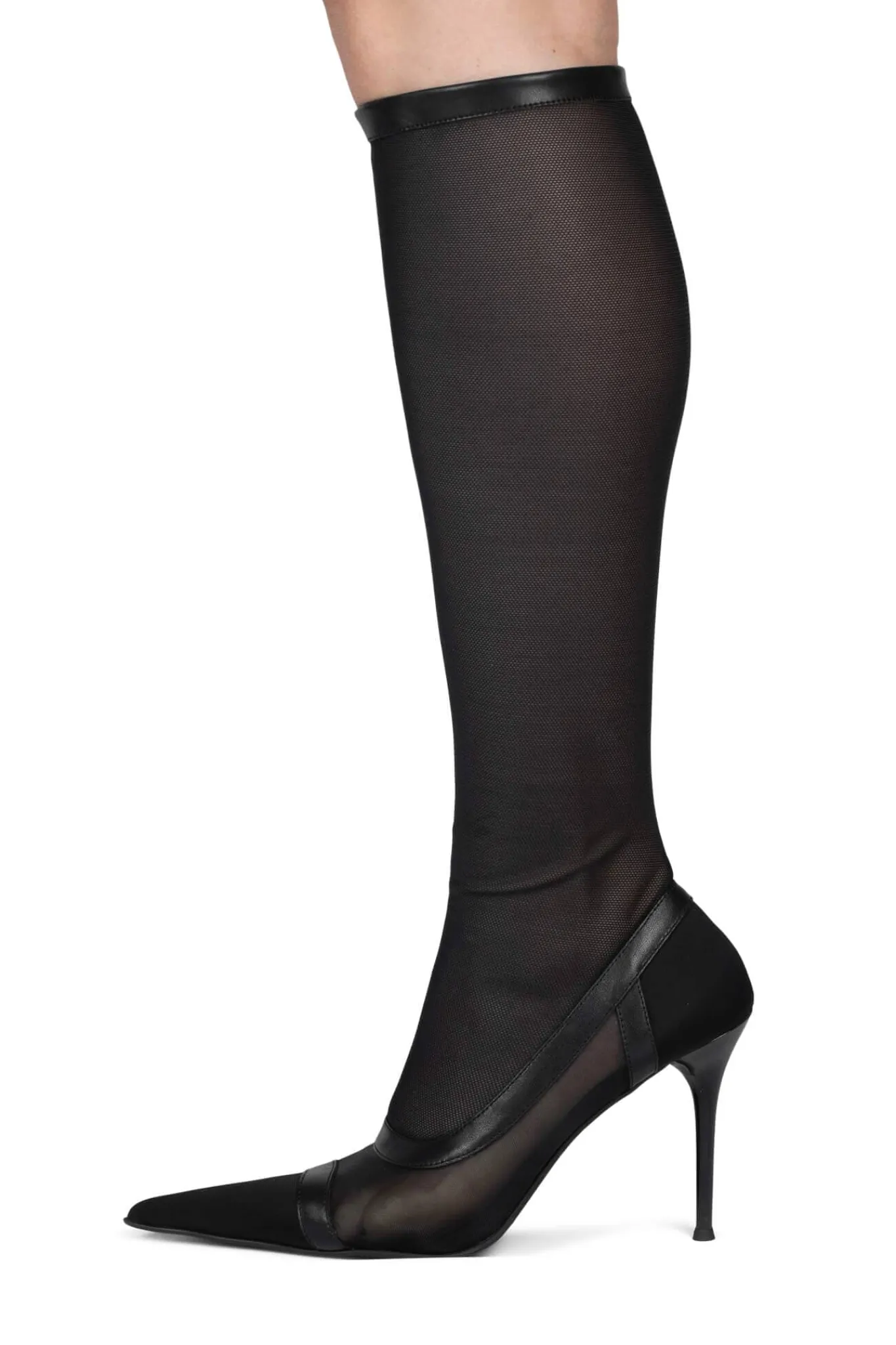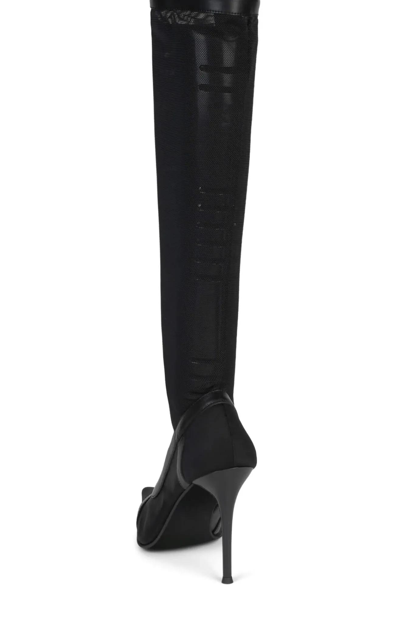 Pointed-toe stiletto mesh knee-high boot with leather contrast
