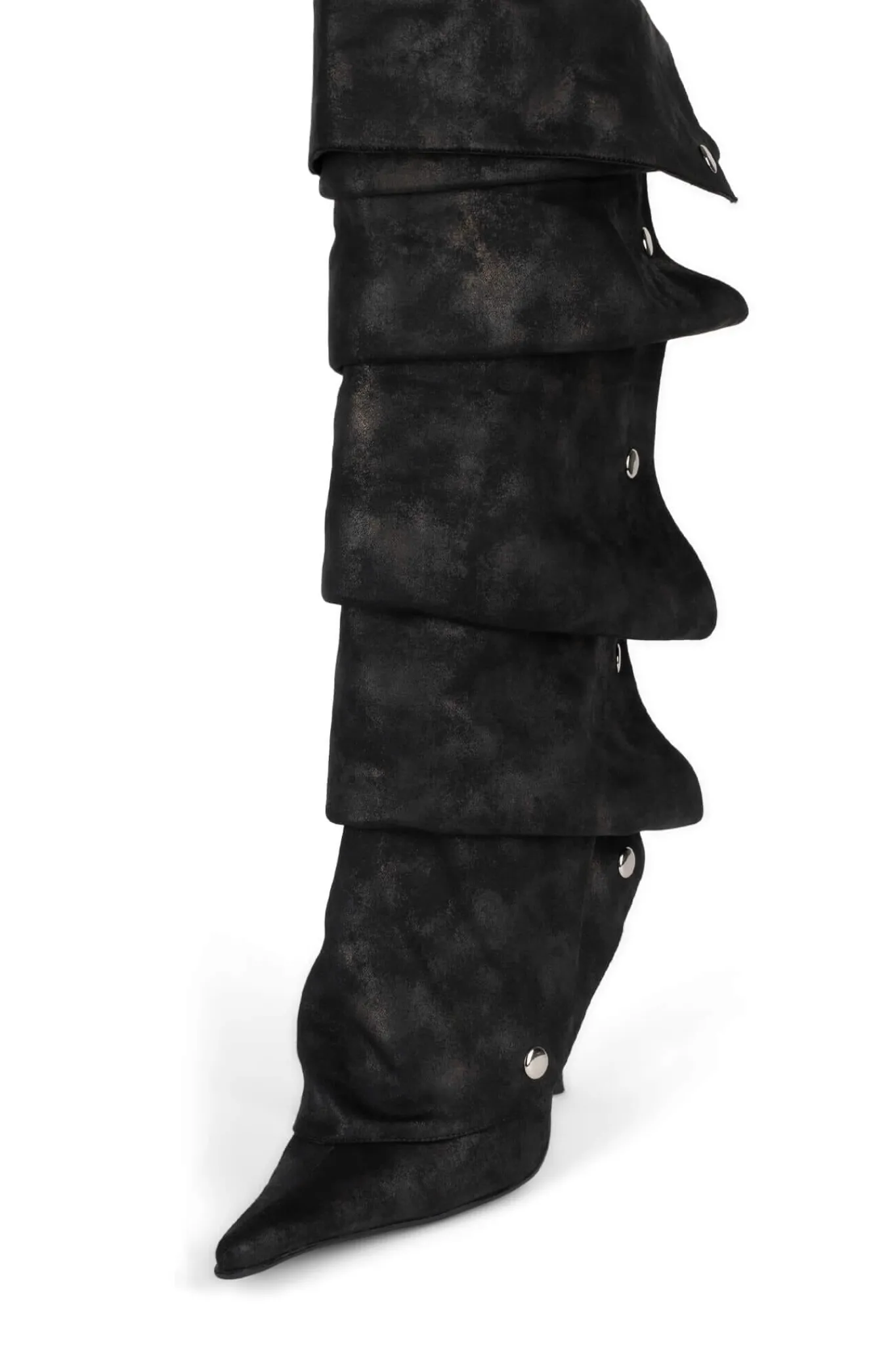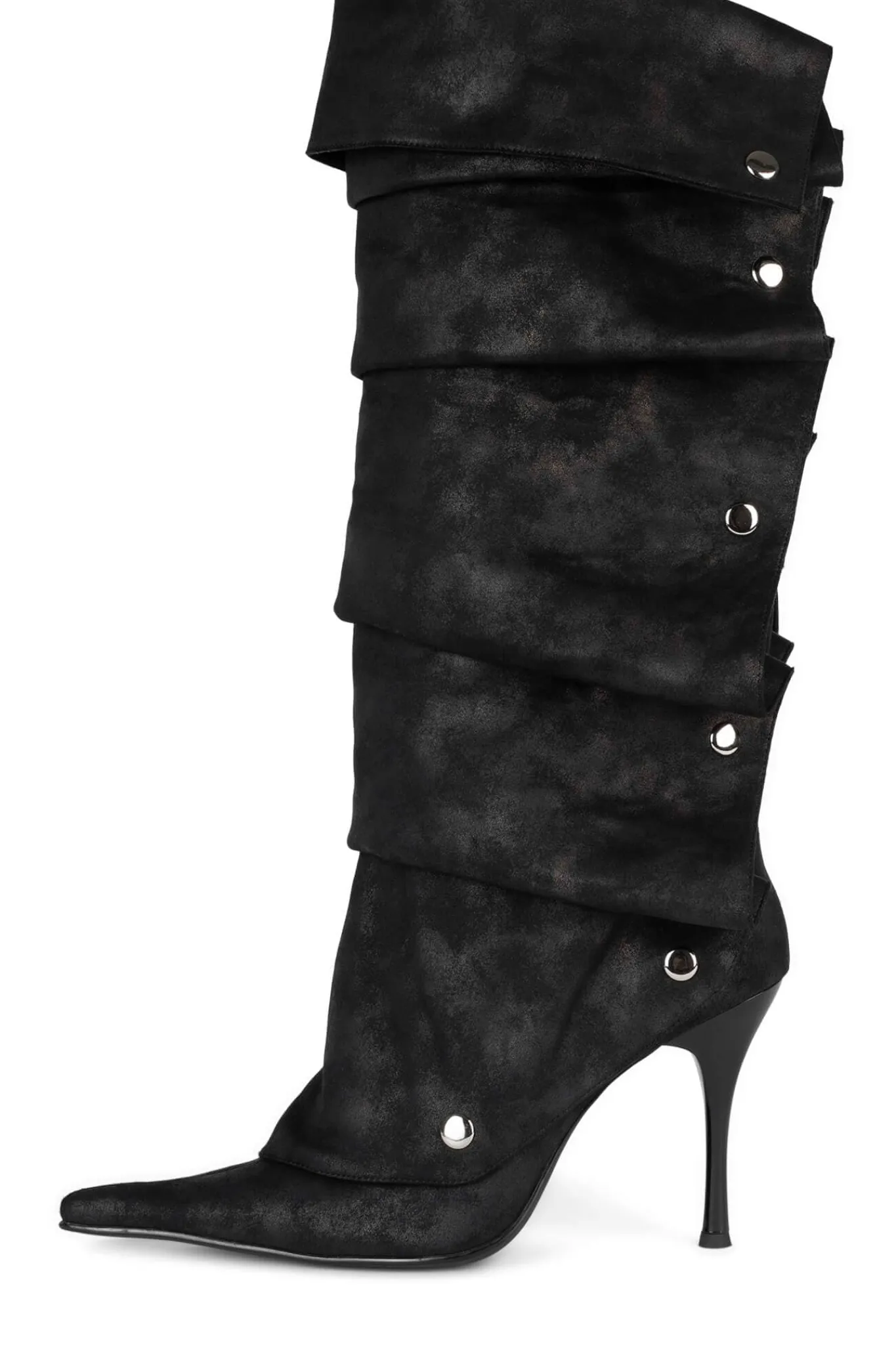 Pointed-toe stiletto knee-high boot with snap-off fold-over panel