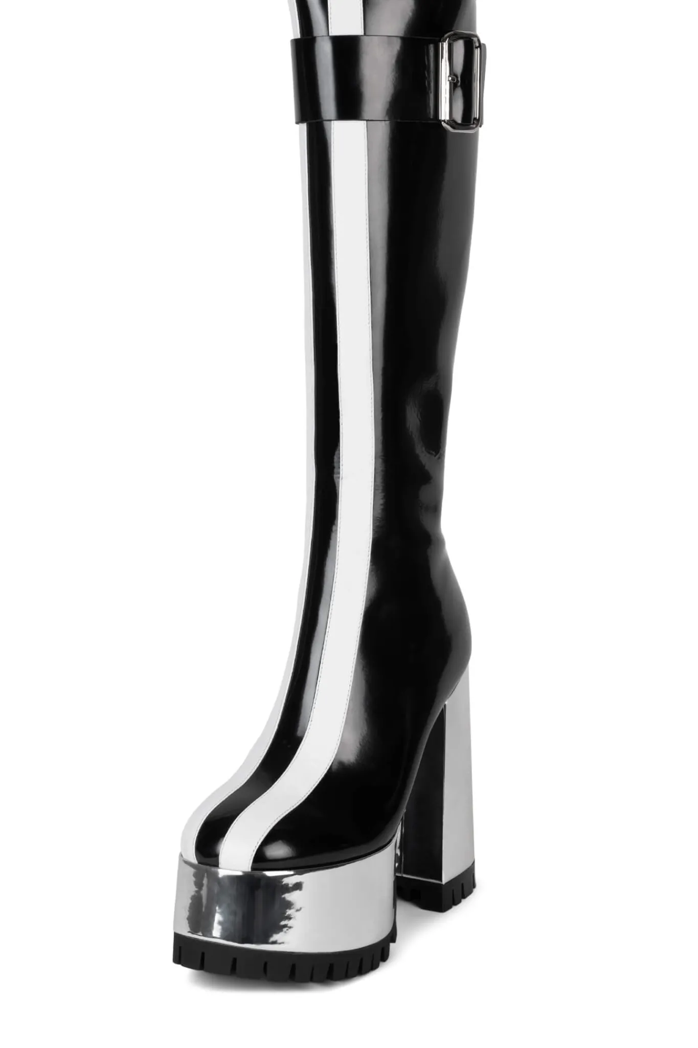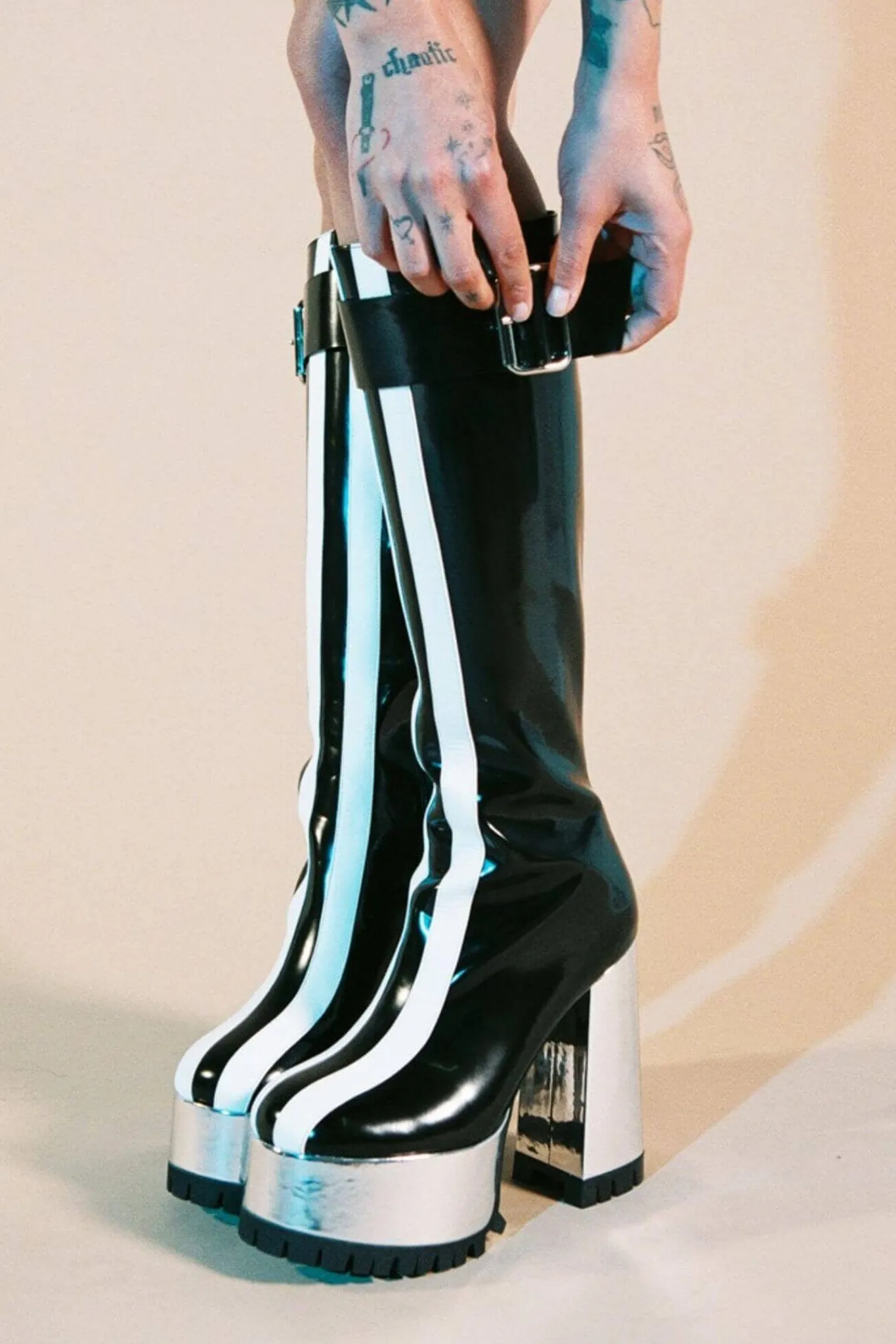 Knee-high boot with buckle detail and metallic platform Fits true to sizeMeasurements taken from a size 7 5.5″ Heel, 2…