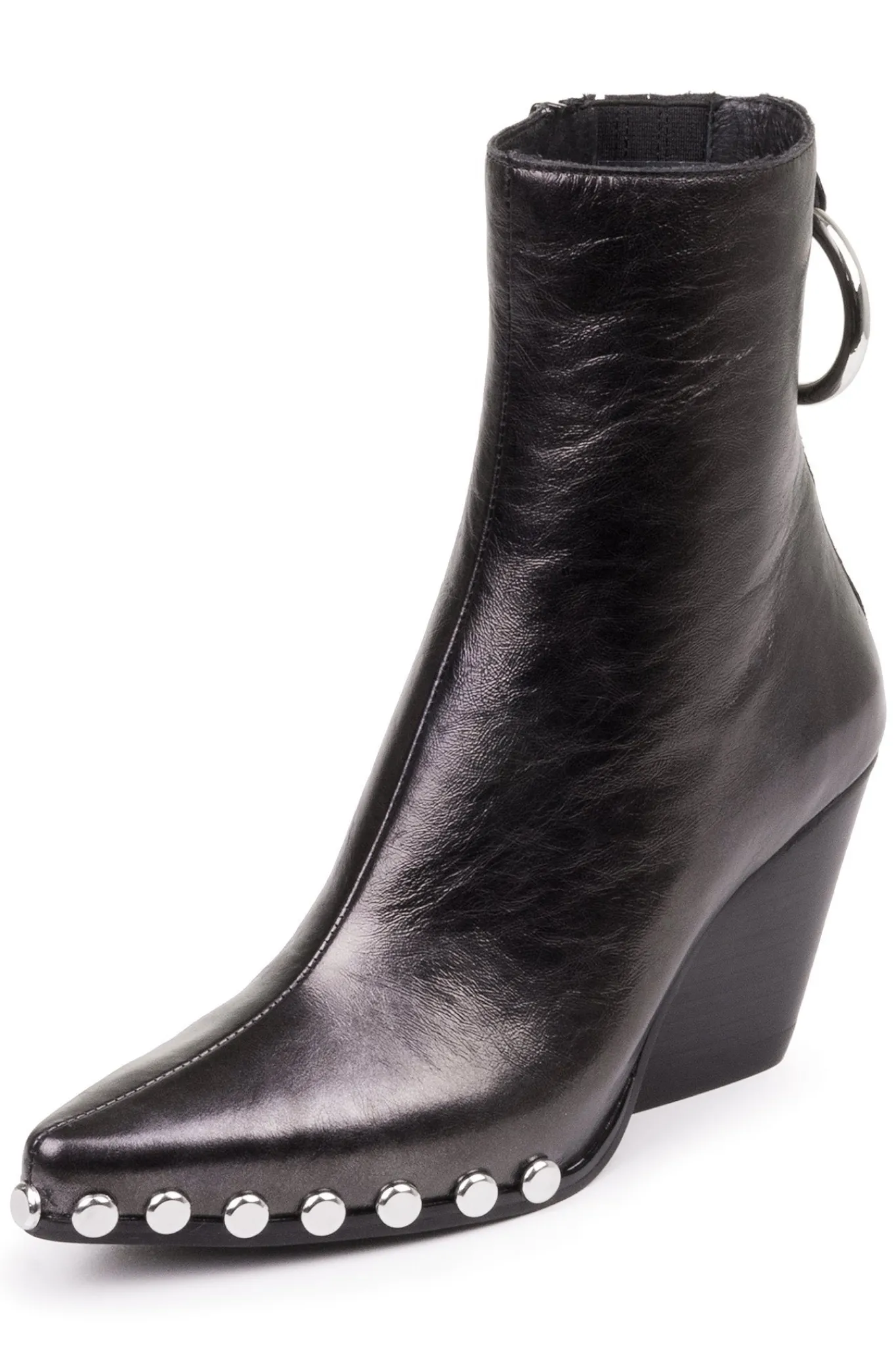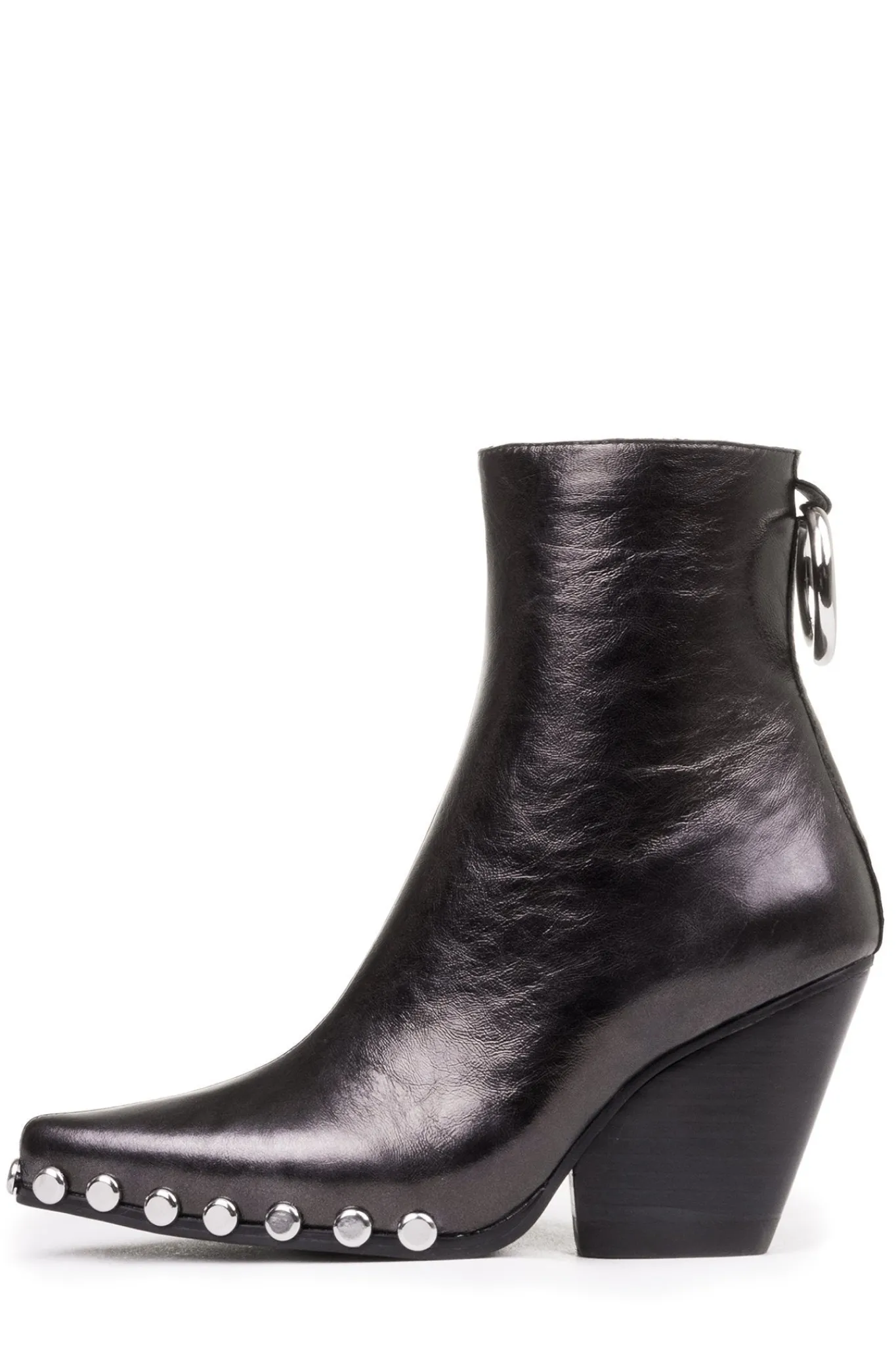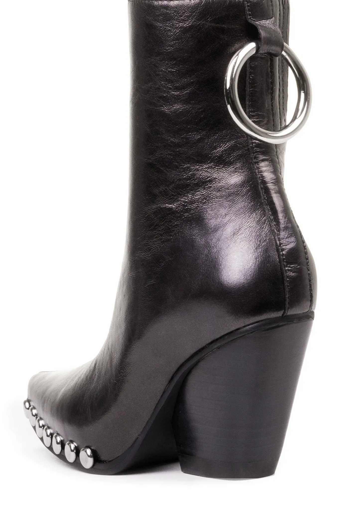 Western heeled boot with metal embellishment.