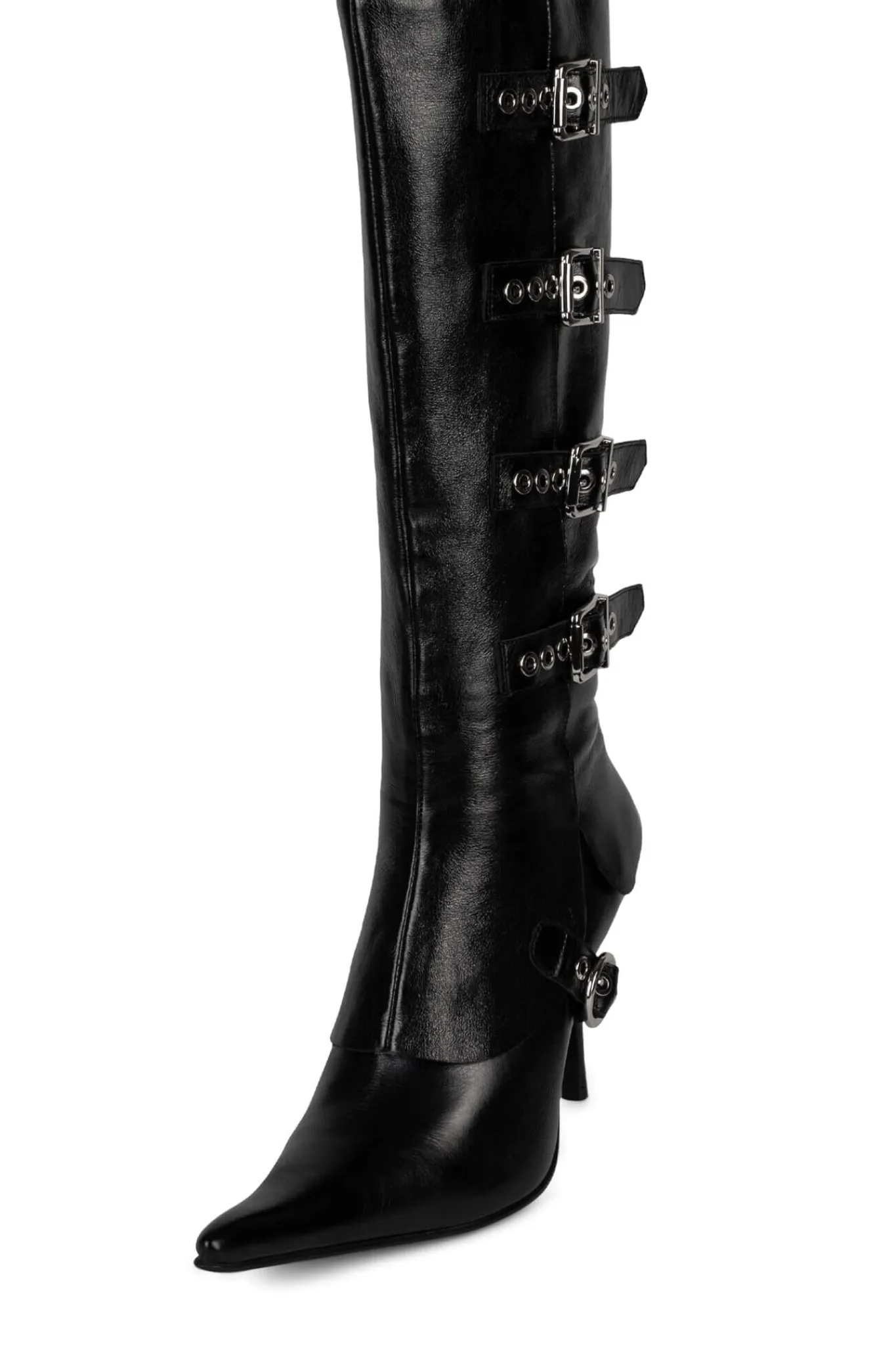 Pointed-toe knee-high stiletto boot with buckle detailFits true to sizeMeasurements taken from size 7 4″ Heel, 0.25″ Pl…