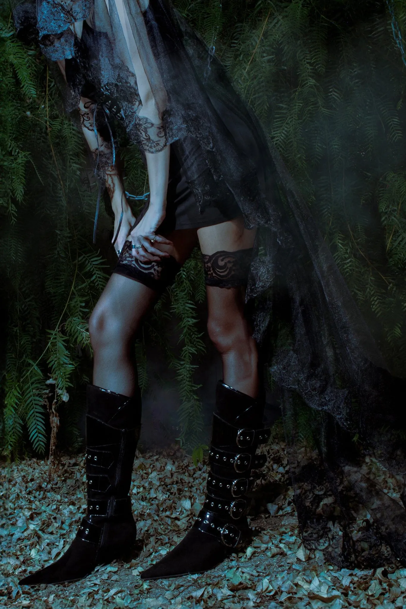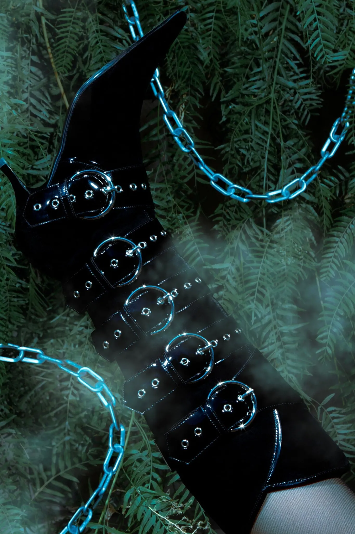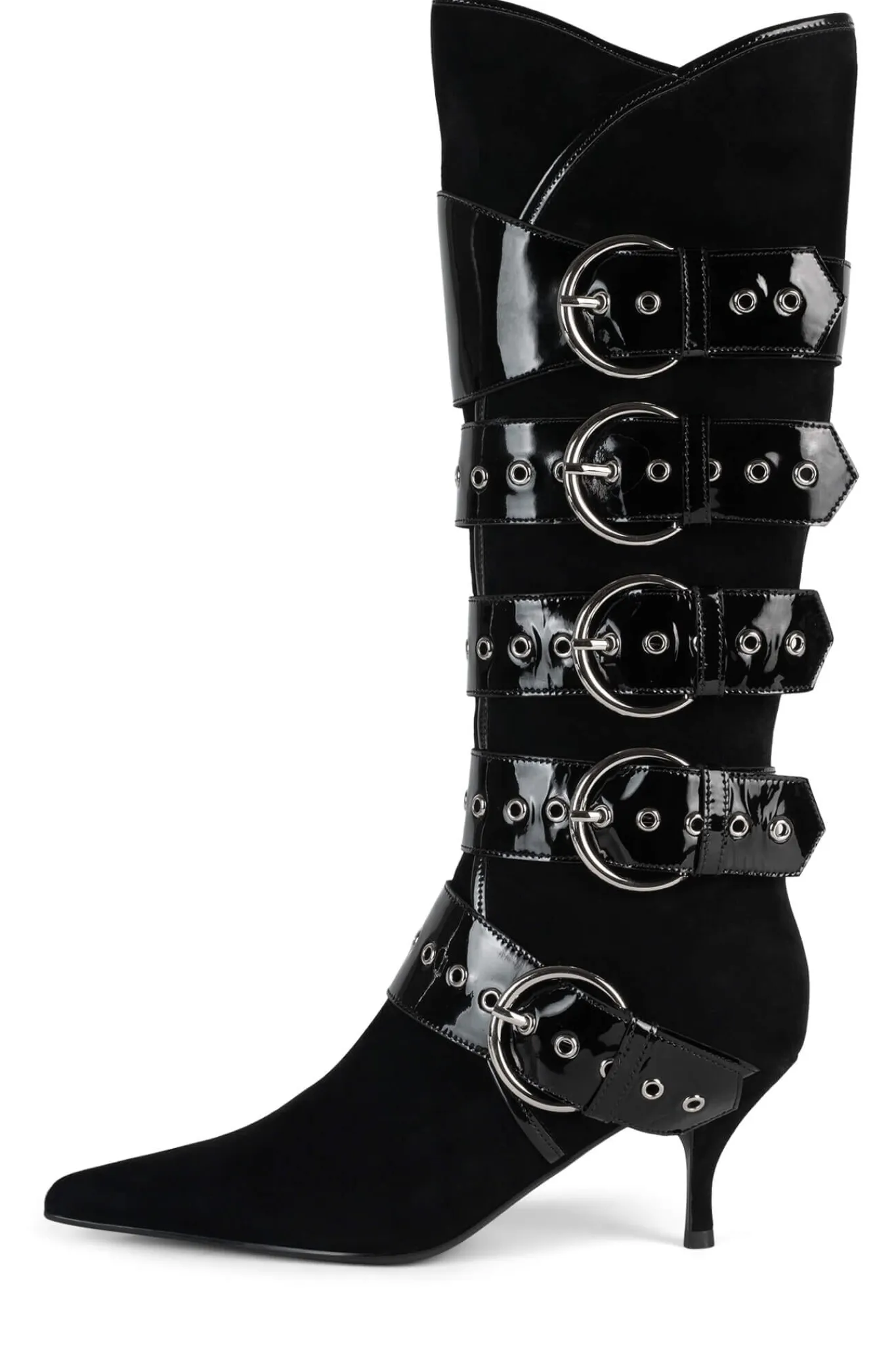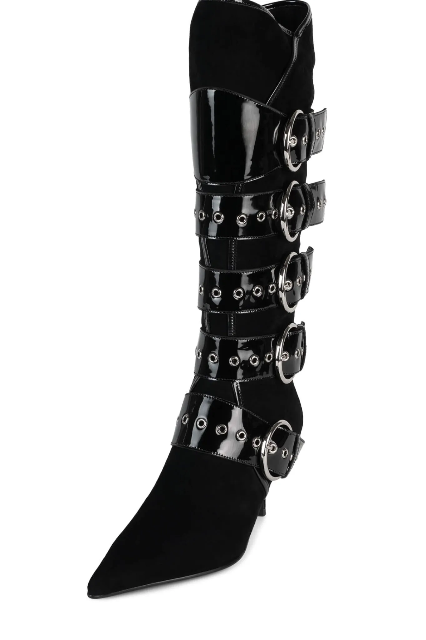 Knee-high pointed-toe heeled boot with strap and buckle detail