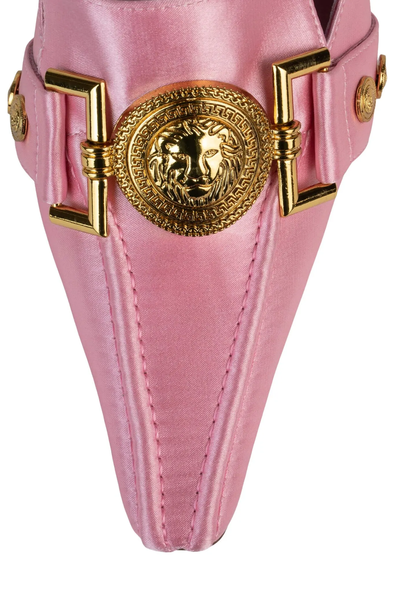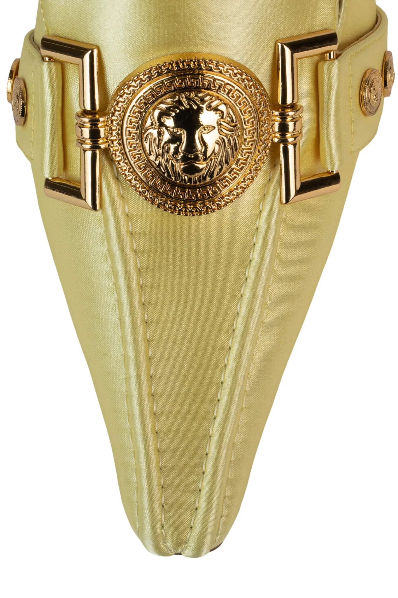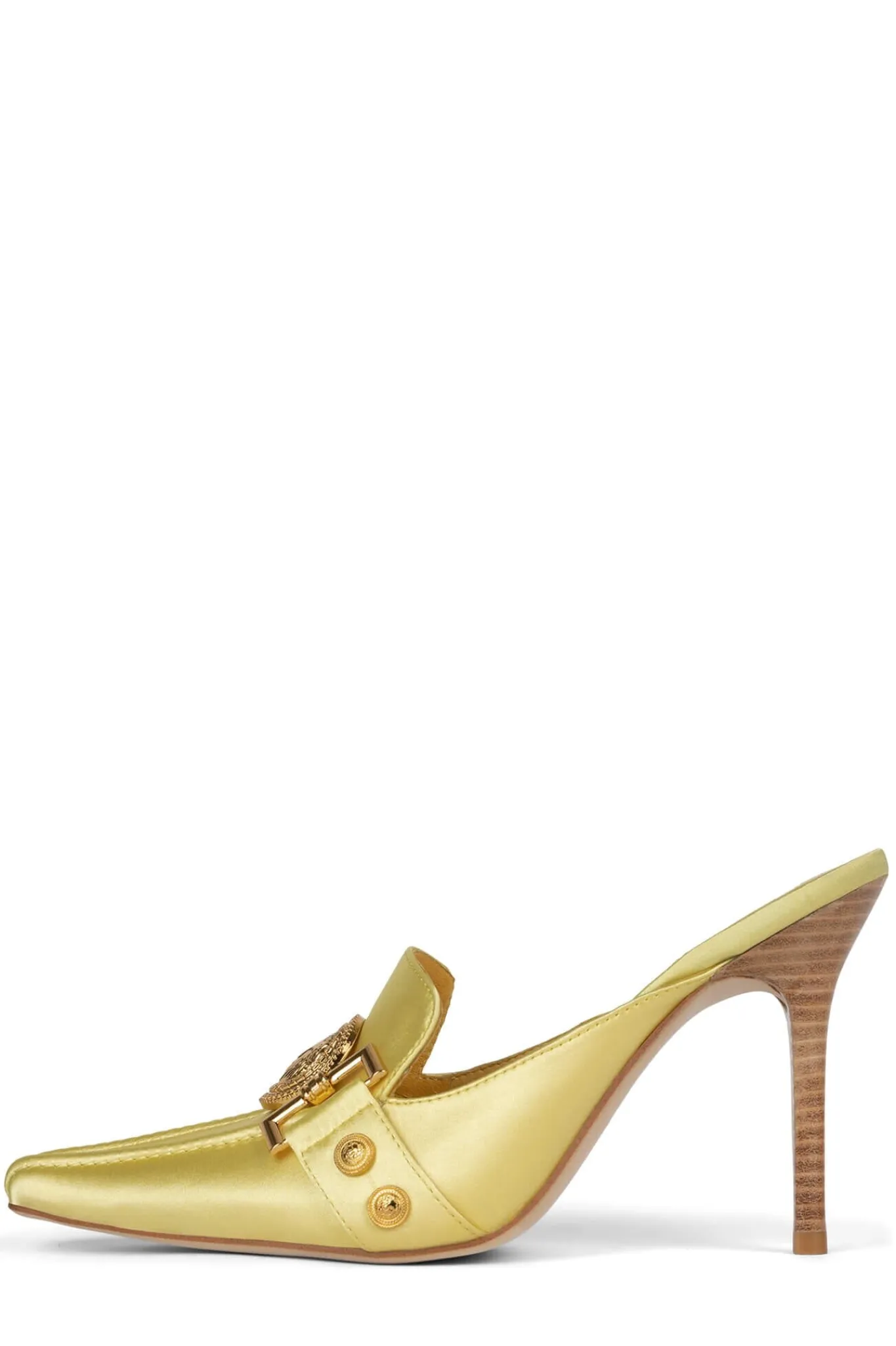 Pointed-toe stiletto loafer mule with lion emblem