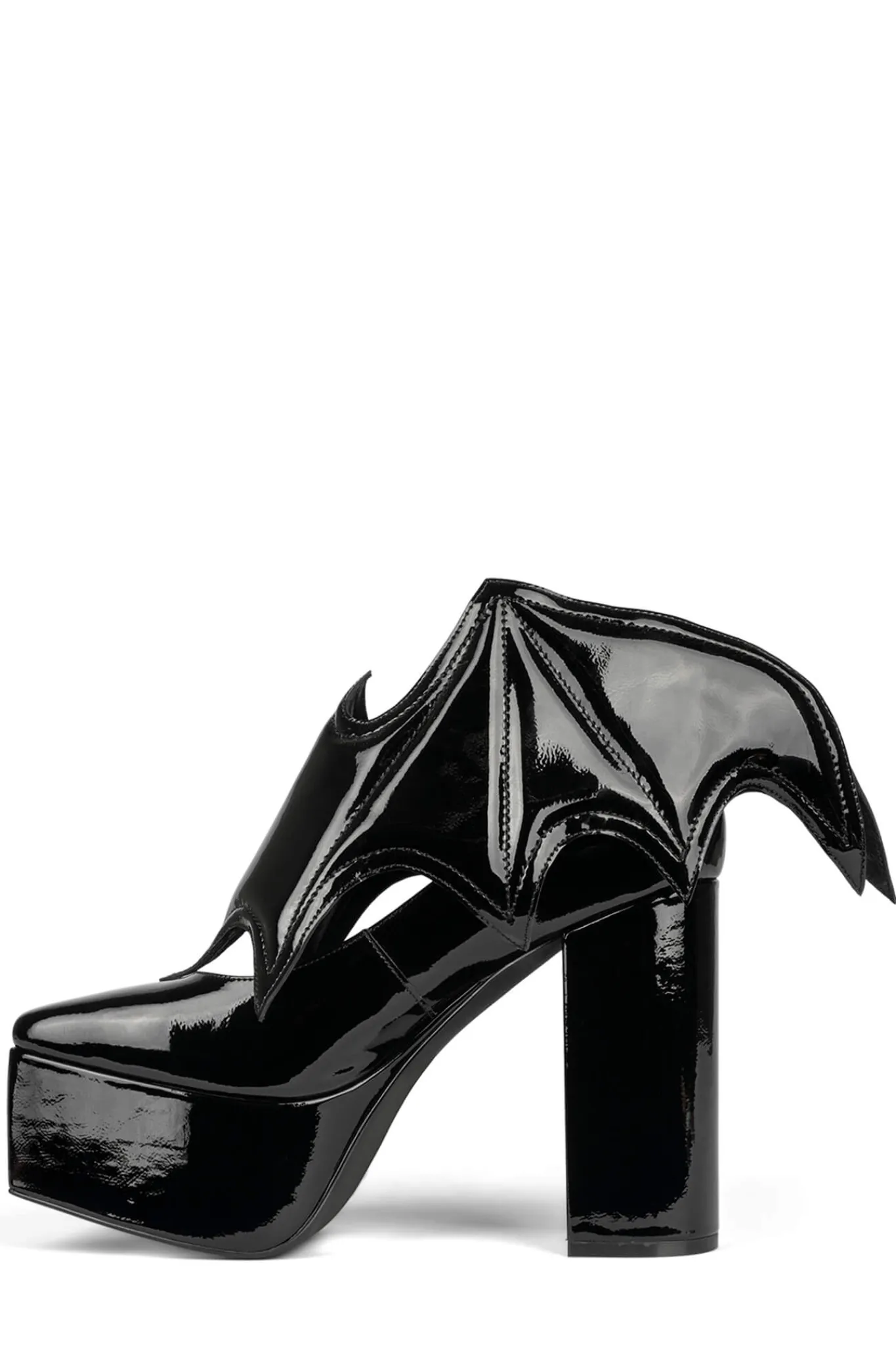 Platform pump with removable bat wingsFits half a size big. Order half size down. Measurements taken from a size 74.75″…