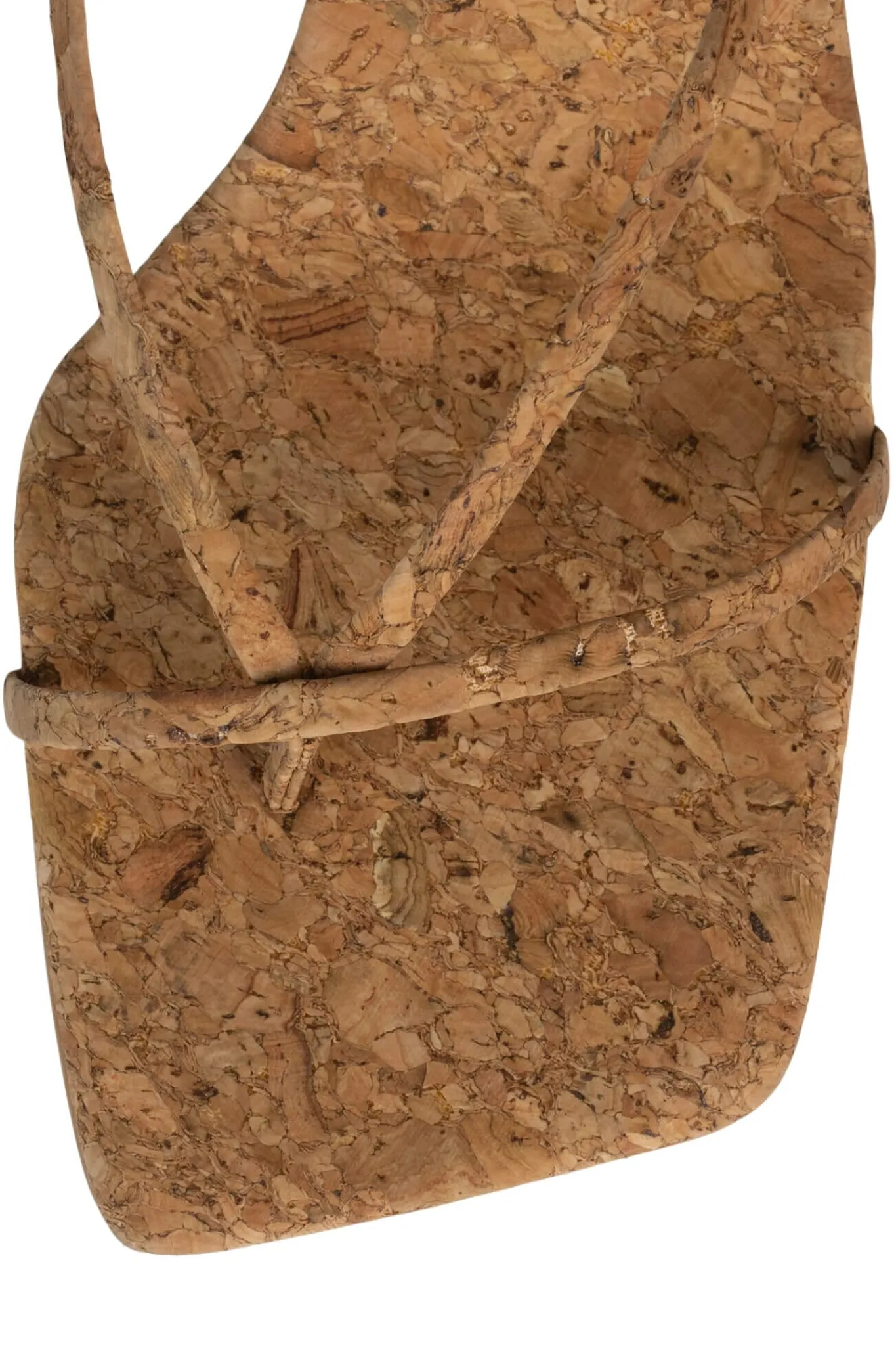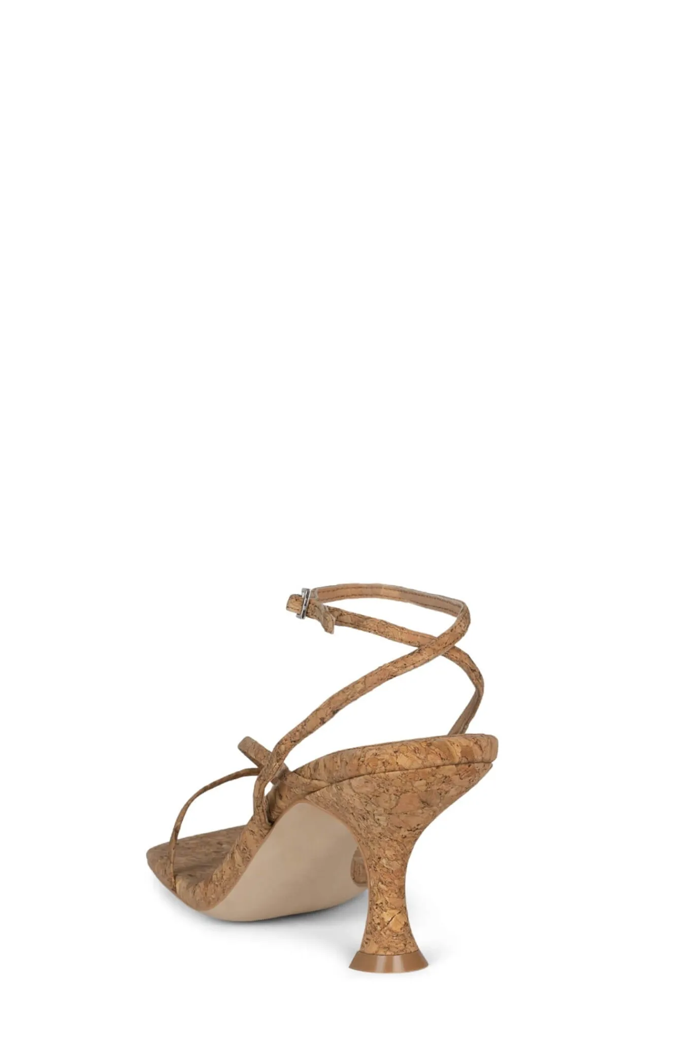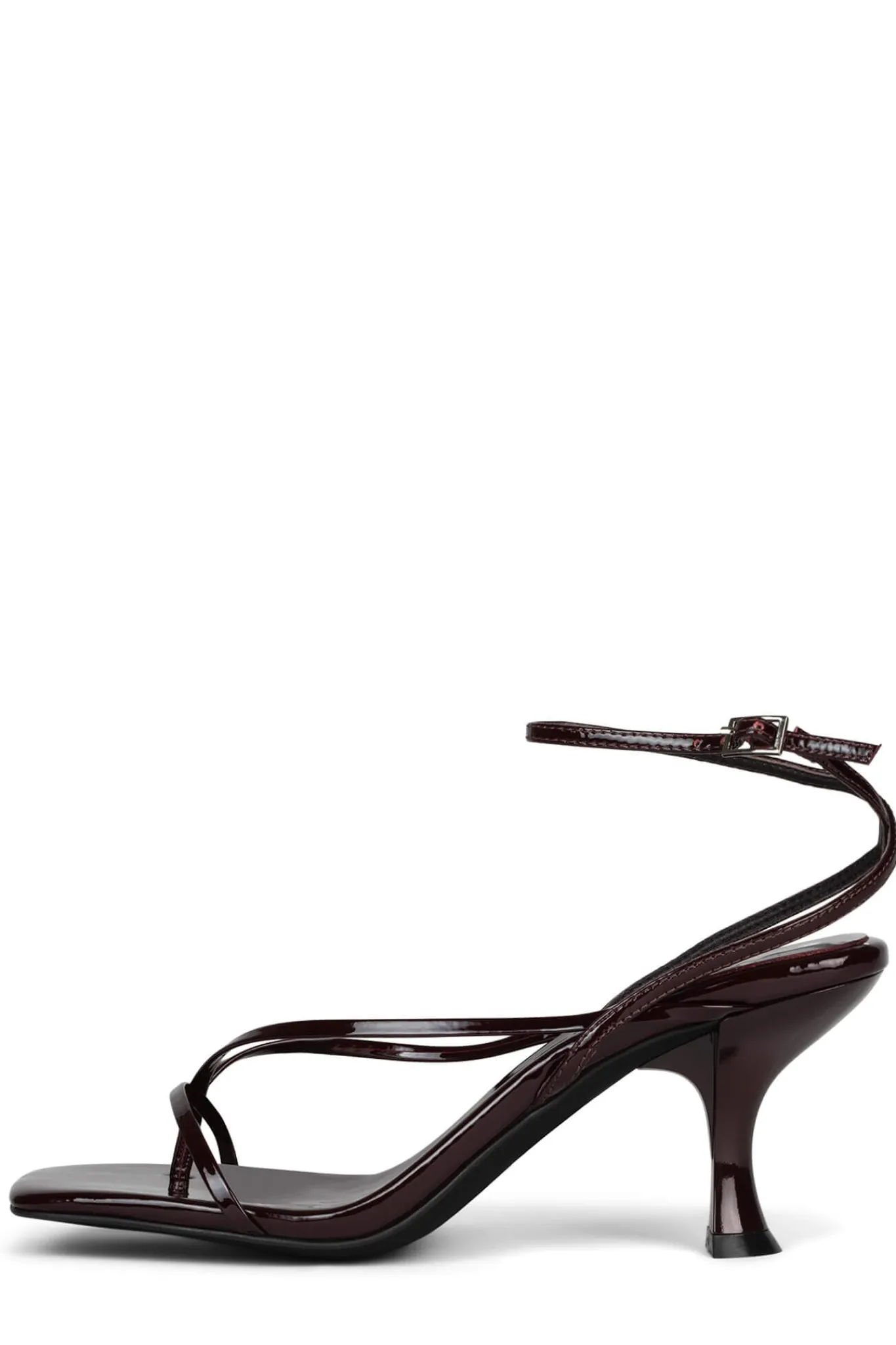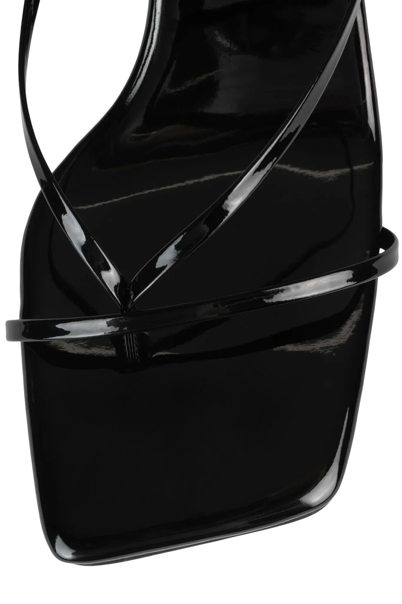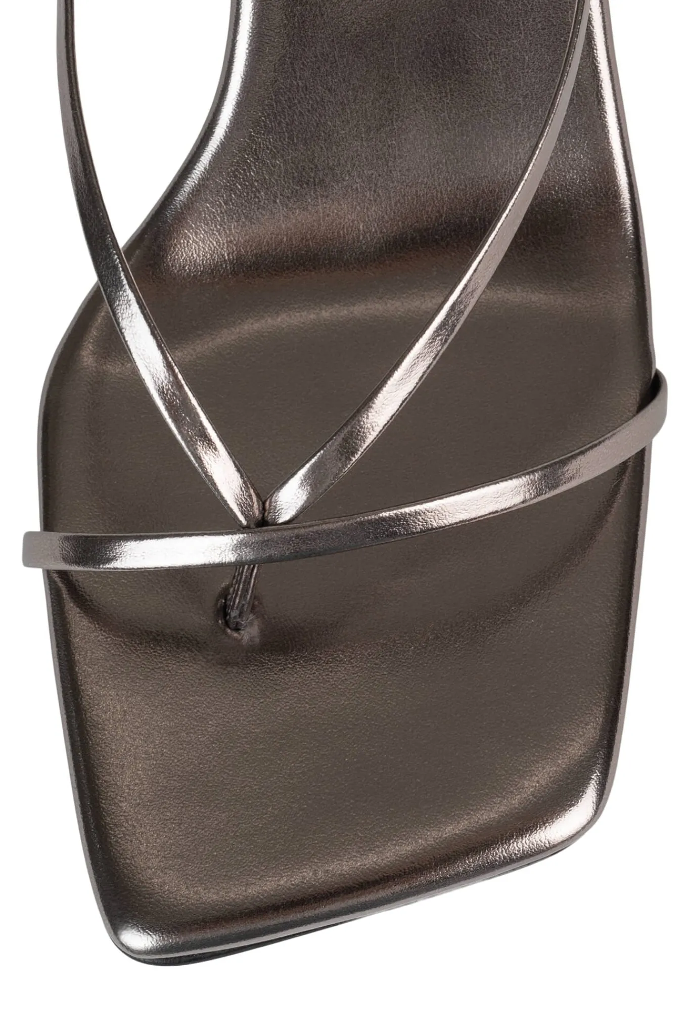 Square-toe, mid-heel strappy thong sandal with ankle strap.