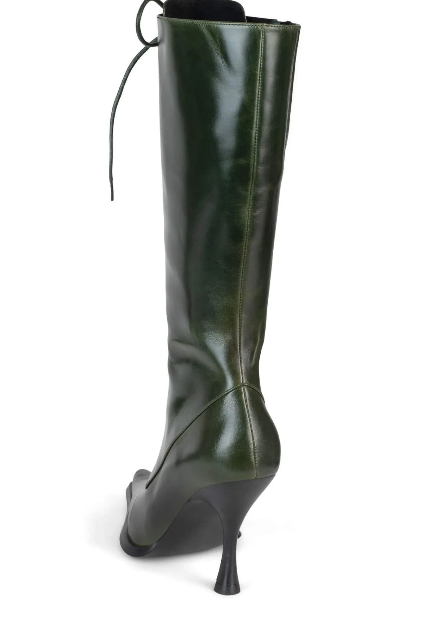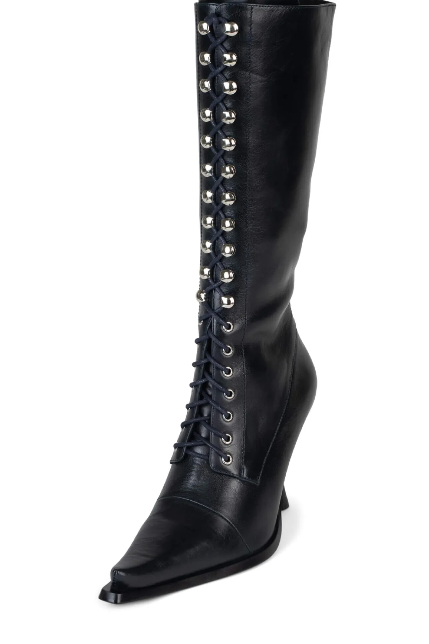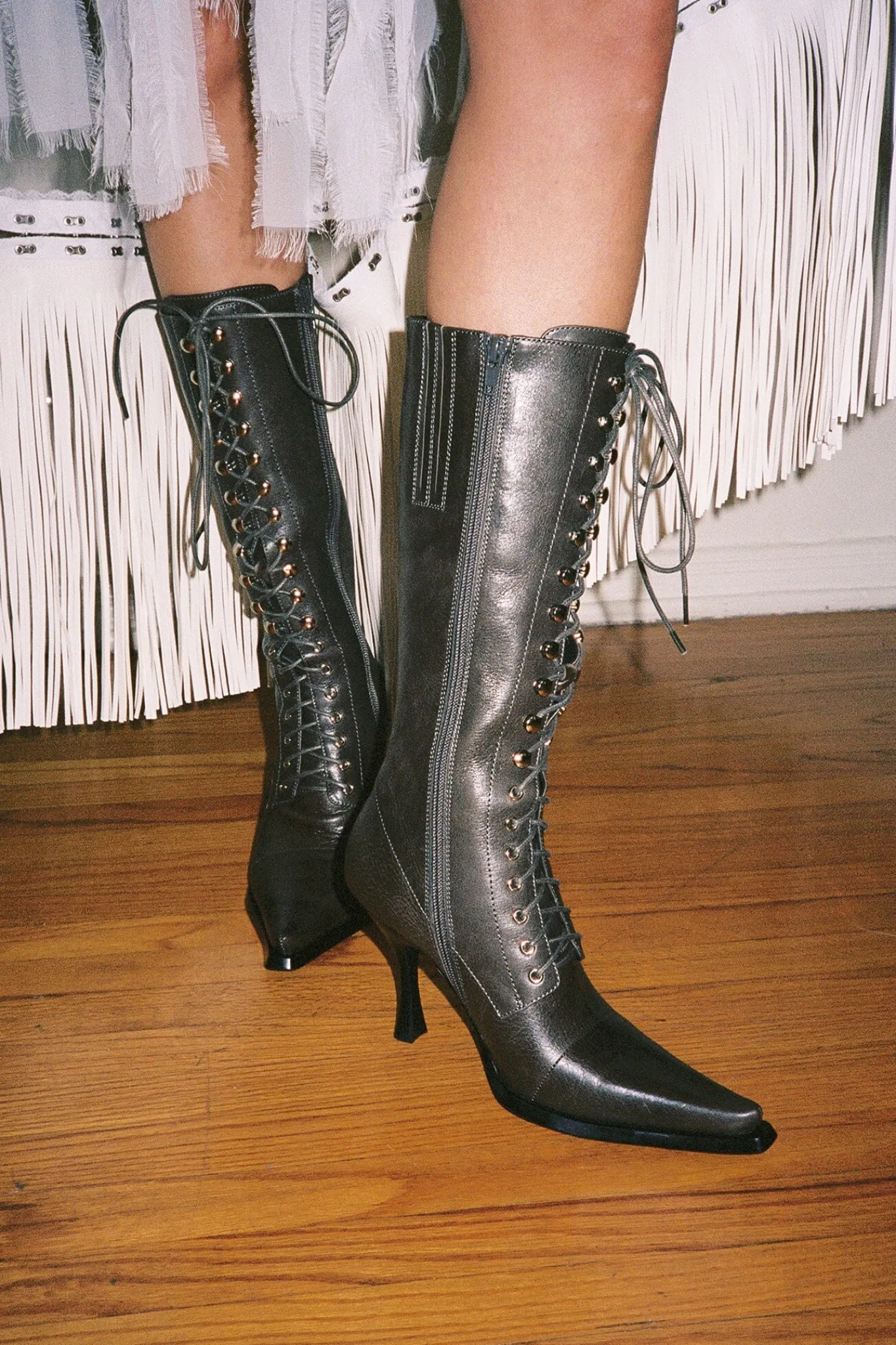 Knee-high victorian lace-up heeled bootFits true to sizeMeasurements taken from a size 73.5″ Heel, 0.25″ Platform12″ Leg…