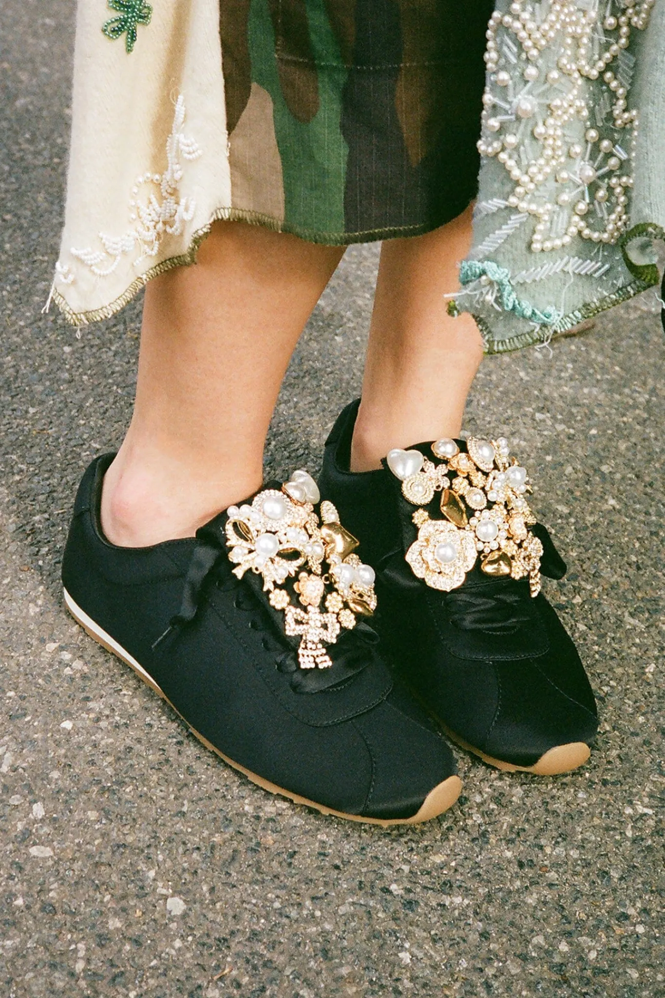 Satin sneaker with embellished fold-over tongue.