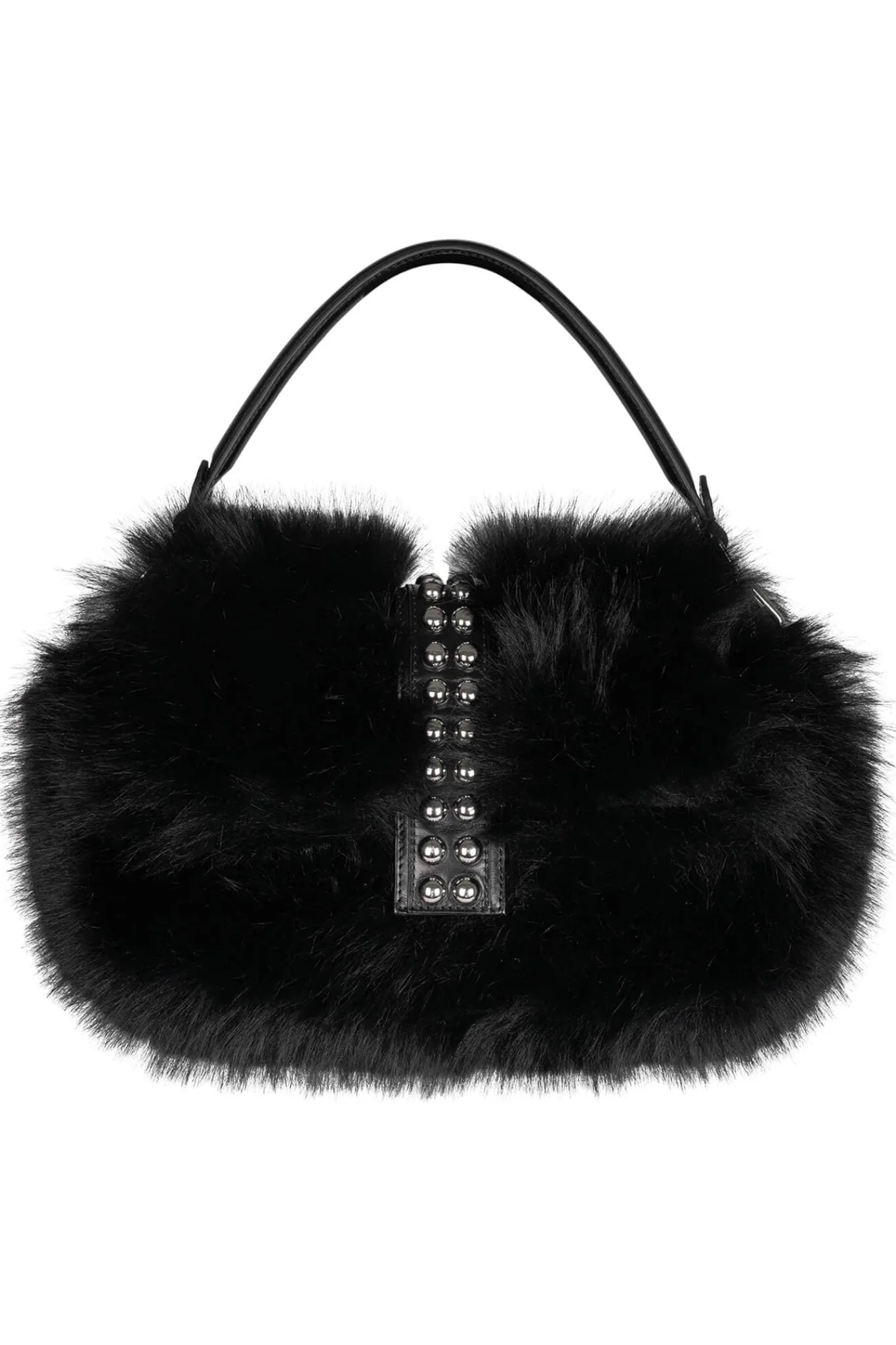Faux-fur handbag with metal stud detail 8″ Height, 12″ Base11.5″ Opening, 6.5″ Strap LengthMade of faux-fur & Leath…