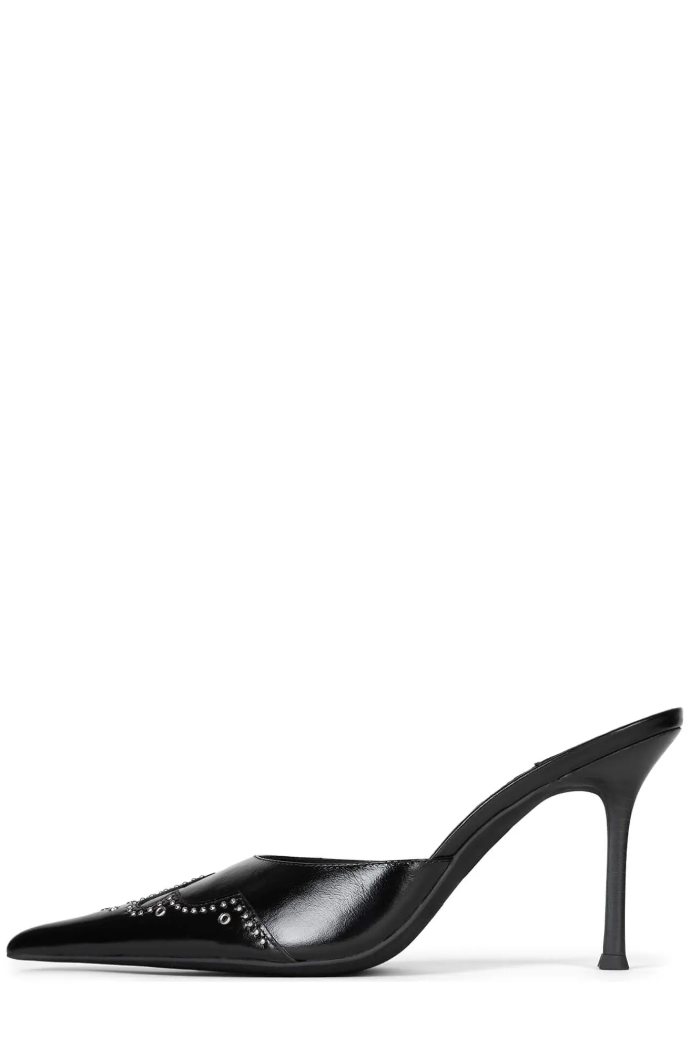 Our BITE-ME pointed-toe stiletto mule with western motif, now offered in extended sizingFits true to sizeMeasurements t…