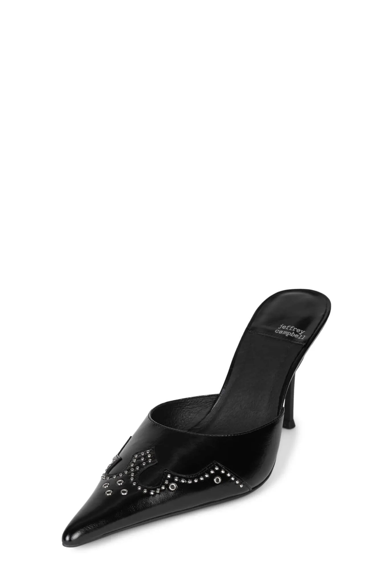 Our BITE-ME pointed-toe stiletto mule with western motif, now offered in extended sizing