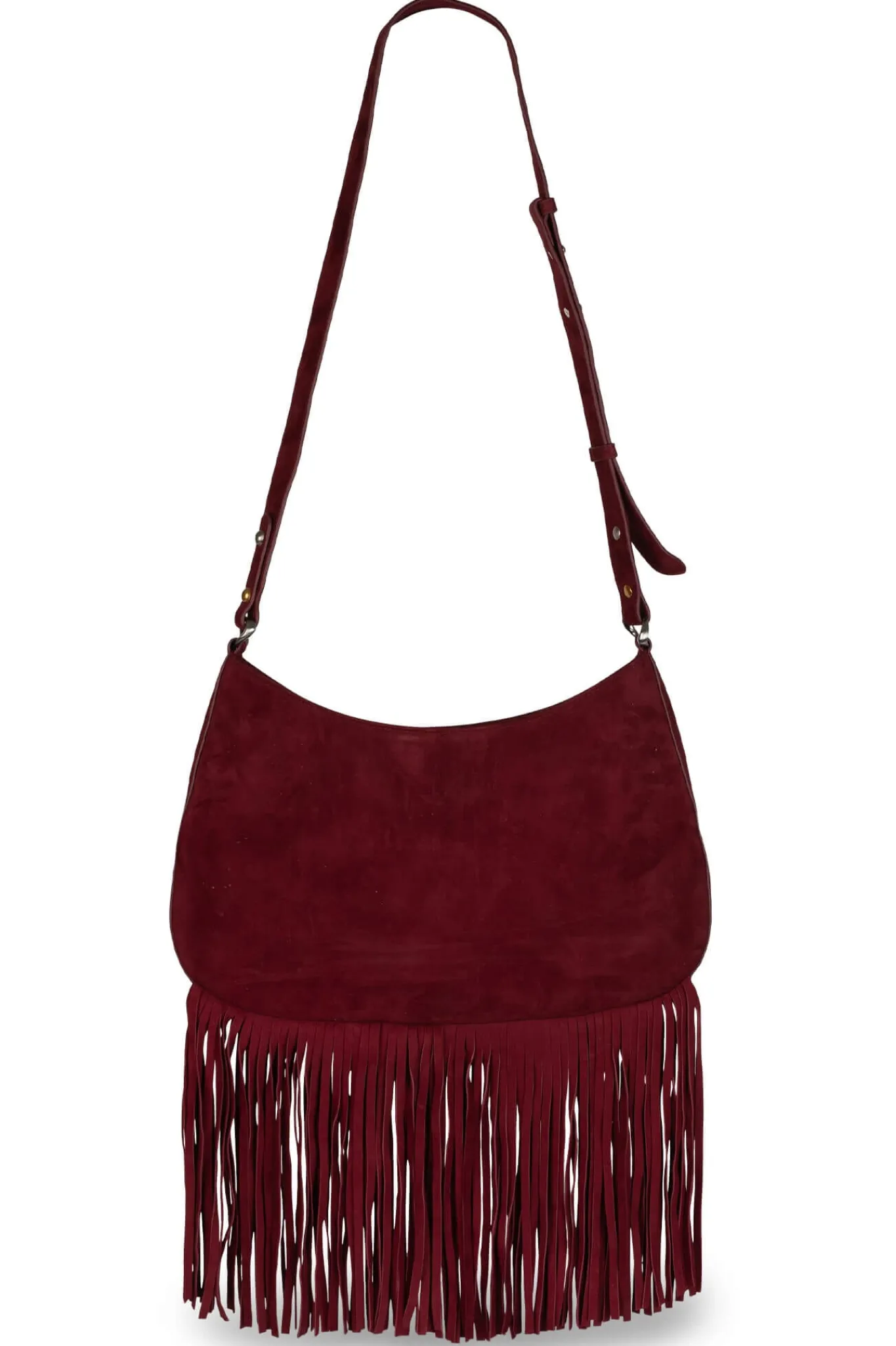 Fringe shoulder bag with adjustable shoulder strap, mixed metallic stud detailing