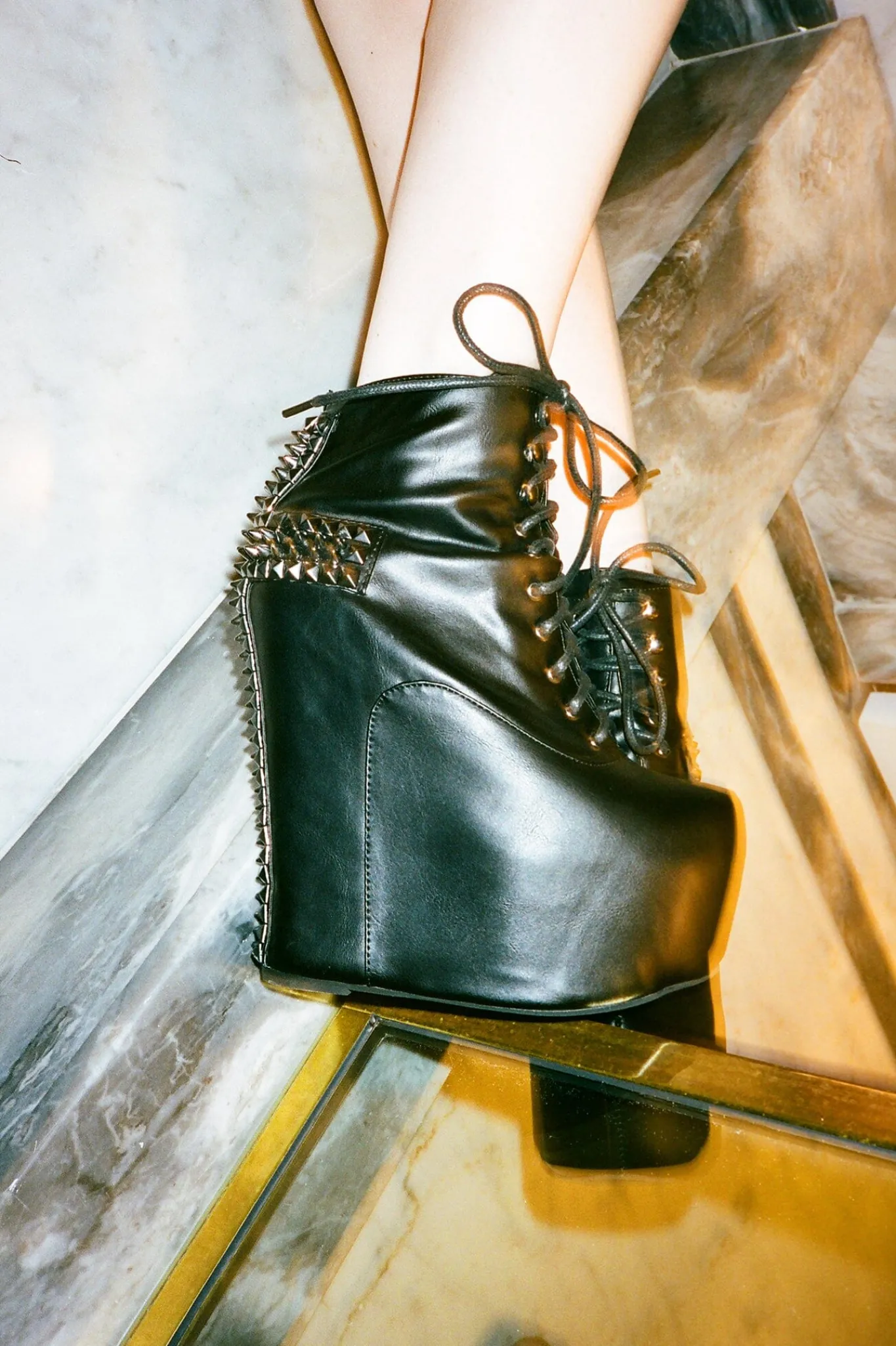 Lace-up platform wedge boot with spiked cross detail