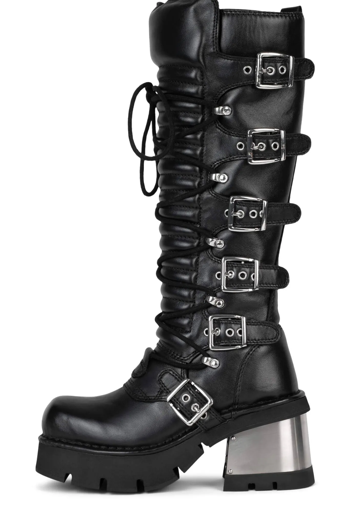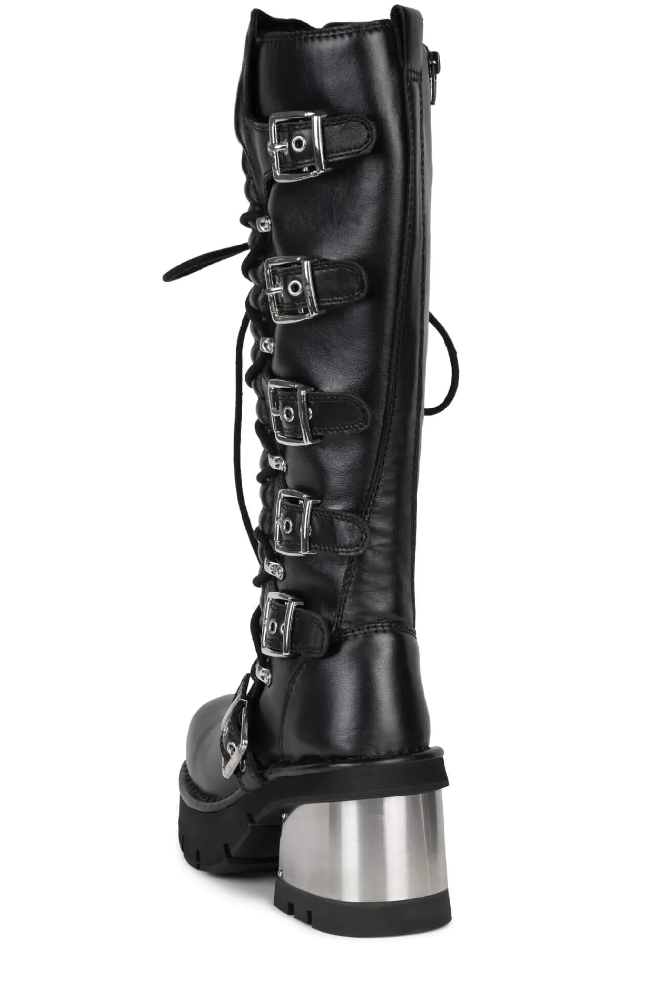 Knee-high lace-up moto-inspired boot with capped metal heel