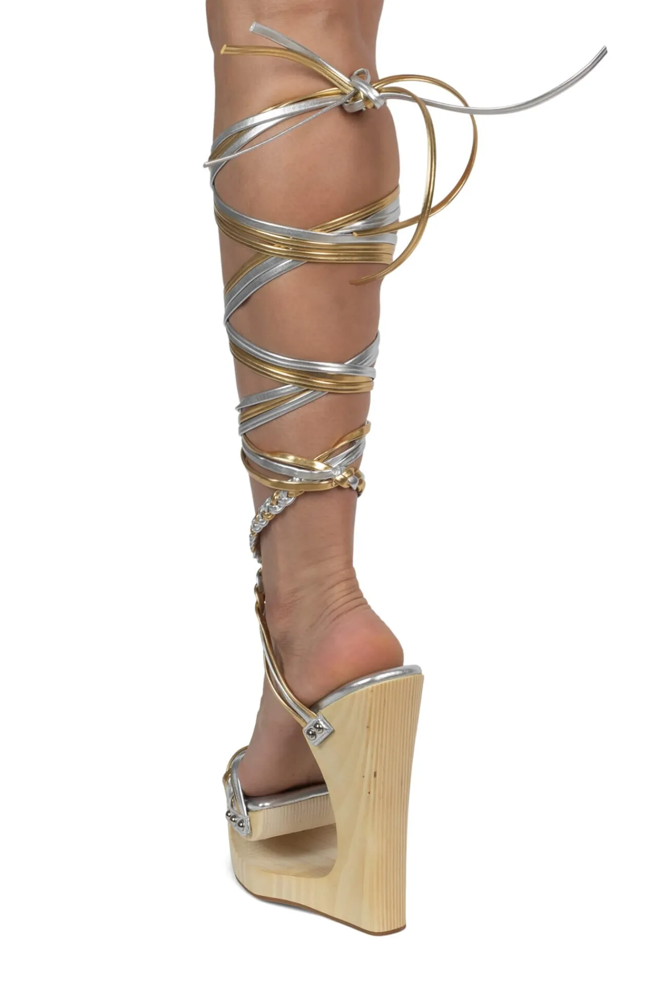 Knee-high multi-strap wrap-around heel on a sculpted wooden platform wedge