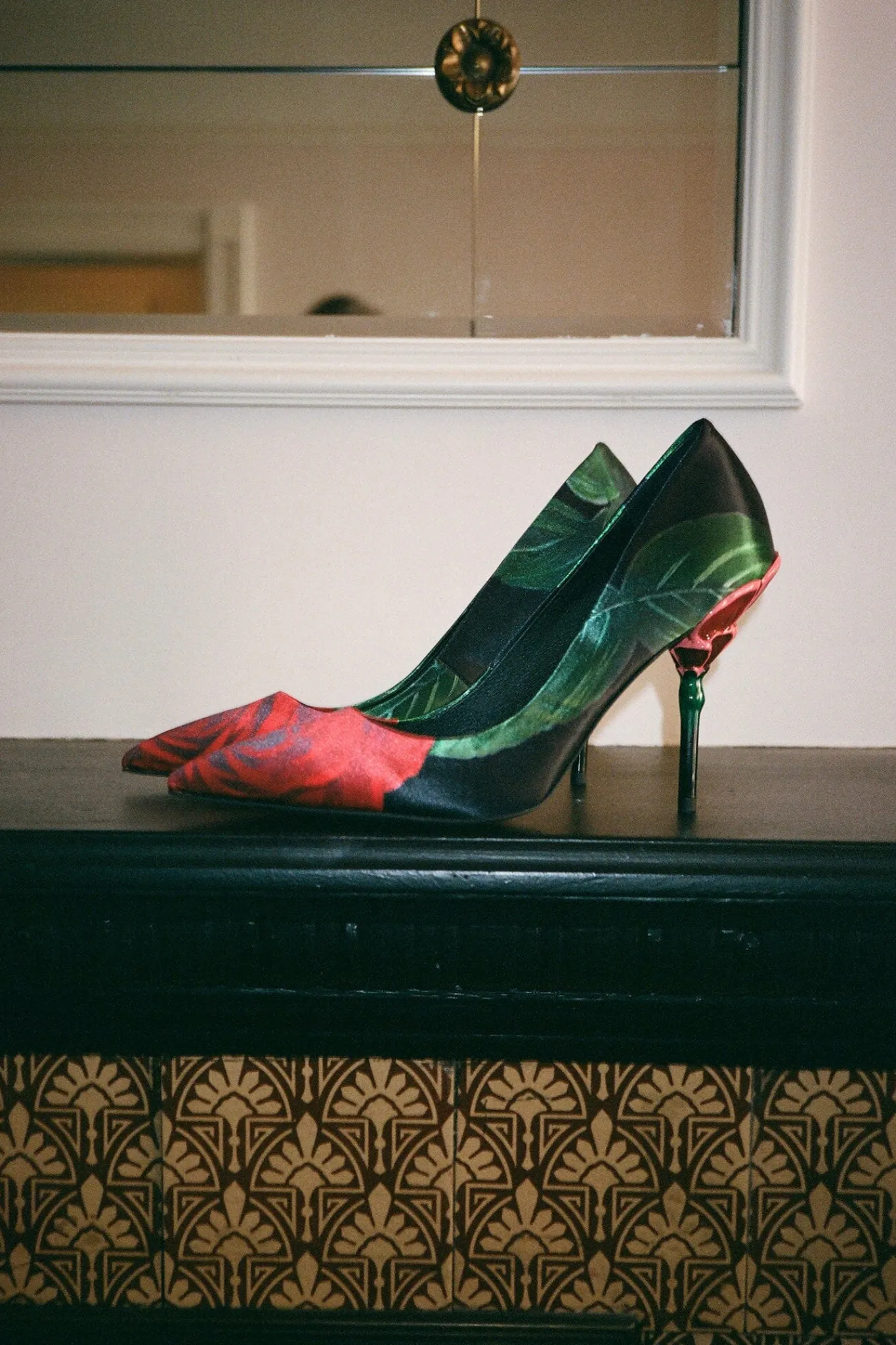 Pointed-toe pump with floral heel detailFits true to sizeMeasurements taken from a size 7 4″ Heel, 0.25″ PlatformFabric…