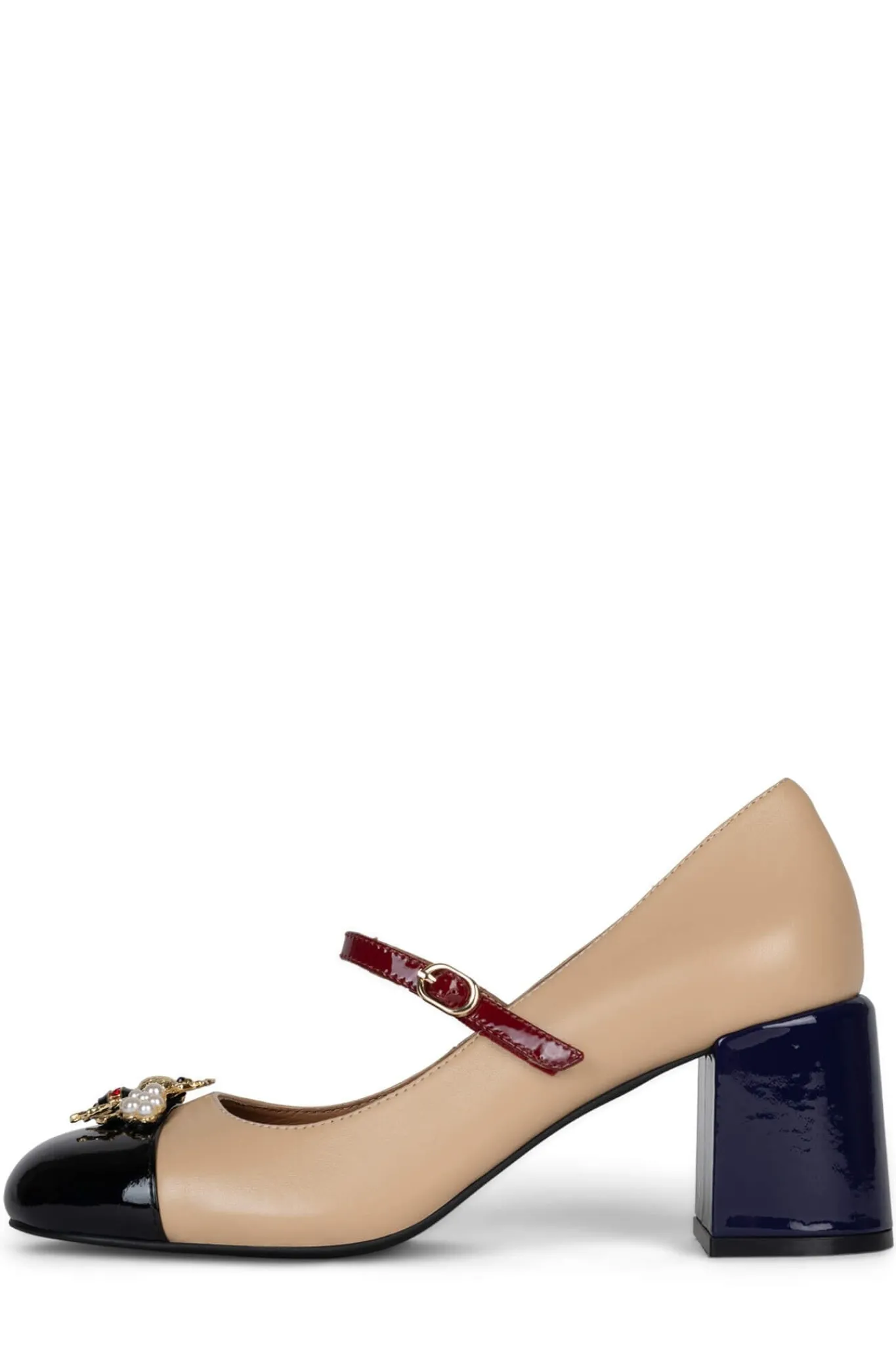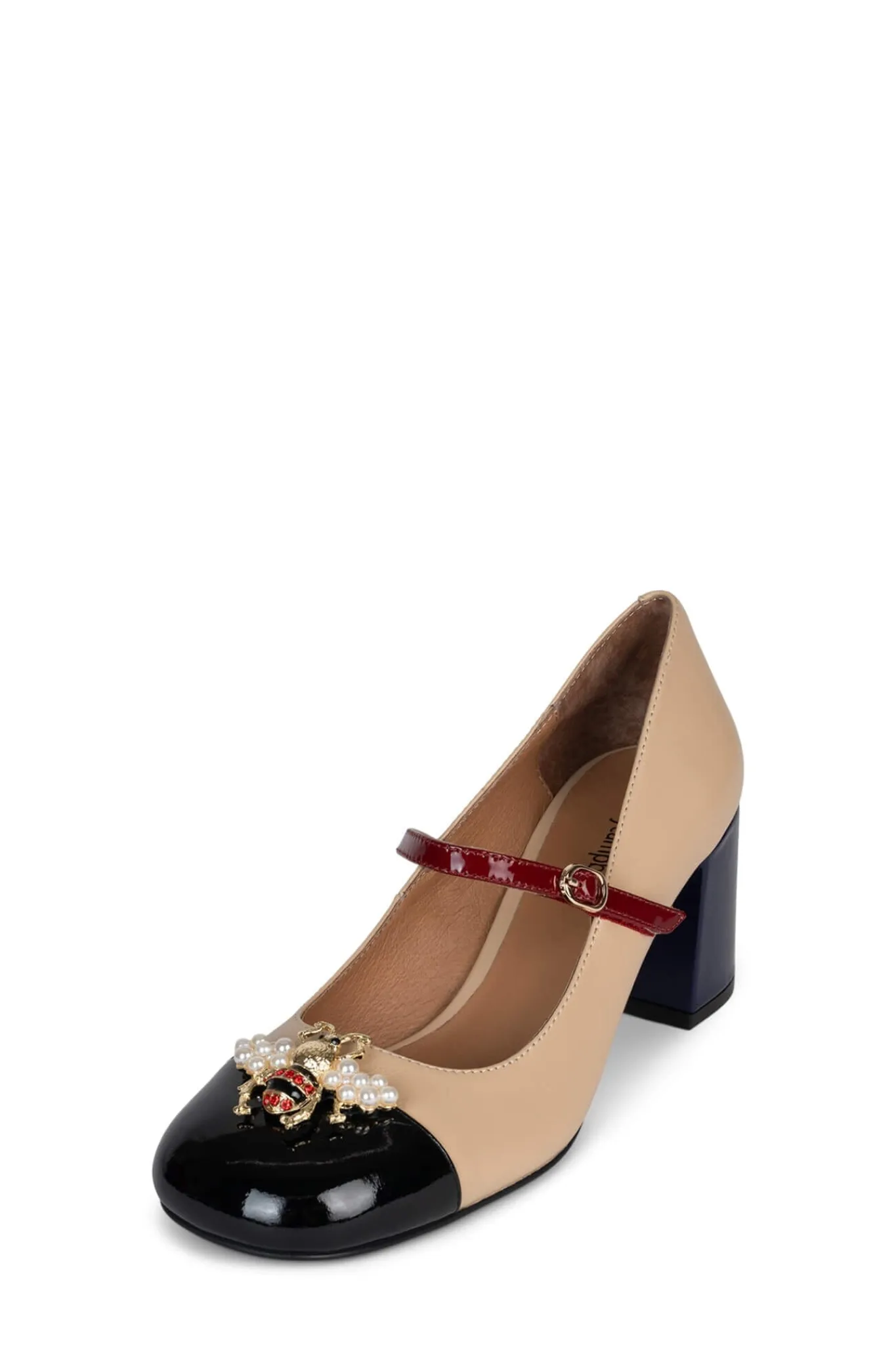 Block-heeled Mary-Jane pump with color-block & embellished beetle detailFits half size big. Order next half size dow…