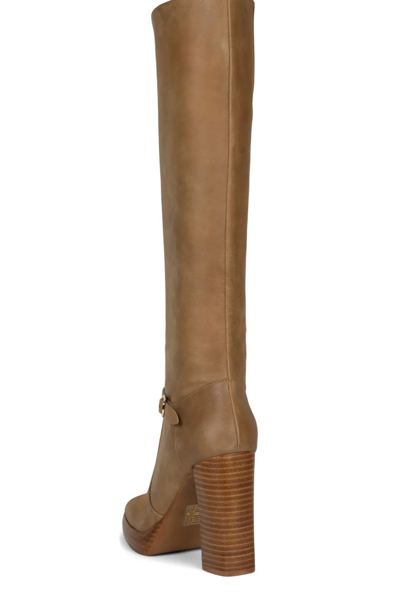 Knee-high heeled boot with buckle detailFits true to sizeMeasurements taken from a size 7 4″ Heel, 1″ Platform14.5″ Sha…