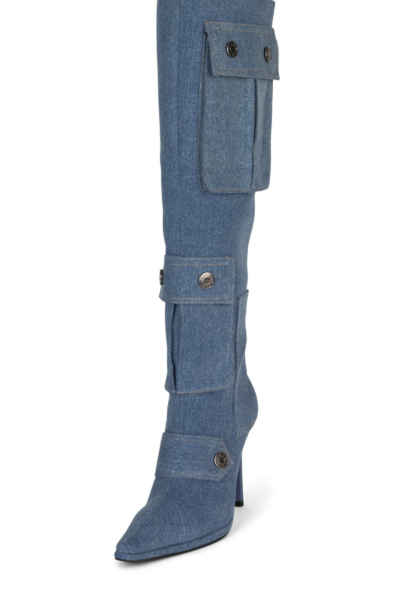 Cargo stiletto knee-high boots with pocketsFits true to sizeMeasurements taken from a size 7 4.25″ Heel, .25″ Platform1…