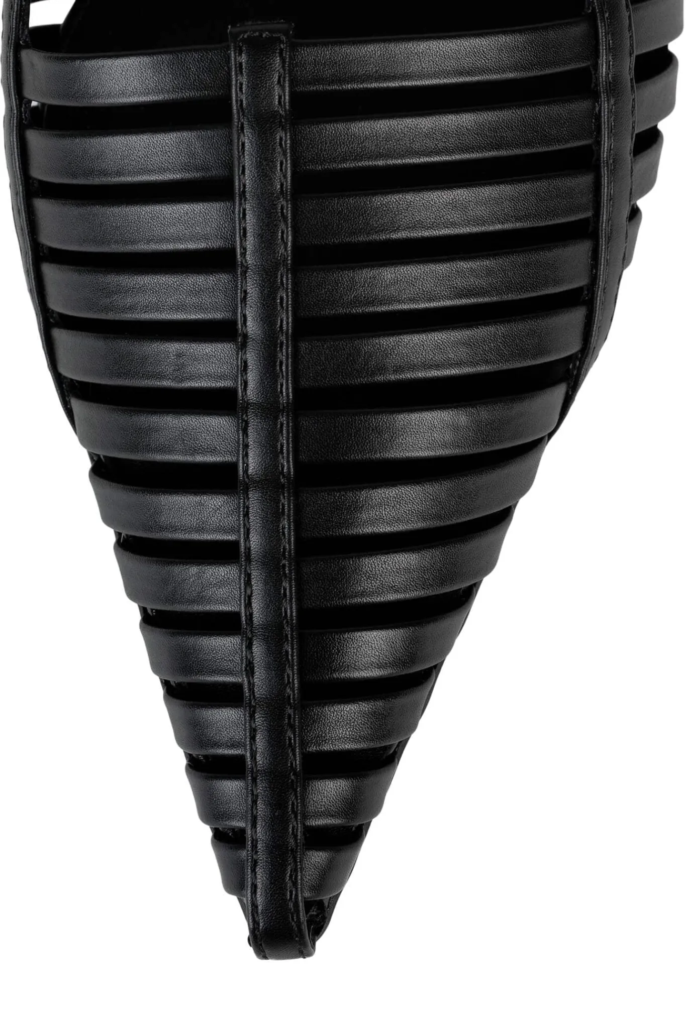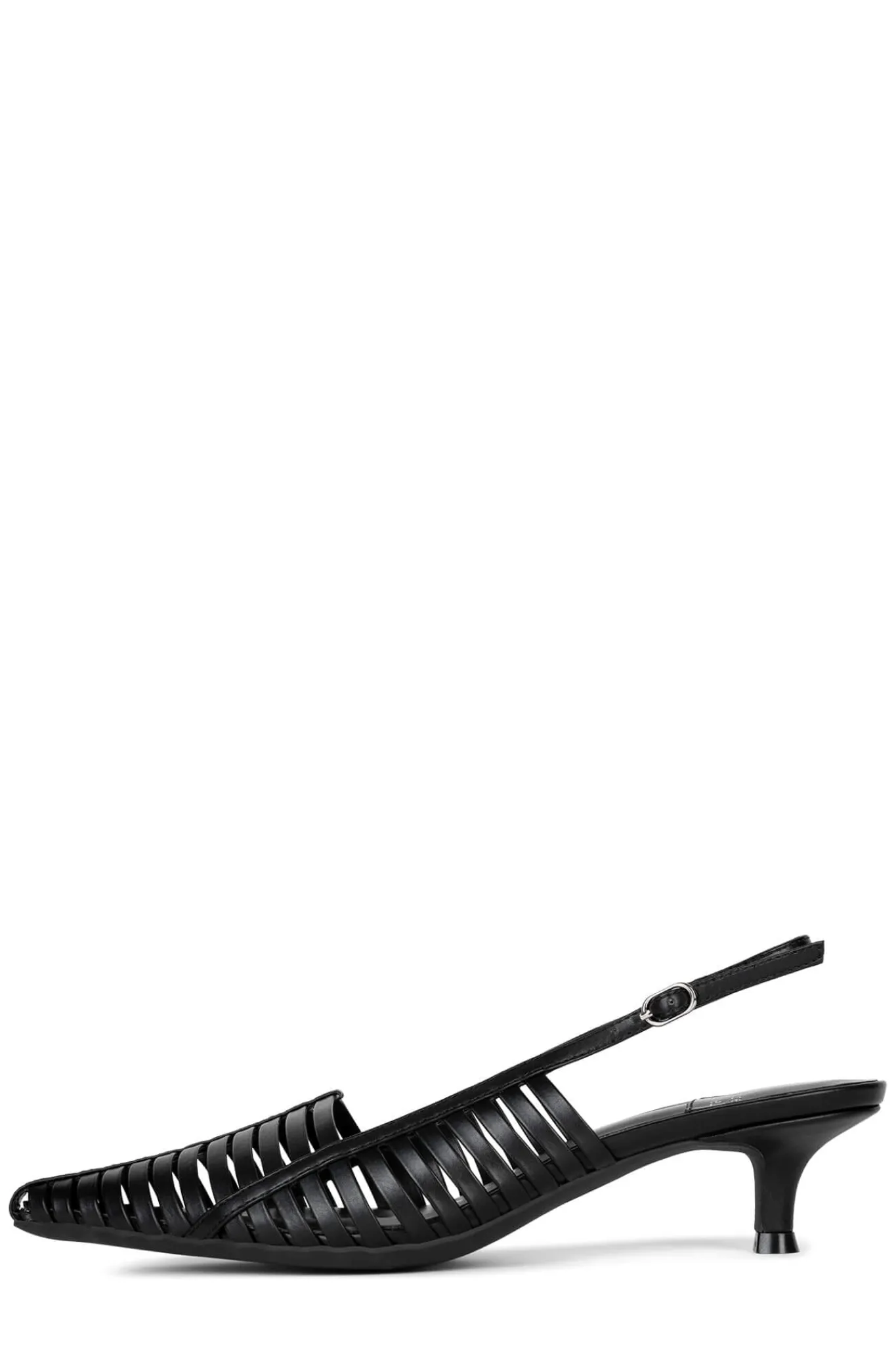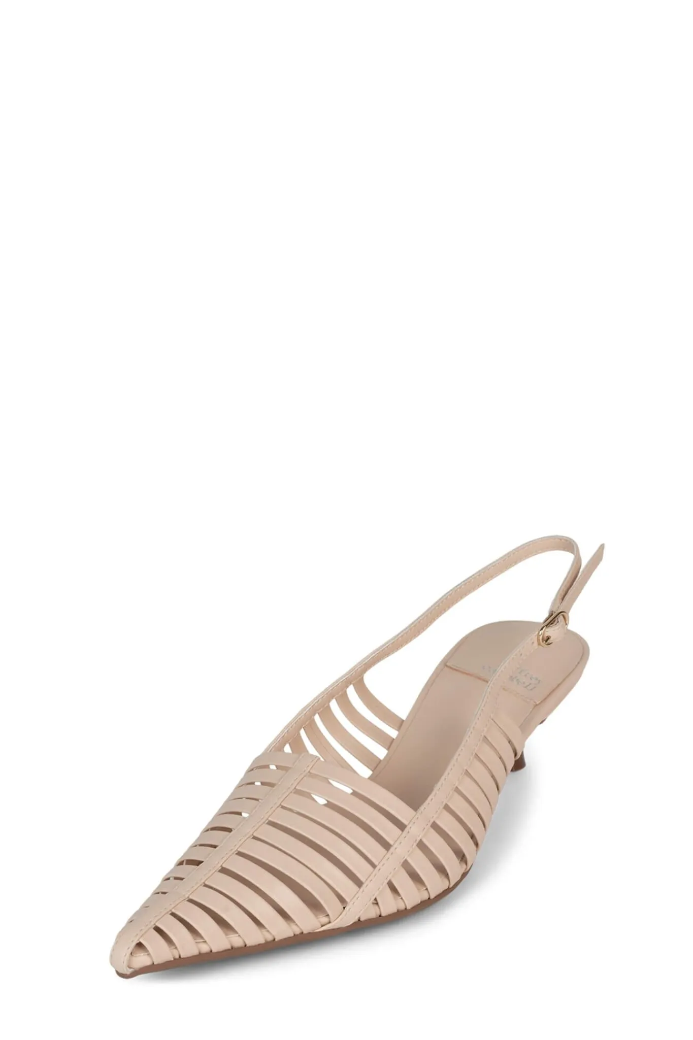 Pointed toe kitten heel multi-strapped slingback.
