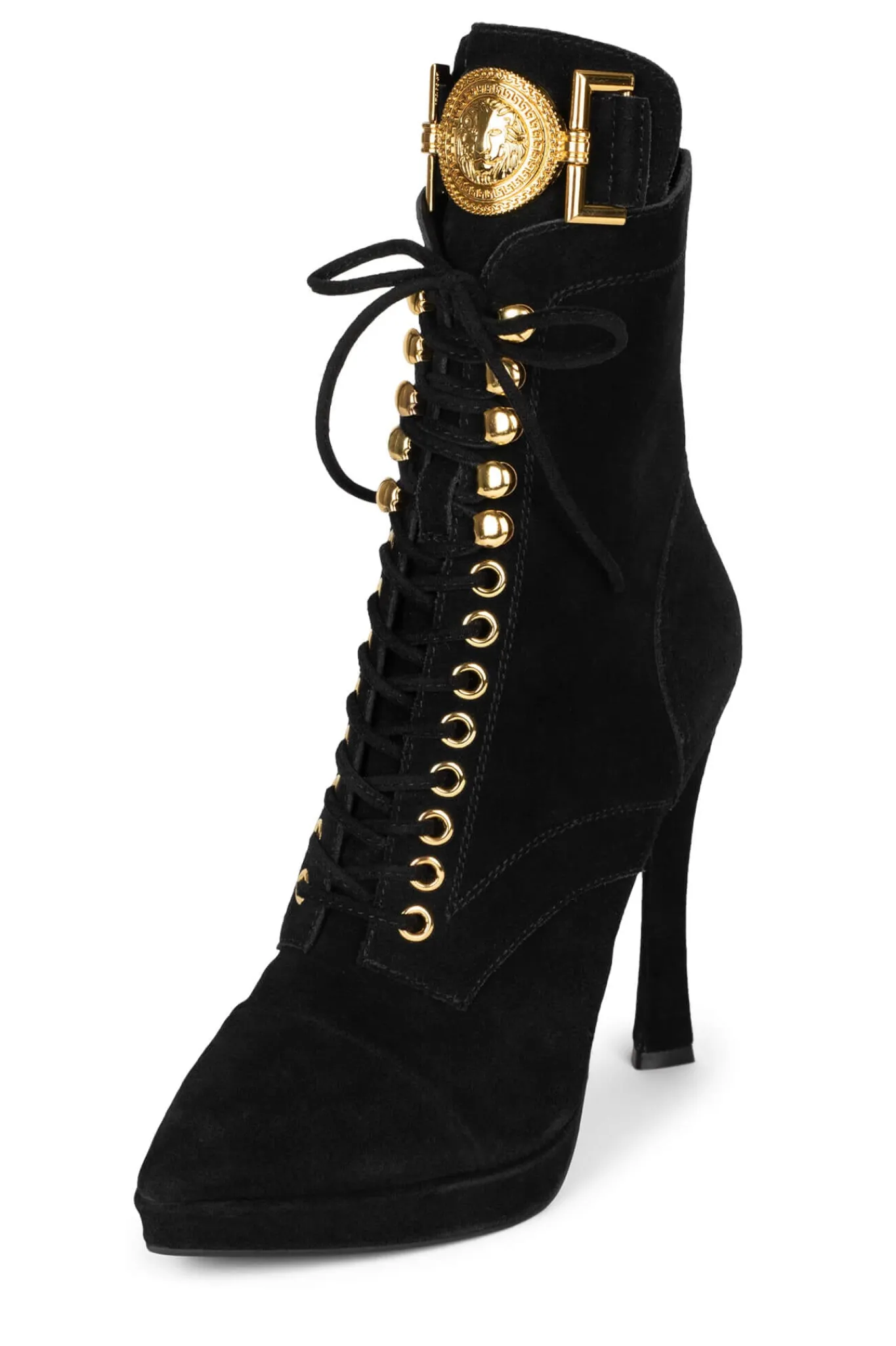 Lace-up heeled boot with gold lion emblemFits true to sizeMeasurements taken from a size 75″ Heel, 0.75″ Platform 5.5″ …