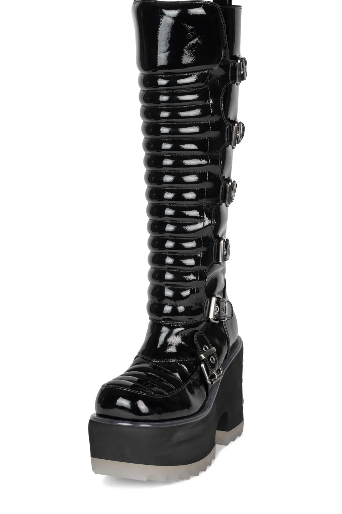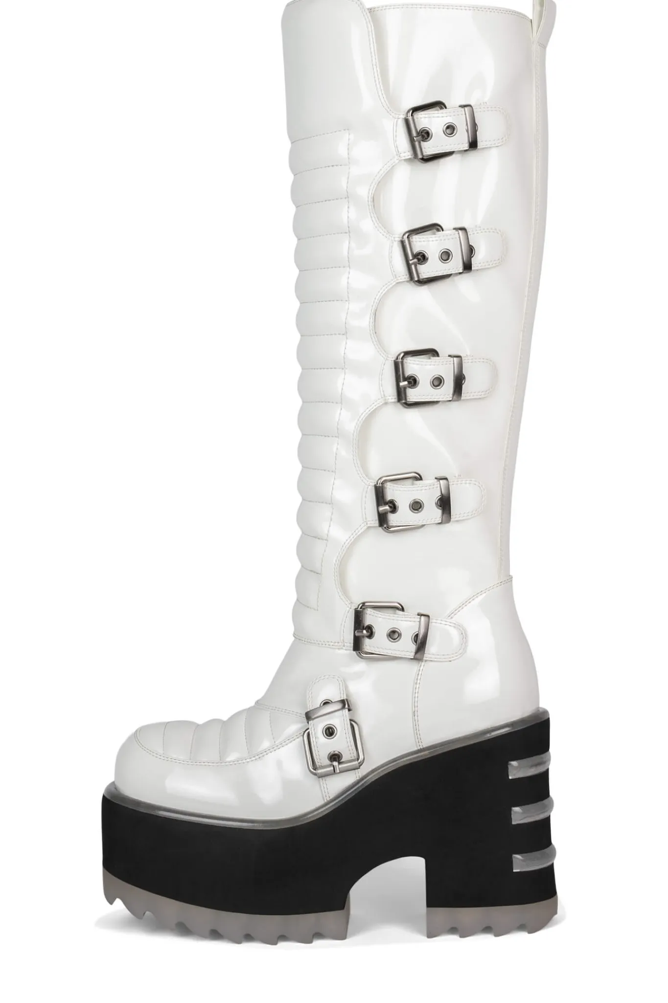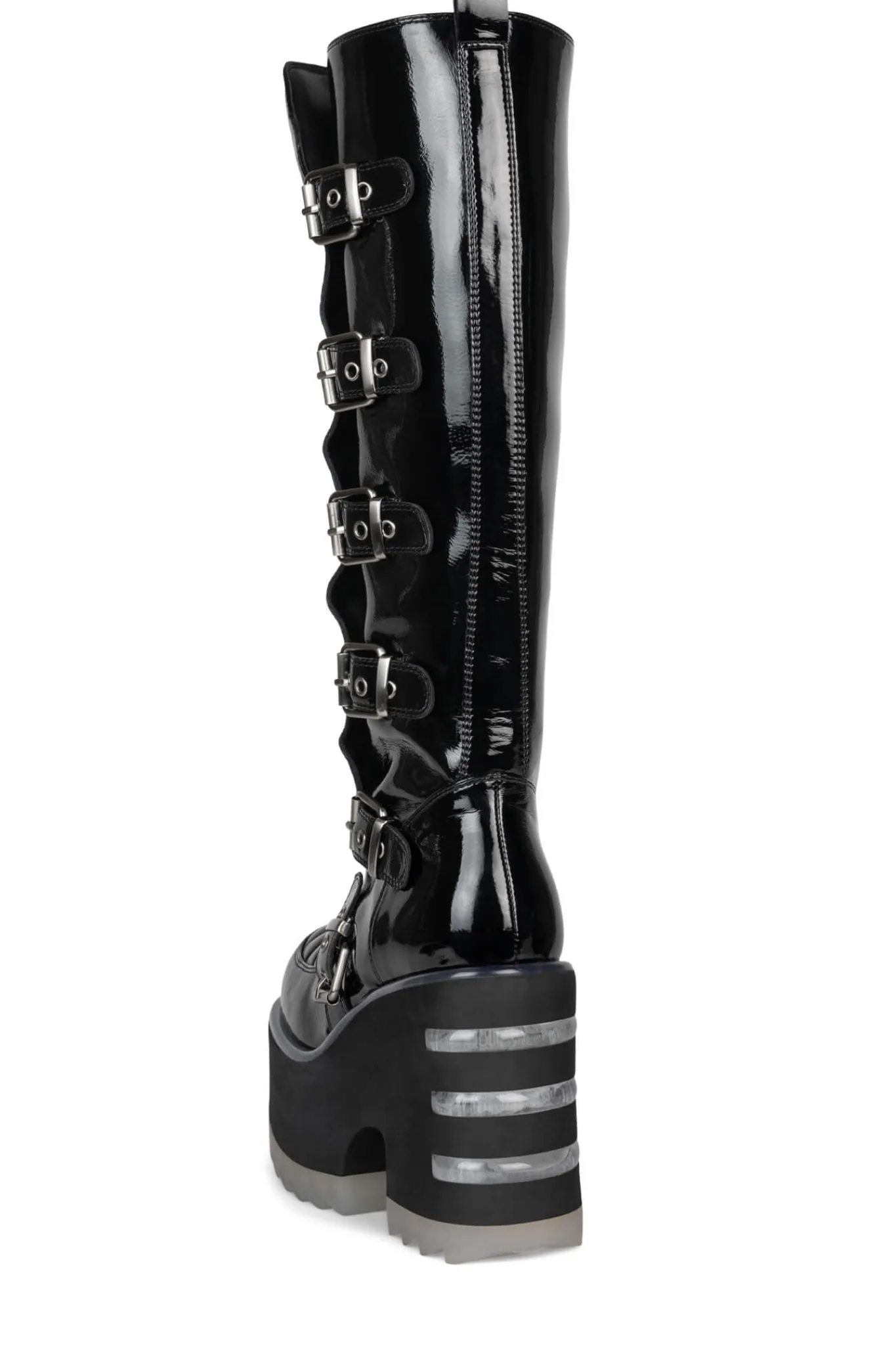 Knee-high moto boot with 90s rave-inspired clear tooth treaded sole
