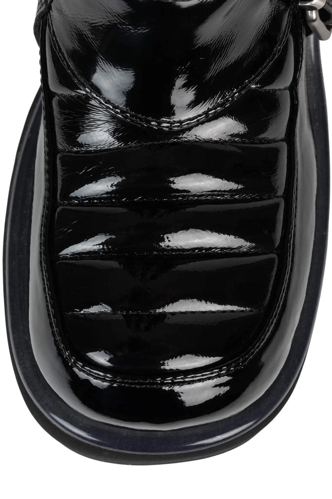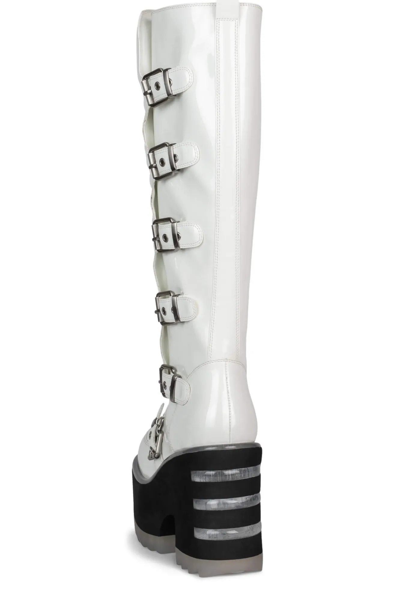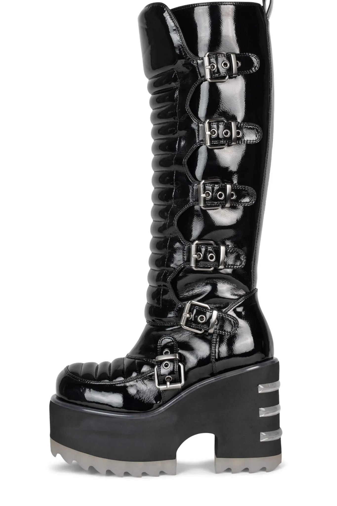 Knee-high moto boot with 90s rave-inspired clear tooth treaded sole