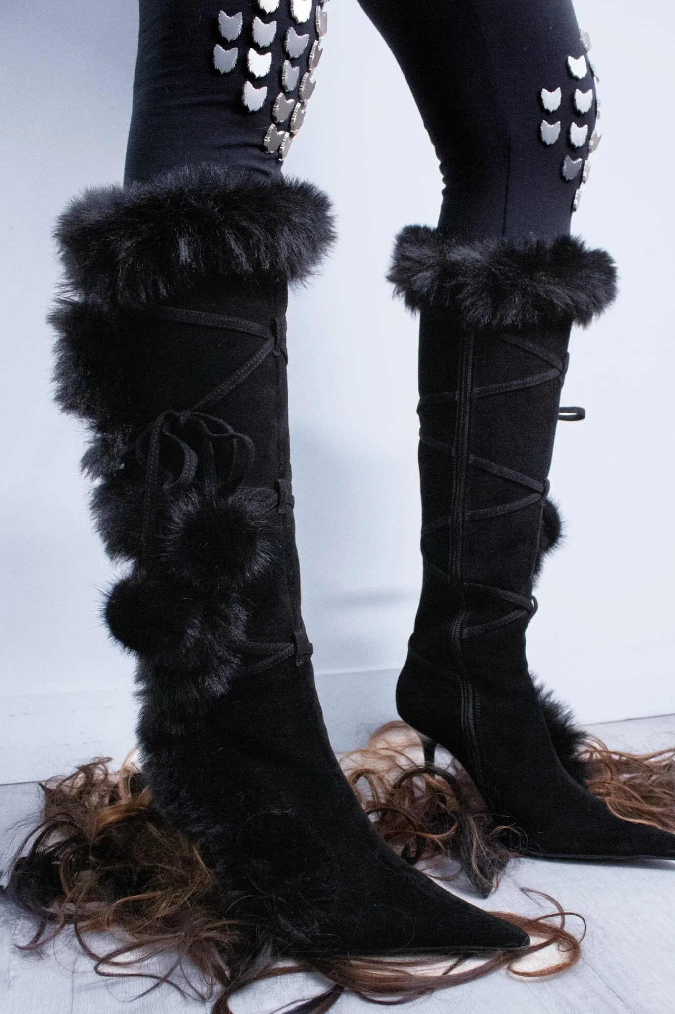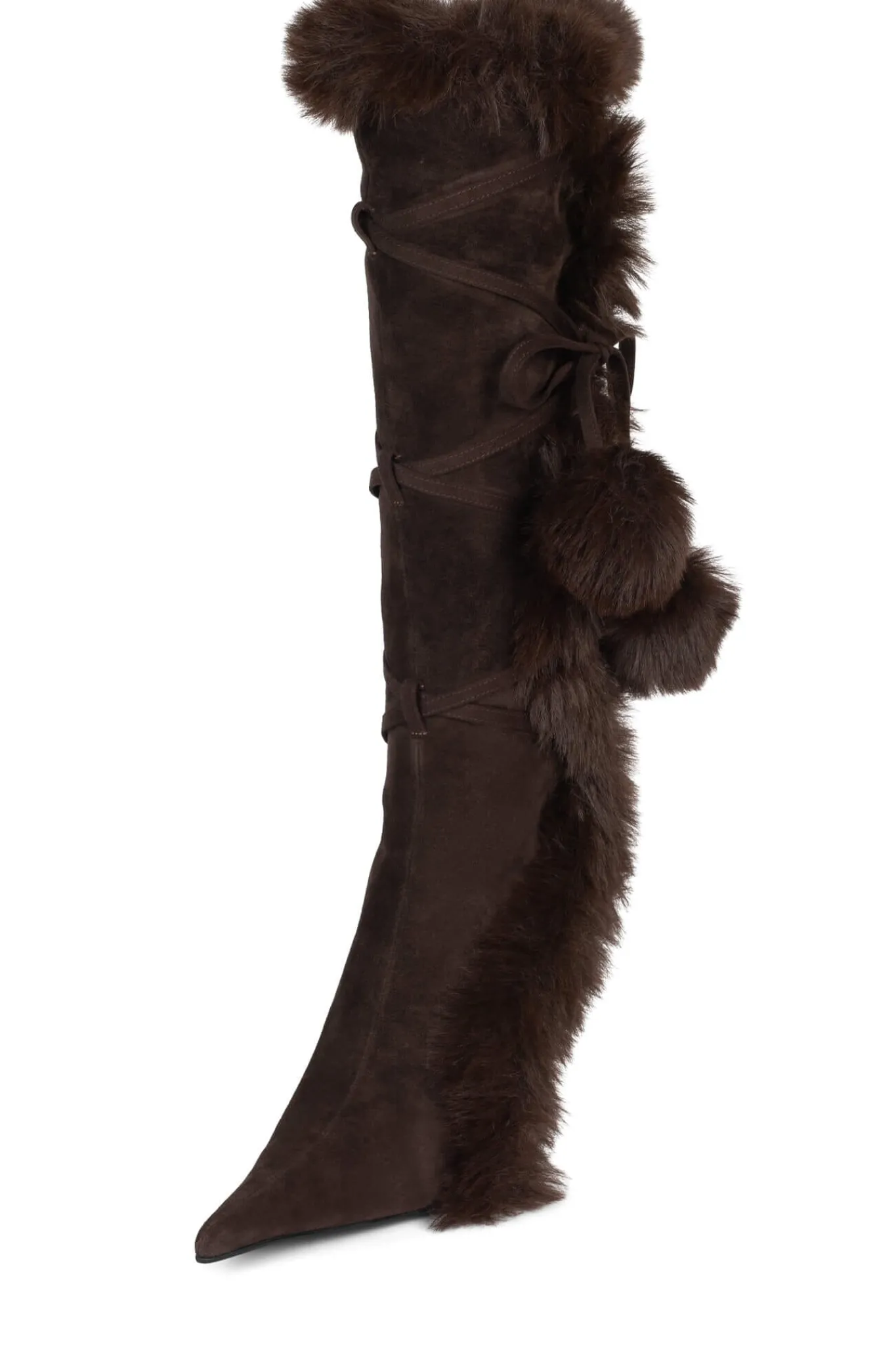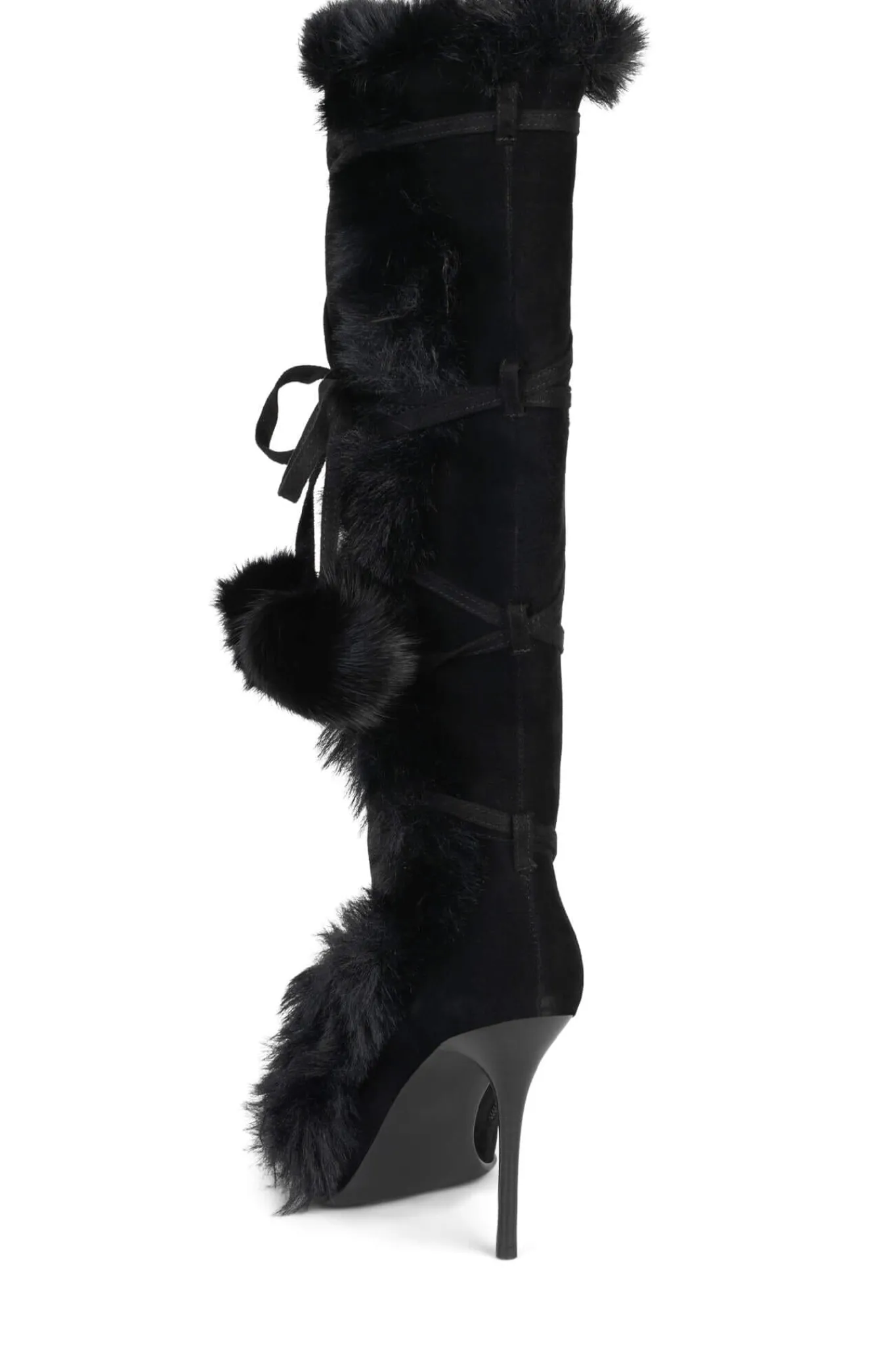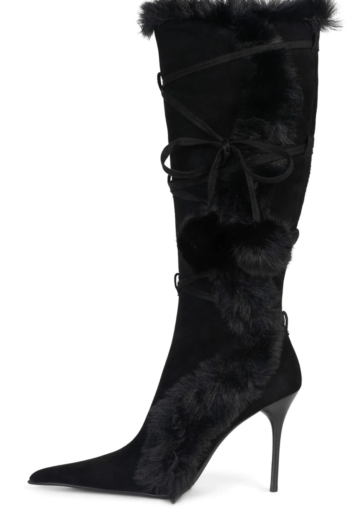 Pointed-toe stiletto knee-high boot with faux-fur and wrap-around detail