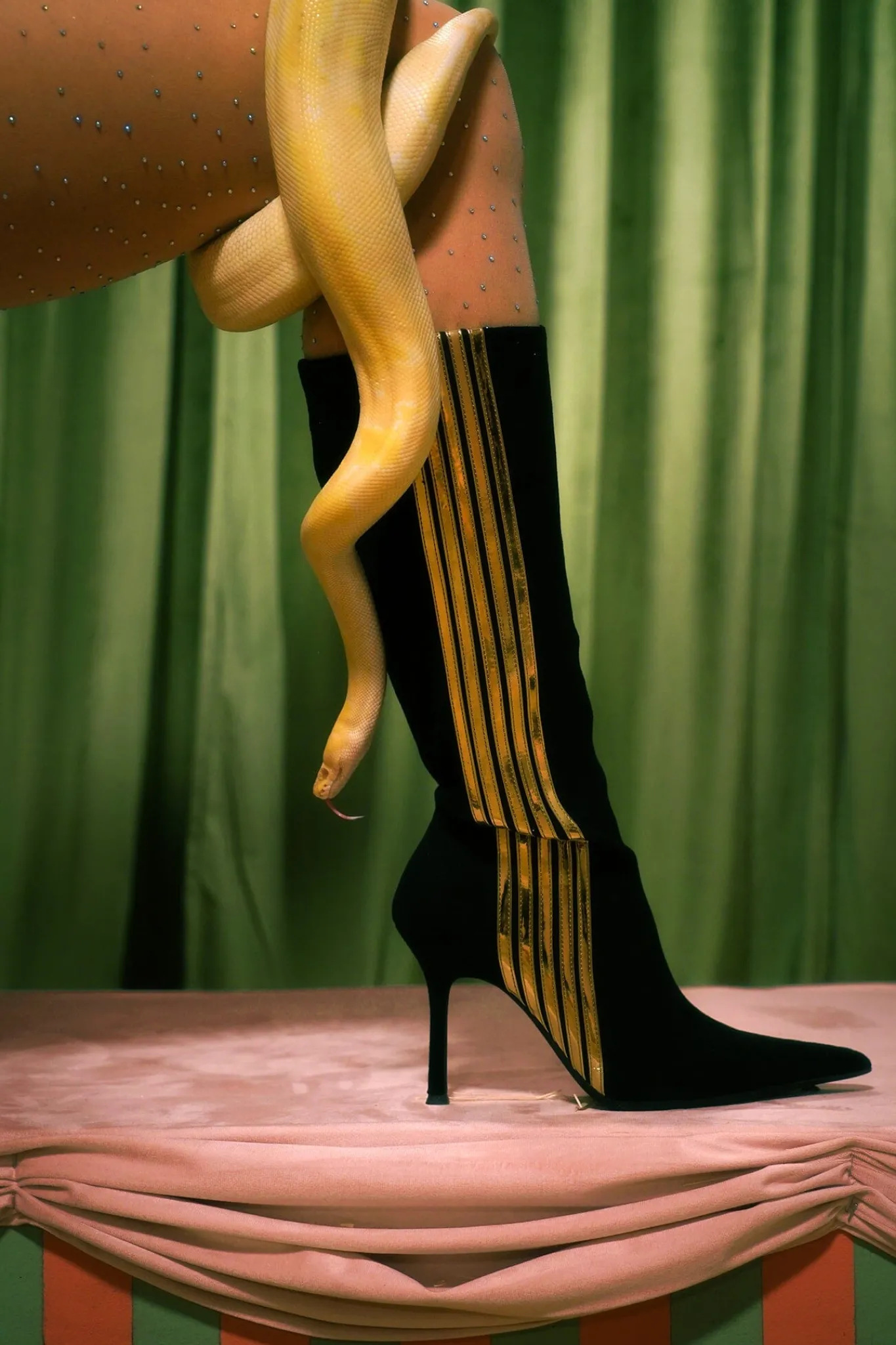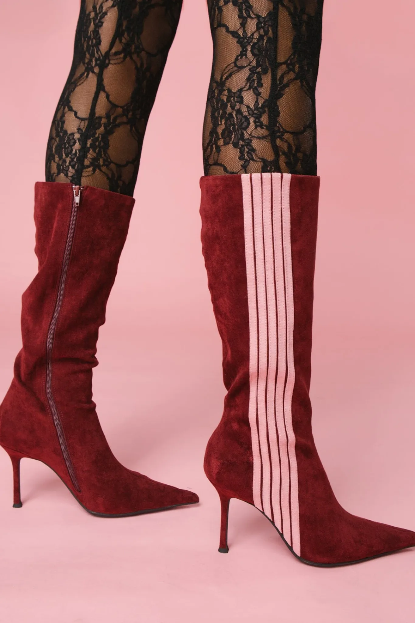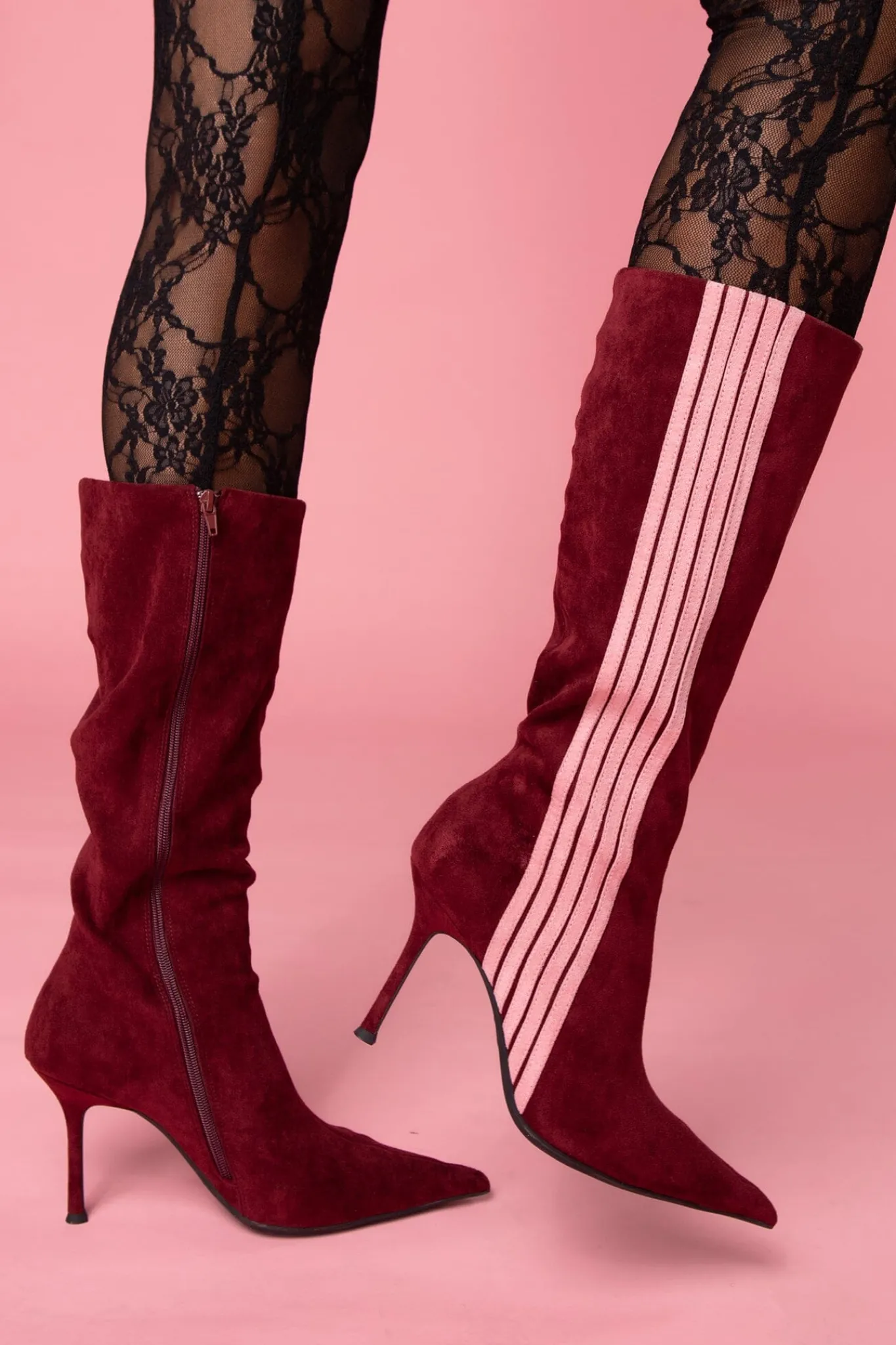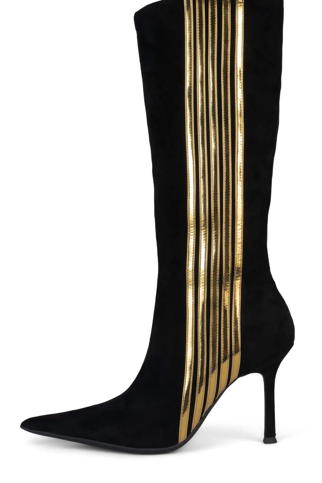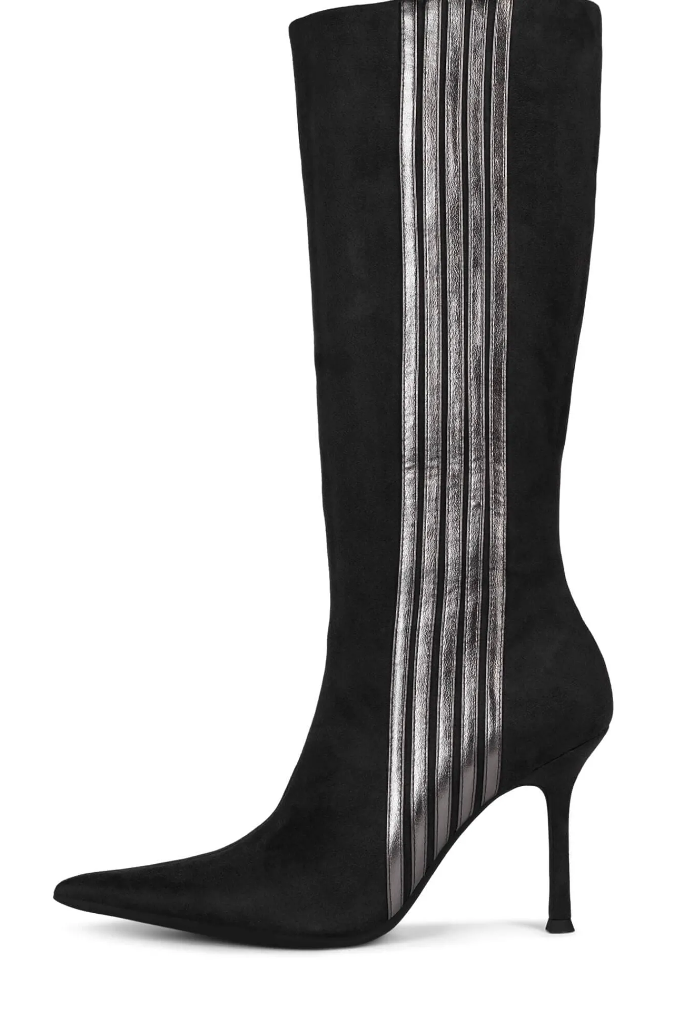 Pointed-toe knee-high stiletto boot with contrasting stripe detail