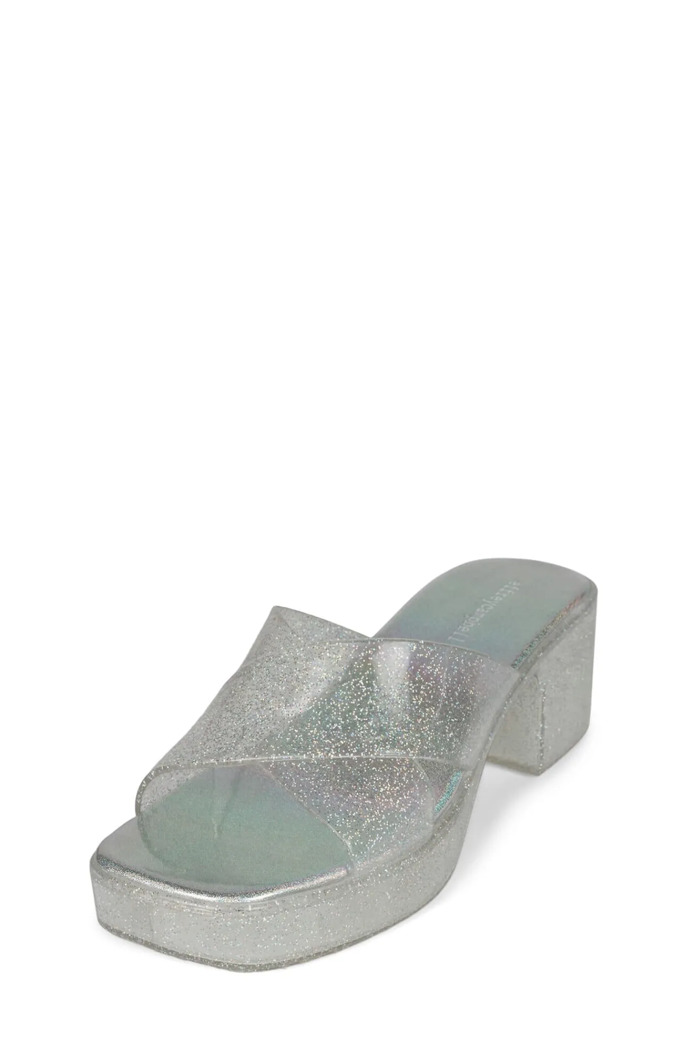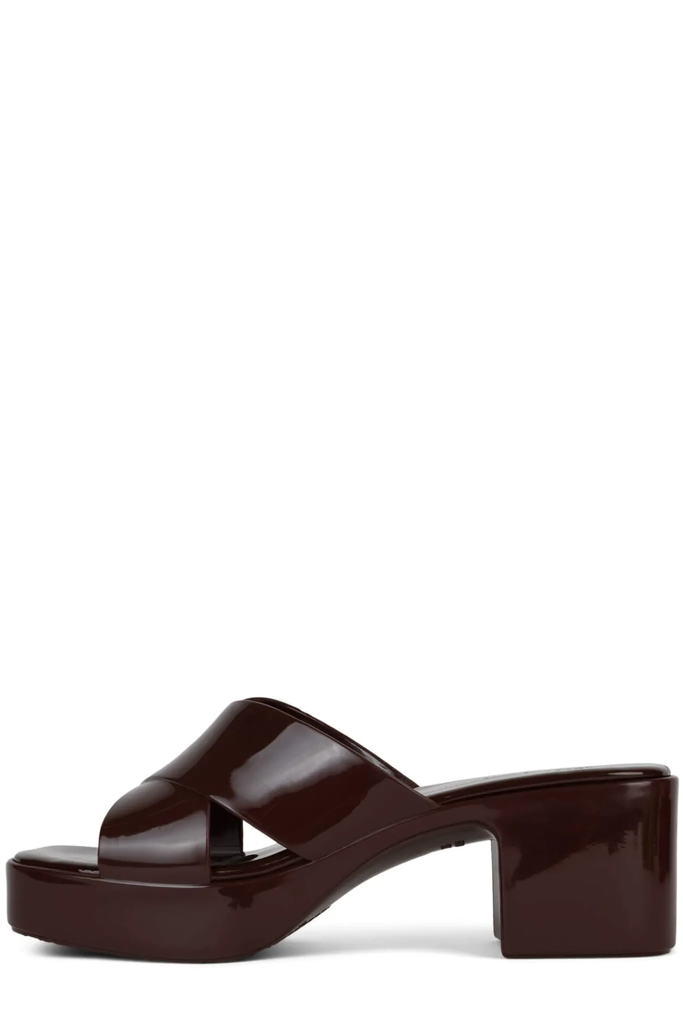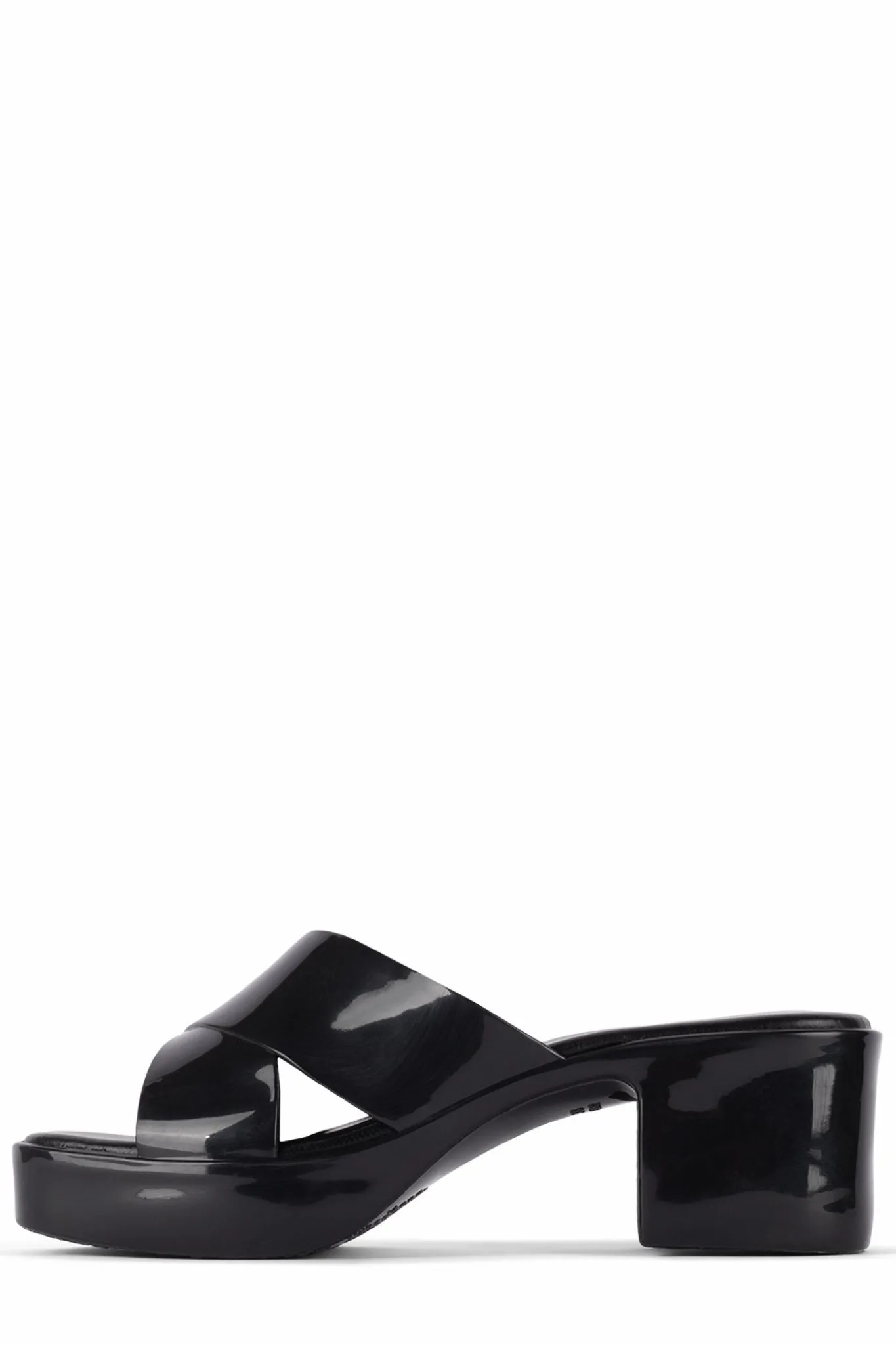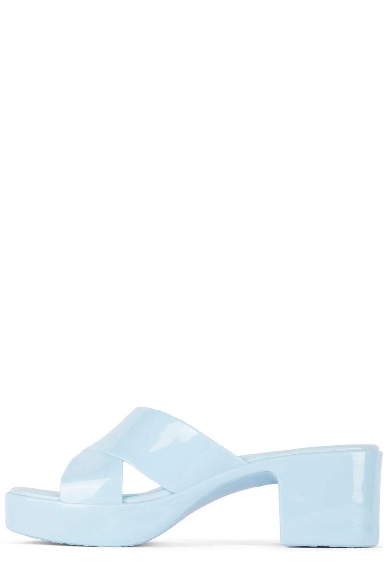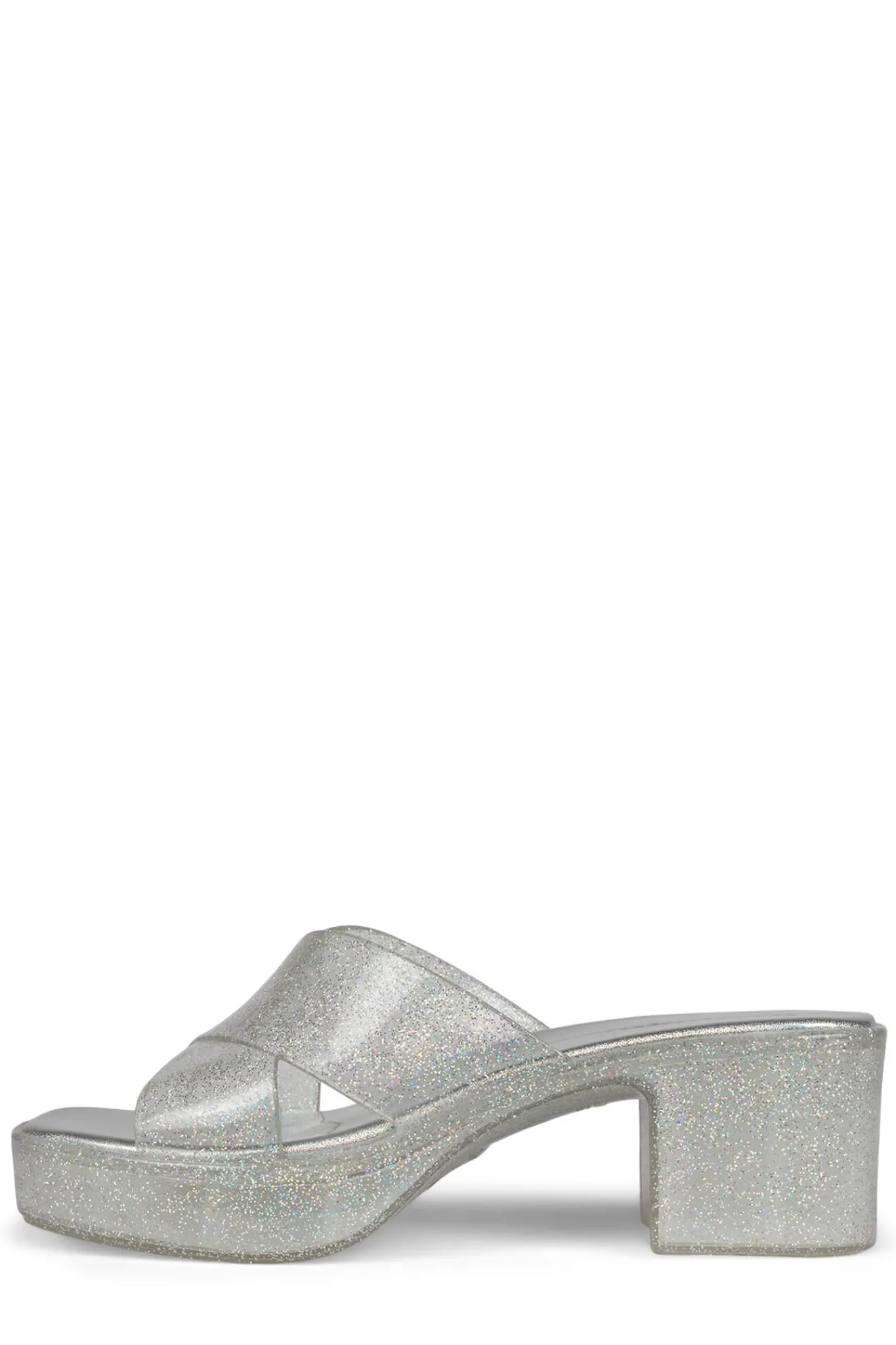 Square toe platform jelly sandal with cross band straps.