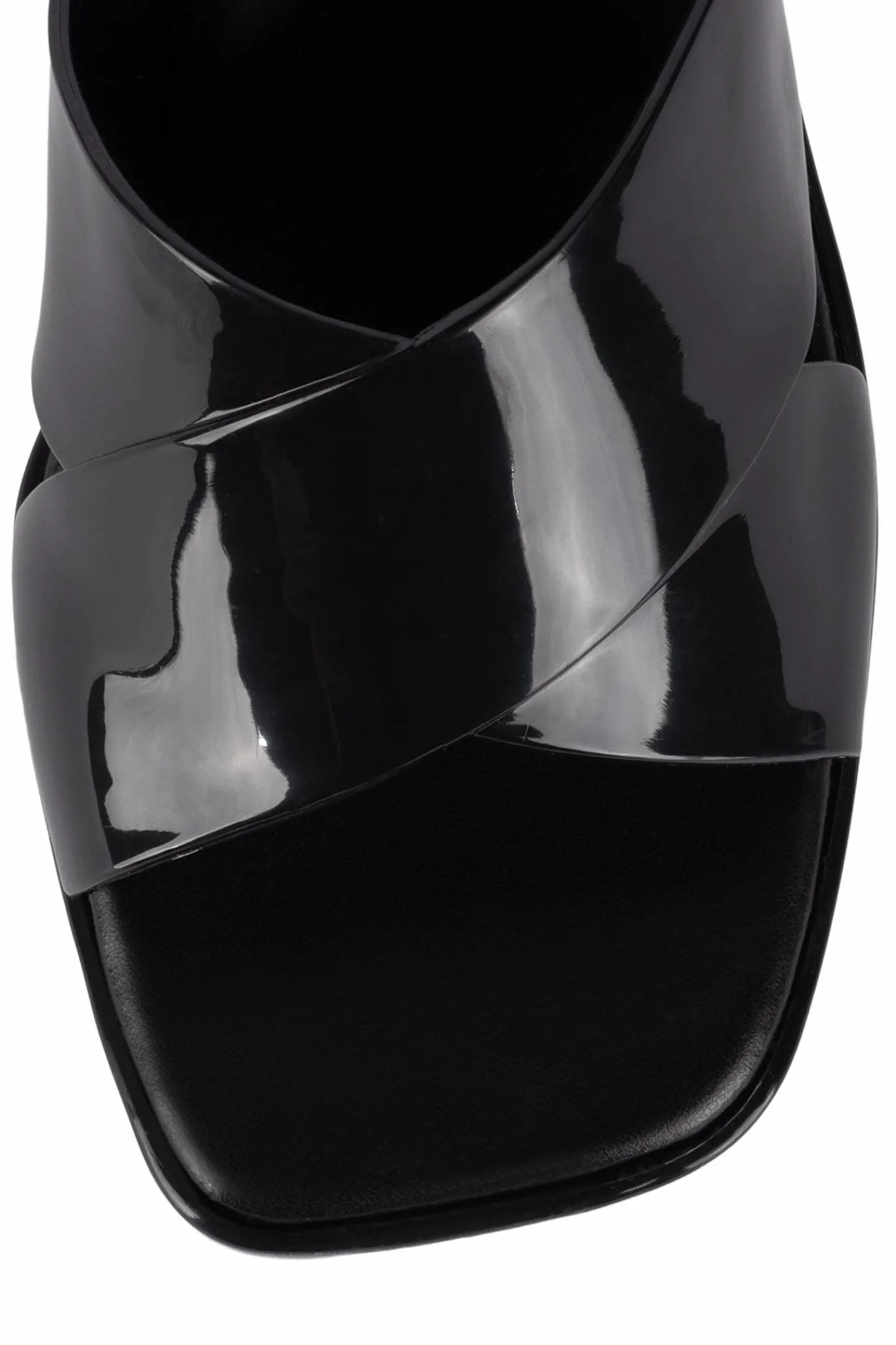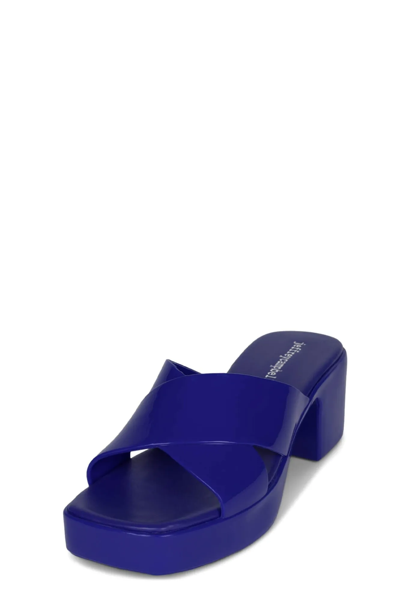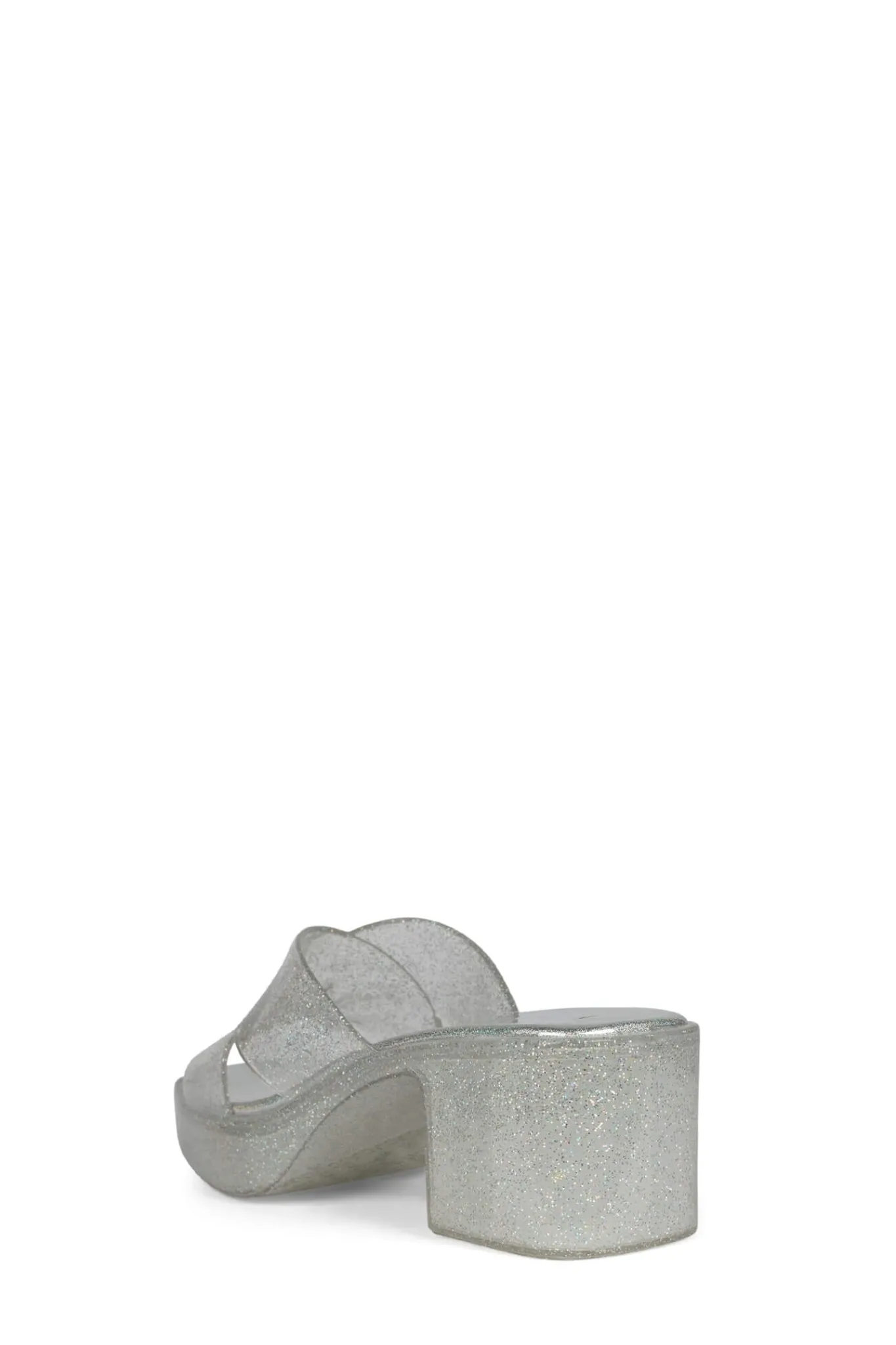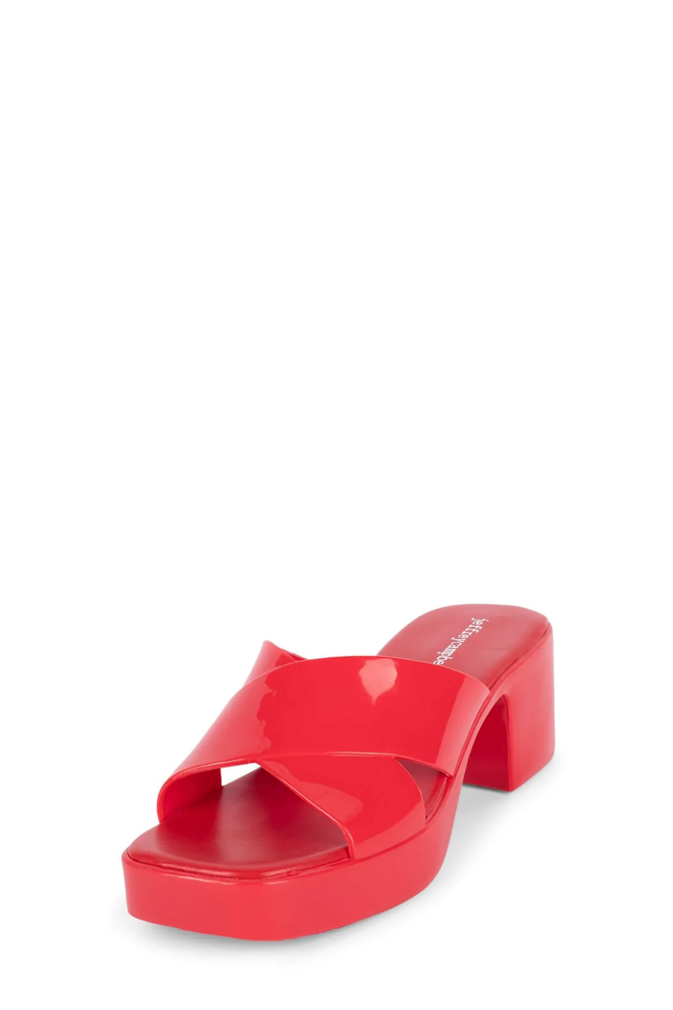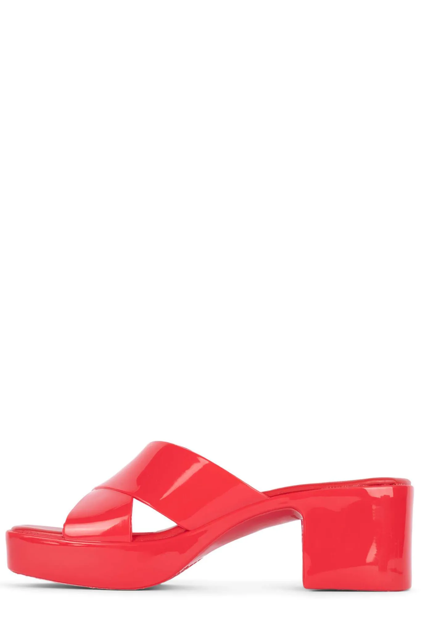 Square toe platform jelly sandal with cross band straps.
