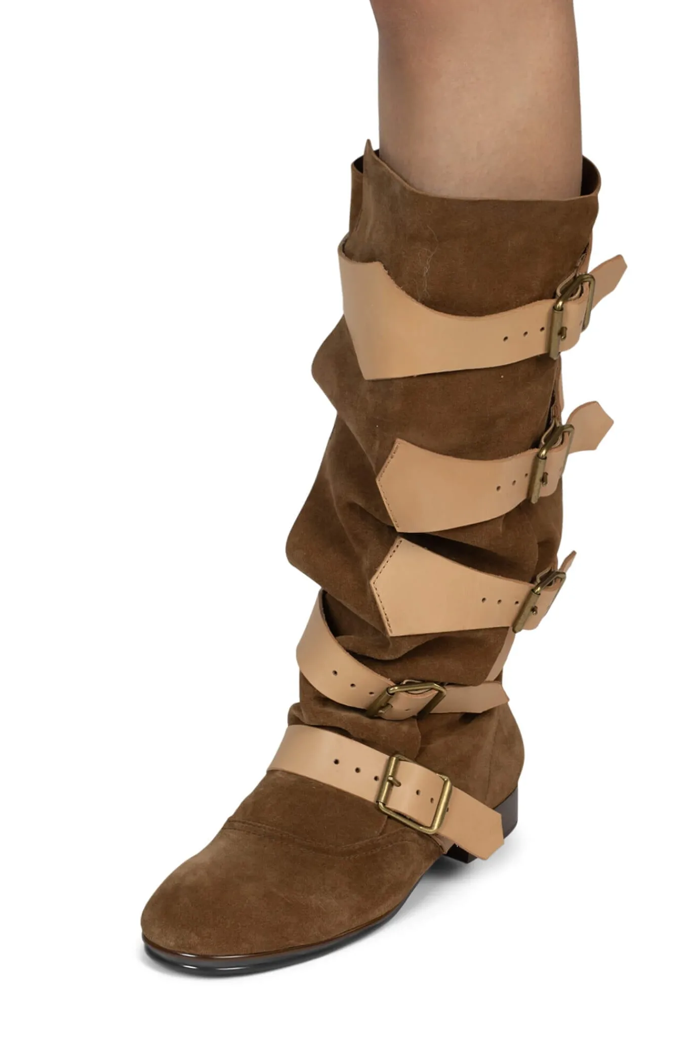 Slouch knee-high riding boot with multi-buckle strapsFits true to sizeMeasurements taken from size 7 1″ Heel, 0.25″ Pla…