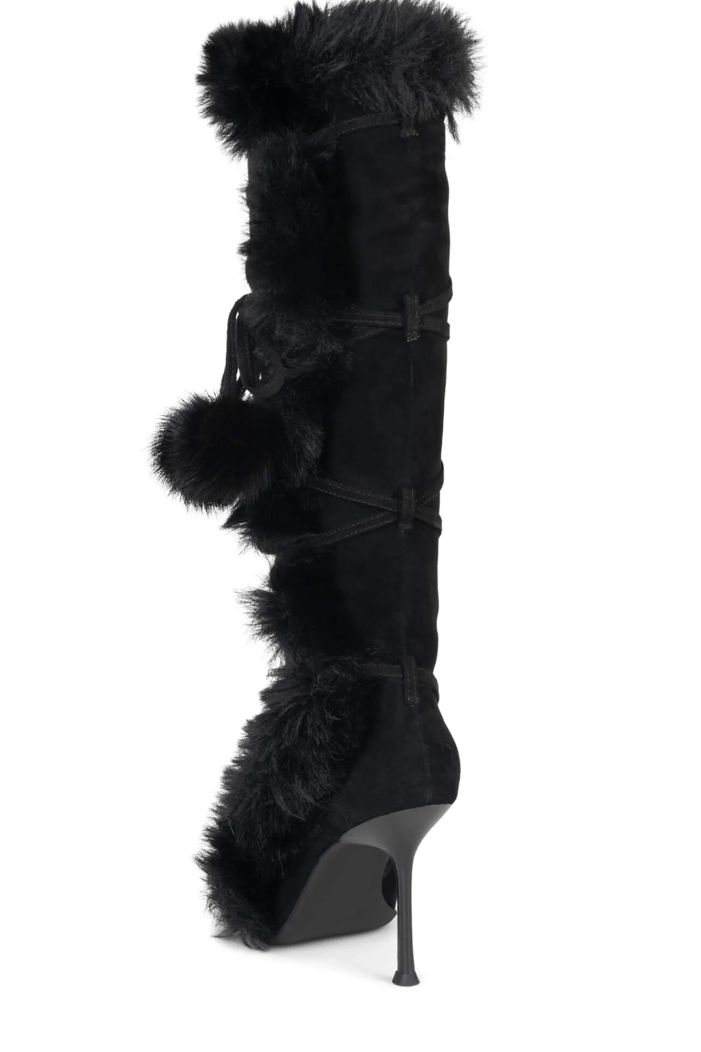 Knee-high stiletto faux-fur boot with wrap-around lace