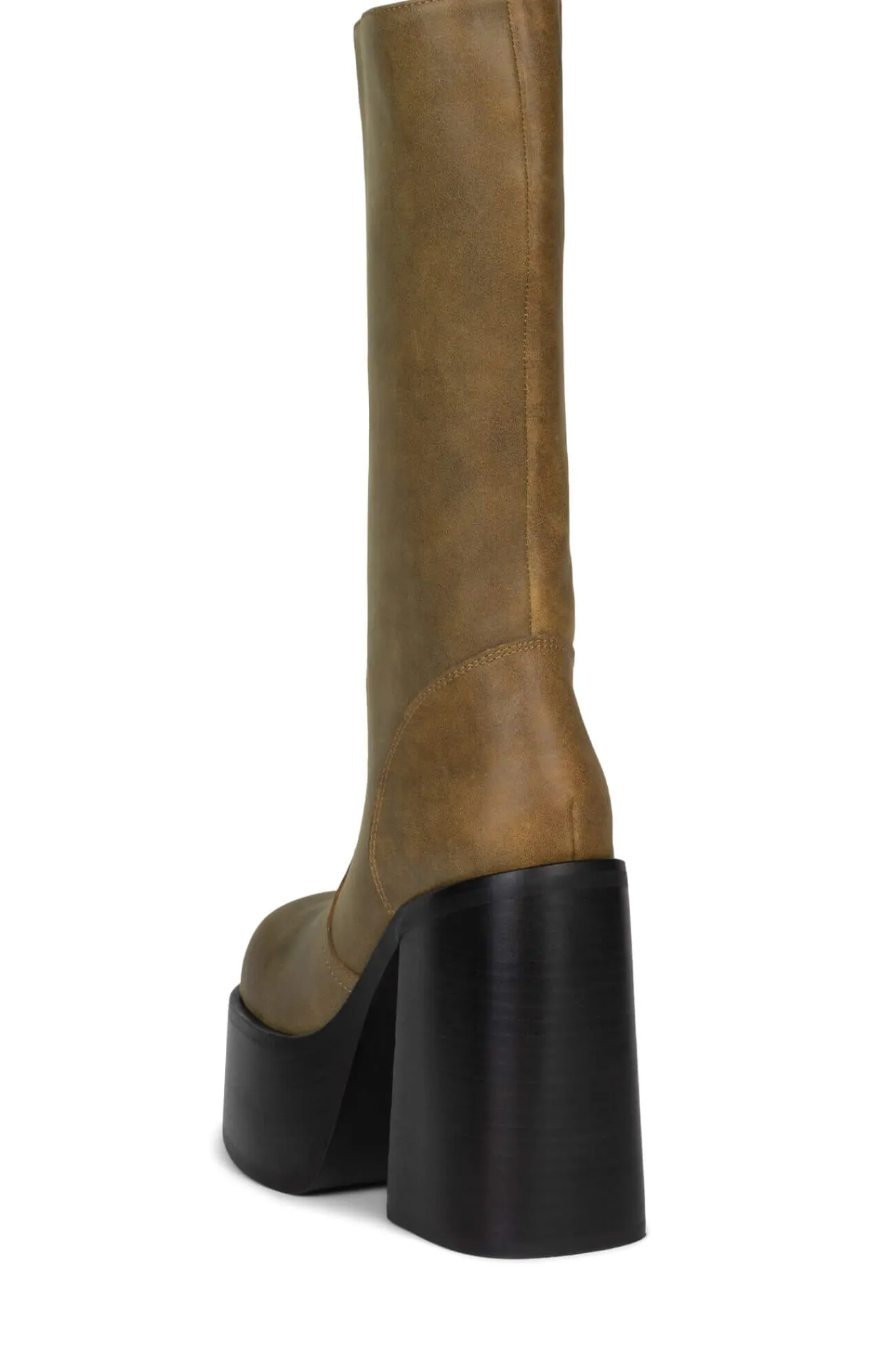 Platform knee-high bootFits true to sizeMeasurements taken from a size 75” heel, 2.25” platform10.5” shaft, 11” leg …