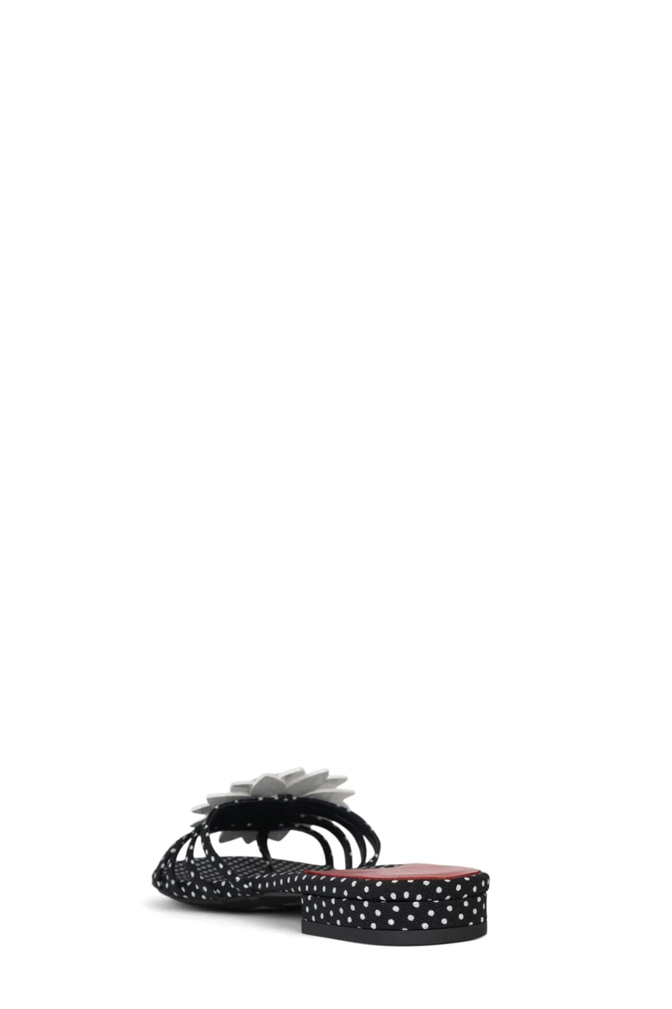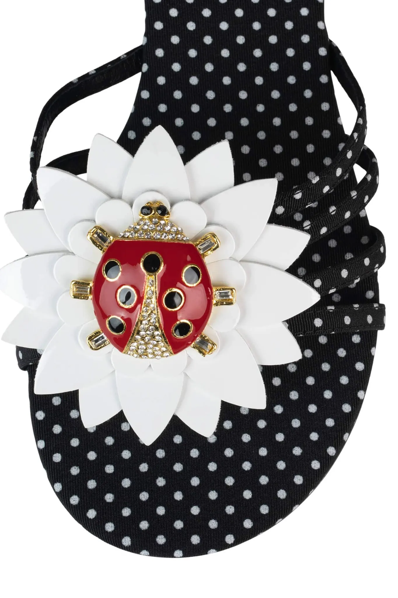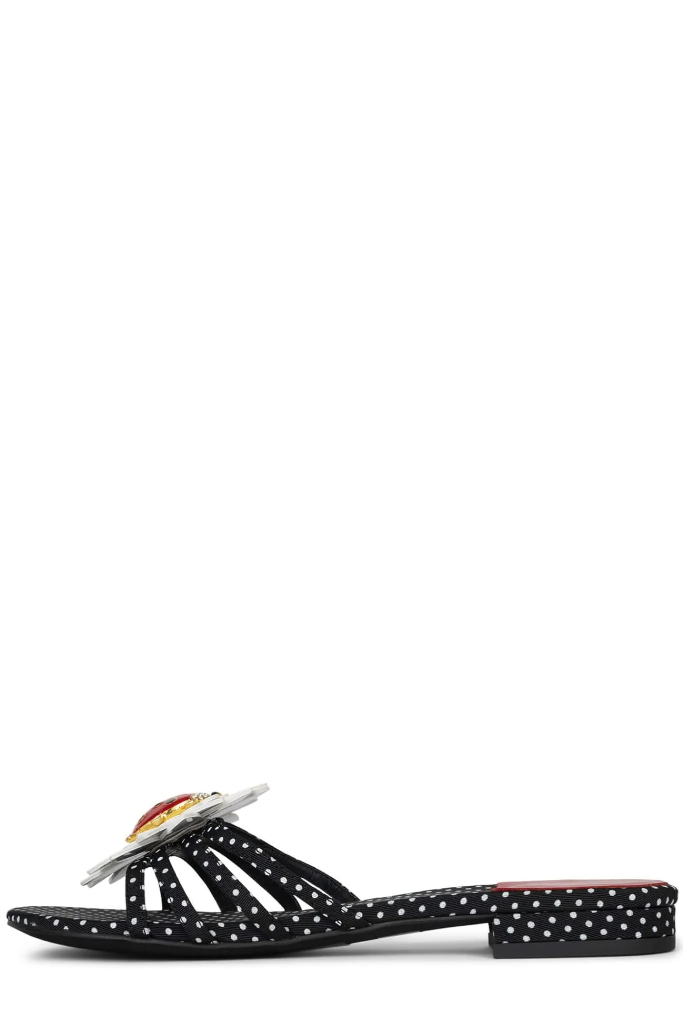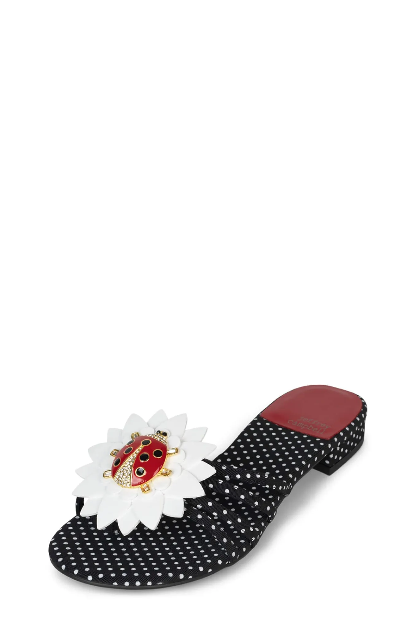 Round-toe, low heel slide with ladybug flower ornament.