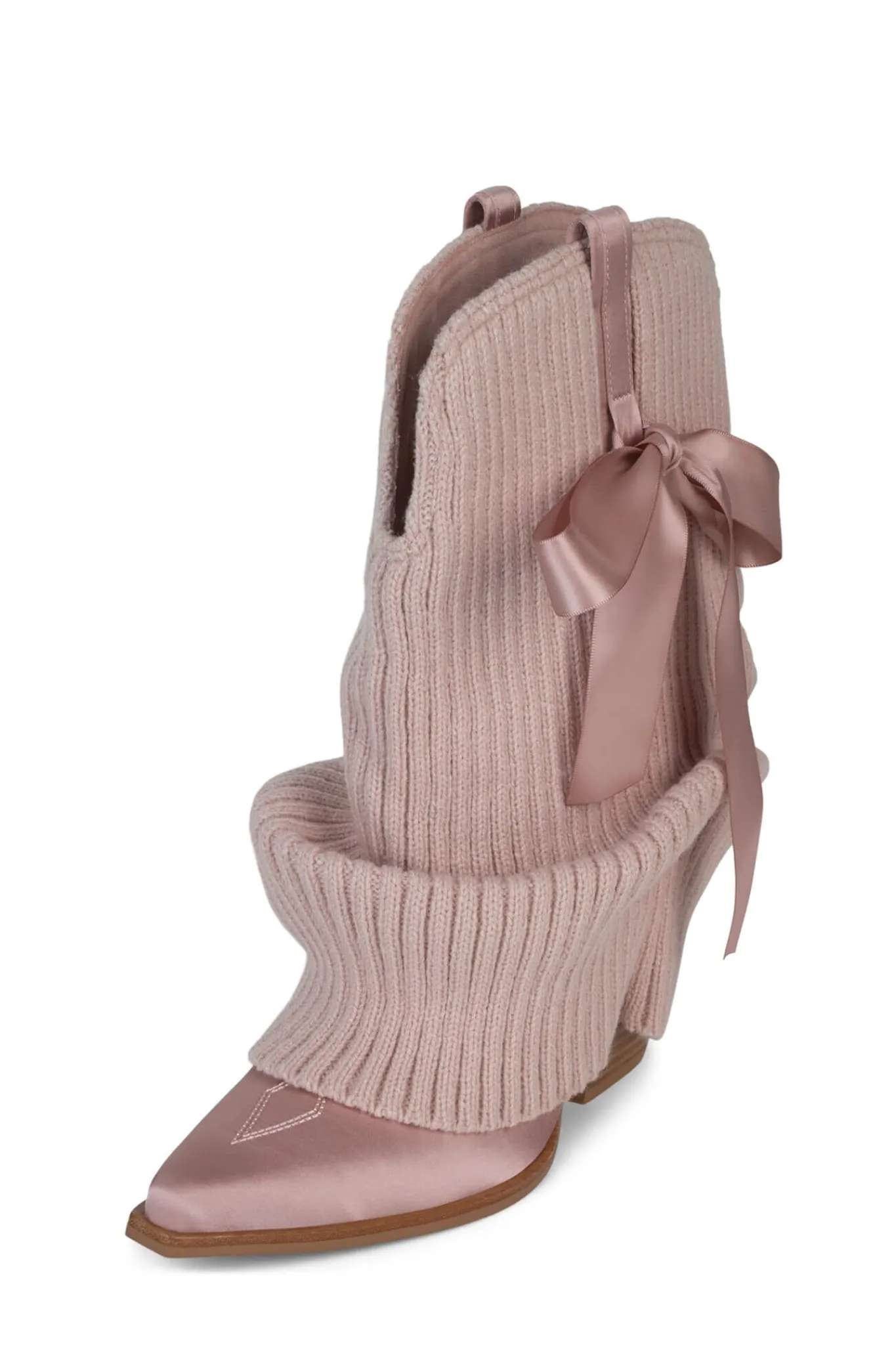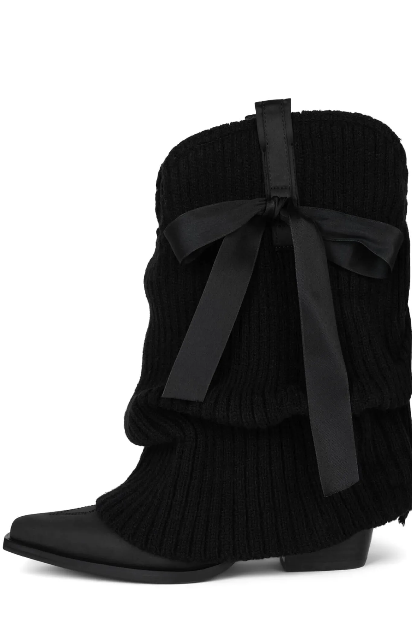 Fit: Over-ankle silhouette, pull-on design Features: Western-inspired, leather boot with ribbed knit foldover cuff, removable bow detail, pull loops for an easy on and off, block heel, pointed toe, durable outsole
