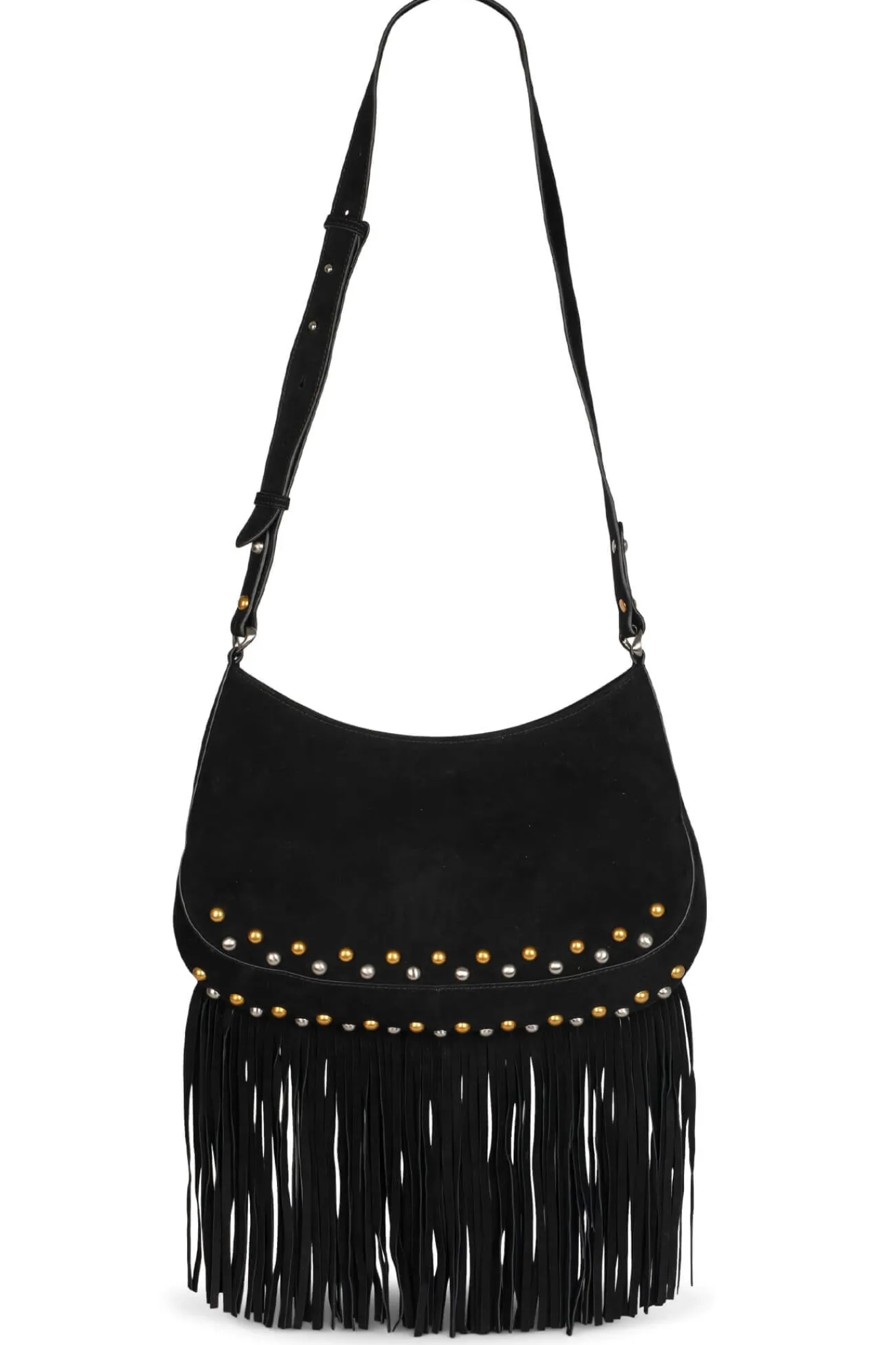 Fringe shoulder bag with adjustable shoulder strap, mixed metallic stud detailing
